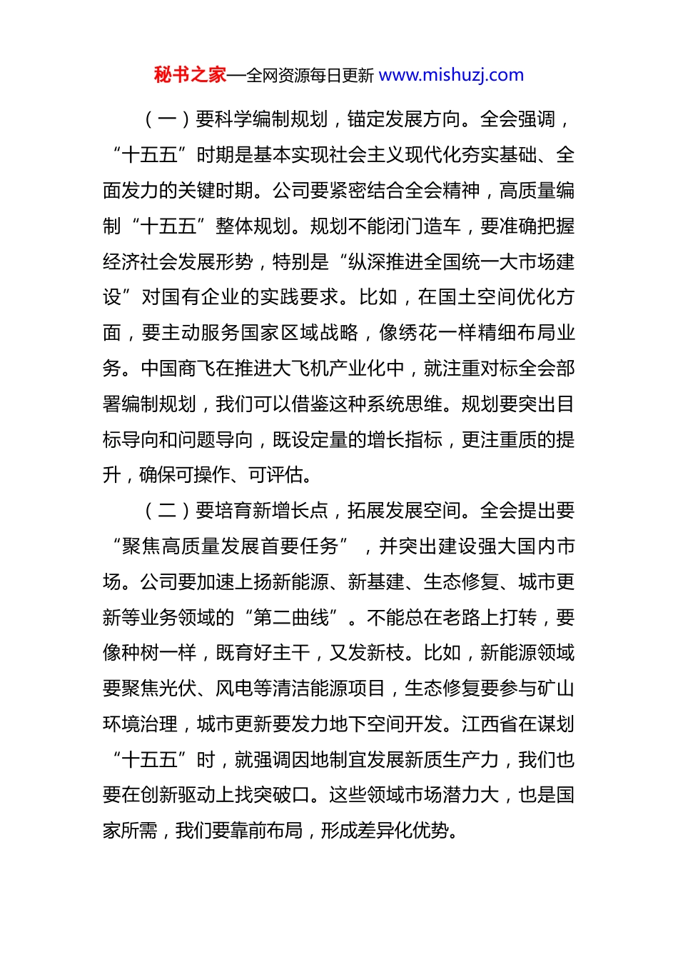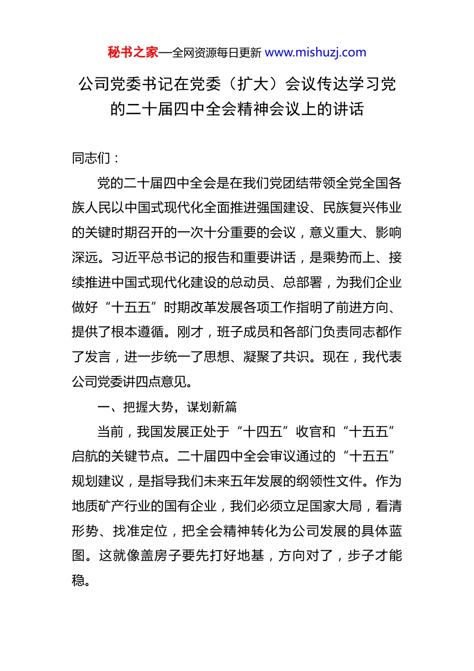 秘书之家—全网资源每日更新 www.mishuzj.com公司党委书记在党委(扩大)会议传达学习党的二十届四中全会精神会议上的讲话 同志们:党的二十届四中全会是在我们党团结带领全党全国各族人民以中国式现代化全面推进强国建设、民族复兴伟业的关键时期召开的一次十分重要的会议,意义重大、影响深远。习近平总书记的报告和重要讲话,是乘势而上、接续推进中国式现代化建设的总动员、总部署,为我们企业做好“十五五”时期改革发展各项工作指明了前进方向、提供了根本遵循。刚才,班子成员和各部门负责同志都作了发言,进一步统一了思想、凝聚了共识。现在,我代表公司党委讲四点意见。一、把握大势,谋划新篇当前,我国发展正处于“十四五”收官和“十五五”启航的关键节点。二十届四中全会审议通过的“十五五”规划建议,是指导我们未来五年发展的纲领性文件。作为地质矿产行业的国有企业,我们必须立足国家大局,看清形势、找准定位,把全会精神转化为公司发展的具体蓝图。这就像盖房子要先打好地基,方向对了,步子才能稳。秘书之家—全网资源每日更新 www.mishuzj.com(一)要科学编制规划,锚定发展方向。全会强调,“十五五”时期是基本实现社会主义现代化夯实基础、全面发力的关键时期。公司要紧密结合全会精神,高质量编制“十五五”整体规划。规划不能闭门造车,要准确把握经济社会发展形势,特别是“纵深推进全国统一大市场建设”对国有企业的实践要求。比如,在国土空间优化方面,要主动服务国家区域战略,像绣花一样精细布局业务。中国商飞在推进大飞机产业化中,就注重对标全会部署编制规划,我们可以借鉴这种系统思维。规划要突出目标导向和问题导向,既设定量的增长指标,更注重质的提升,确保可操作、可评估。(二)要培育新增长点,拓展发展空间。全会提出要“聚焦高质量发展首要任务”,并突出建设强大国内市场。公司要加速上扬新能源、新基建、生态修复、城市更新等业务领域的“第二曲线”。不能总在老路上打转,要像种树一样,既育好主干,又发新枝。比如,新能源领域要聚焦光伏、风电等清洁能源项目,生态修复要参与矿山环境治理,城市更新要发力地下空间开发。江西省在谋划“十五五”时,就强调因地制宜发展新质生产力,我们也要在创新驱动上找突破口。这些领域市场潜力大,也是国家所需,我们要靠前布局,形成差异化优势。秘书之家—全网资源每日更新 www.mishuzj.com(三)要提升核心能力,夯实发展根基。全会在“十五五”规划建议中,突出强调“增强核心功能、提升核心竞争力”。公司要不断增强企业核心功能,具体来说,就是强化技术研发和人才培养。地质工作专业性强,要加大科技投入,攻关关键核心技术,比如智能勘探、绿色采矿技术。同时,优化人才结构,培养既懂专业又懂管理的复合型人才。证监会党委在部署中提到“培育高质量的上市公司群体”,我们作为企业,也要打造高质量团队,这才是长久之计。核心能力上去了,公司在市场中才能立得住、走得远。二、激活动力,优化治理改革是发展的根本动力。全会审议通过的《建议》进一步强调以改革创新为根本动力,彰显了坚定不移推进改革的决心。对公司而言,就是要用改革破解难题,用治理提升效能,让企业肌体更健康、运行更高效。这好比开车,光有油门不行,还得有好刹车和方向盘。(一)要完善治理体系,提升决策效率。全会要求“提高治理效能”,公司要确保“三会一层”权责清晰、高效履职。不能职责交叉、推诿扯皮,要像钟表齿轮一样精准咬合。重点优化子(分)公司“三重一大”决策流程,该放的放、该管的管,减少不必要的审批环节。比秘书之家—全网资源每日更新 www.mishuzj.com如,对于重大项目投资,可以建立分级授权机制,既防范风险,又激发基层活力。国务院国资委在落实全会精神时,强调引导国有企业切实把发展重心转换到增强核心功能上来,我们的治理改革也要围绕这个核心。现代企业制度不是口号,要落实到每个会议、每个文件。(二)要整合内部资源,实现集约发展。全会提到“更加注重统筹发展和安全”,公司要加快资源集约化整合重组。资源分散就是浪费,要像揉面一样,把分散的力量聚起来...
