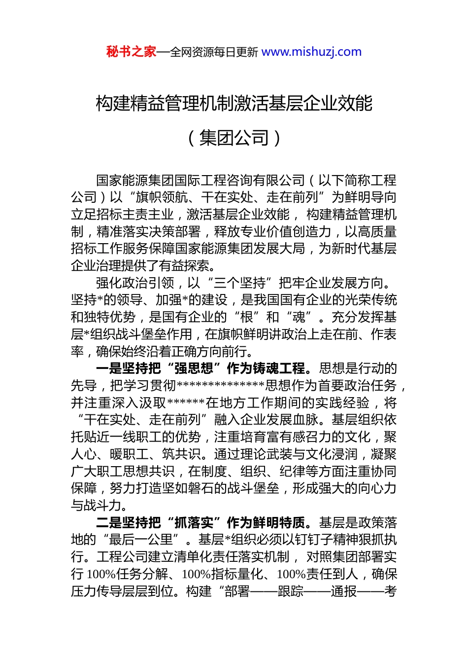秘书之家—全网资源每日更新 www.mishuzj.com构建精益管理机制激活基层企业效能(集团公司)国家能源集团国际工程咨询有限公司(以下简称工程公司)以“旗帜领航、干在实处、走在前列”为鲜明导向立足招标主责主业,激活基层企业效能, 构建精益管理机制,精准落实决策部署,释放专业价值创造力,以高质量招标工作服务保障国家能源集团发展大局,为新时代基层企业治理提供了有益探索。强化政治引领,以“三个坚持”把牢企业发展方向。坚持*的领导、加强*的建设,是我国国有企业的光荣传统和独特优势,是国有企业的“根”和“魂”。充分发挥基层*组织战斗堡垒作用,在旗帜鲜明讲政治上走在前、作表率,确保始终沿着正确方向前行。一是坚持把“强思想”作为铸魂工程。思想是行动的先导,把学习贯彻**************思想作为首要政治任务,并注重深入汲取******在地方工作期间的实践经验,将“干在实处、走在前列”融入企业发展血脉。基层组织依托贴近一线职工的优势,注重培育富有感召力的文化,聚人心、暖职工、筑共识。通过理论武装与文化浸润,凝聚广大职工思想共识,在制度、组织、纪律等方面注重协同保障,努力打造坚如磐石的战斗堡垒,形成强大的向心力与战斗力。二是坚持把“抓落实”作为鲜明特质。基层是政策落地的“最后一公里”。基层*组织必须以钉钉子精神狠抓执行。工程公司建立清单化责任落实机制, 对照集团部署实行 100%任务分解、100%指标量化、100%责任到人,确保压力传导层层到位。构建“部署——跟踪——通报——考秘书之家—全网资源每日更新 www.mishuzj.com核”的制度化履责机制,强化闭环管理。实施精准化督责机制,聚焦工作清单开展政治监督,严肃追责问责,有力保障上级决策部署在基层不打折扣、落地生根。三是坚持把“严基调”贯穿各个环节。这既是全面从严治*向基层延伸的必然要求,也是现代企业防控风险的现实需要。针对招标业务风险集中的特点, 工程公司构建“法、纪、规”全约束体系,推动监督执纪与中心工作深度融合, 既要坚持有法必依、执法必严、违法必究,也要做到执规必严、违规必究,增强规章制度的刚性约束力,使其在基层严格执行,形成有力震慑。建好用活典型案例库,发挥警示教育预防作用,涵养风清气正的政治生态。深化改革破题,以“三项机制”激活内生动力。企业活力源于科学高效的体制机制。工程公司以构建新型生产关系为抓手,推动组织效能和职工活力充分释放,打造协同高效运行体系。一是夯实联系群众机制“基石”作用。基层优势在于密切联系一线职工, 必须坚持“从群众中来,到群众中去”的工作方法。领导班子常态化开展调查研究,广泛收集职工意见,运用科学方法分析并转化为政策。政策制定后投入实践中接受实践检验,形成闭环治理。从而使职工深度参与政策制定,实现“班子决策与职工意愿、战略部署与具体执行、全局目标与个人思想”高度统一, 形成“共谋发展、共治企业、共享成果”的良好局面。二是发挥收入分配机制“杠杆”效能。分配方式是生产关系的核心要素, 应遵循市场规律和价值导向。工程公司所属企业建立“业绩与贡献挂钩”的激励机制,引导职工主动认领经营指标、攻坚项目难题,实现个人收益与集体增值同频。构建橄榄型收入分配结构,顶端为高贡献的骨干,中段广泛覆盖绩效稳定的中坚群体,底部精准识别少数需提升者,有利于激励先进、带动中间、鞭策后进,打破“大锅饭”模式,全面激活职工的积极性、主动性、秘书之家—全网资源每日更新 www.mishuzj.com创造性, 营造“你追我赶”的工作氛围。三是强化人才选育机制“孵化”功能。基层企业是培养人才的“沃土”。工程公司坚持“在实践中识人、在一线中育人”,选配基层企业领导班子突出“群众公认度”确保干部靠得住、能干事、口碑好。评优评先实行“职工民主推荐”,将职工认可度作为重要标准。在重大项目、急难险重任务中“选将”, 通过招标攻坚、风险处置等实践锤炼干部,常态化向集团输送专业人才,为国家能源集团建设世界一流企业提供坚实的专业人才支撑。聚焦价值创造,以“三个深度”提升服务效能。价值创造是企业核心竞争力的集中体现。工程公...