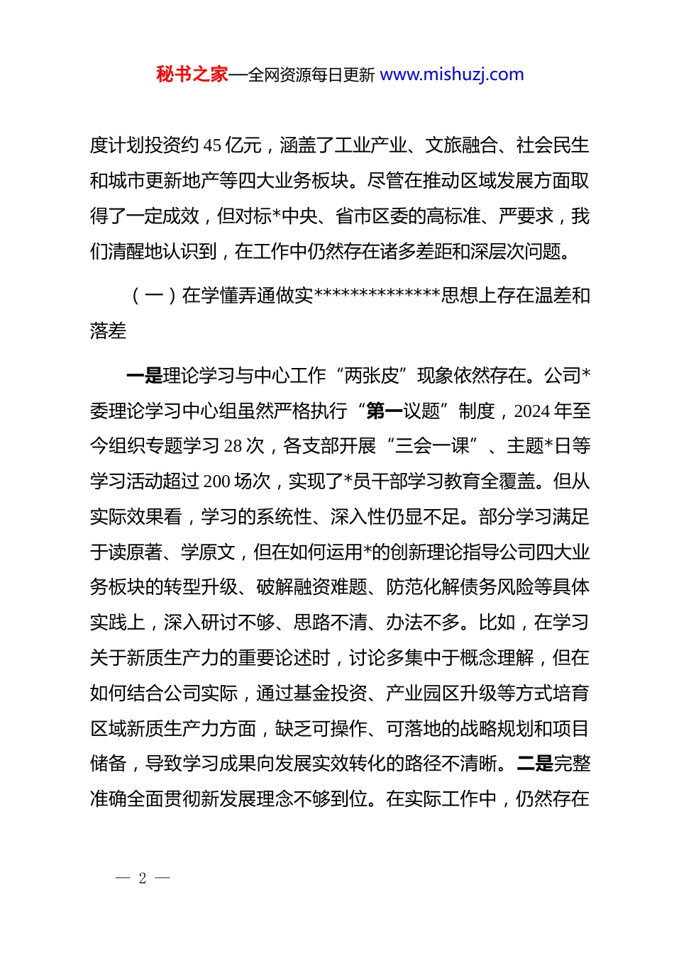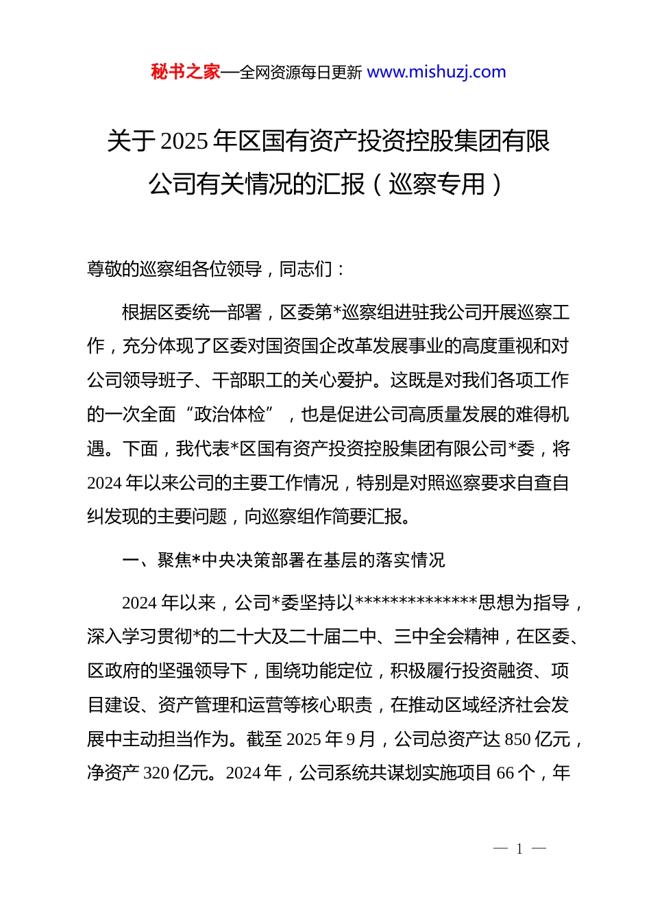 秘书之家—全网资源每日更新 www.mishuzj.com关于 2025 年区国有资产投资控股集团有限公司有关情况的汇报(巡察专用)尊敬的巡察组各位领导,同志们:根据区委统一部署,区委第*巡察组进驻我公司开展巡察工作,充分体现了区委对国资国企改革发展事业的高度重视和对公司领导班子、干部职工的关心爱护。这既是对我们各项工作的一次全面“政治体检”,也是促进公司高质量发展的难得机遇。下面,我代表*区国有资产投资控股集团有限公司*委,将2024 年以来公司的主要工作情况,特别是对照巡察要求自查自纠发现的主要问题,向巡察组作简要汇报。一、聚焦*中央决策部署在基层的落实情况2024 年以来,公司*委坚持以**************思想为指导,深入学习贯彻*的二十大及二十届二中、三中全会精神,在区委、区政府的坚强领导下,围绕功能定位,积极履行投资融资、项目建设、资产管理和运营等核心职责,在推动区域经济社会发展中主动担当作为。截至 2025 年 9 月,公司总资产达 850 亿元,净资产 320 亿元。2024 年,公司系统共谋划实施项目 66 个,年— 1 —秘书之家—全网资源每日更新 www.mishuzj.com度计划投资约 45 亿元,涵盖了工业产业、文旅融合、社会民生和城市更新地产等四大业务板块。尽管在推动区域发展方面取得了一定成效,但对标*中央、省市区委的高标准、严要求,我们清醒地认识到,在工作中仍然存在诸多差距和深层次问题。(一)在学懂弄通做实**************思想上存在温差和落差一是理论学习与中心工作“两张皮”现象依然存在。公司*委理论学习中心组虽然严格执行“第一议题”制度,2024 年至今组织专题学习 28 次,各支部开展“三会一课”、主题*日等学习活动超过 200 场次,实现了*员干部学习教育全覆盖。但从实际效果看,学习的系统性、深入性仍显不足。部分学习满足于读原著、学原文,但在如何运用*的创新理论指导公司四大业务板块的转型升级、破解融资难题、防范化解债务风险等具体实践上,深入研讨不够、思路不清、办法不多。比如,在学习关于新质生产力的重要论述时,讨论多集中于概念理解,但在如何结合公司实际,通过基金投资、产业园区升级等方式培育区域新质生产力方面,缺乏可操作、可落地的战略规划和项目储备,导致学习成果向发展实效转化的路径不清晰。二是完整准确全面贯彻新发展理念不够到位。在实际工作中,仍然存在— 2 —秘书之家—全网资源每日更新 www.mishuzj.com路径依赖和思维定式。在项目投资决策中,有时过于看重项目的短期效益和现金流,对是否符合绿色、协调、创新等新发展理念的考量权重不足。在工业产业投资领域,对传统制造业升级改造项目投入较多,但在前瞻性布局战略性新兴产业方面,存在“看不准、不敢投”的畏难情绪,导致产业投资的引领性和创新性有待加强。在地产开发板块,部分项目仍延续“高周转、快开发”的传统模式,对标先进地区,在智慧城市、绿色建筑、韧性社区等新理念的融入和实践上还有较大差距。(二)在推动中央和省市区委重大决策部署落地见效上存在偏差和梗阻一是服务全区中心任务的精准度和贡献度有待提升。公司虽然承担了多个区级重点项目建设任务,但有时存在“被动领任务”而非“主动谋作为”的倾向。在服务“*新区”开发建设、推动“*产业带”能级提升等全区重大战略中,前瞻性研究和主动策划能力不足。例如,在*片区城市更新项目中,公司主要承担了基础设施代建和部分安置房建设任务,但在如何通过市场化手段导入优质产业资源、提升片区长期运营价值等方面,思考不深、作为不多,未能充分发挥国企在片区综合开发中的“操盘手”作用。二是全面深化改革的攻坚力度和深度有待加— 3 —秘书之家—全网资源每日更新 www.mishuzj.com强。国企改革三年行动虽已收官,但部分改革任务的“形”已具备,“神”仍不足。经理层任期制和契约化管理在部分二级子公司尚未完全实现刚性兑现,考核结果与薪酬激励的强挂钩机制没有完全建立。市场化选人用人机制仍有堵点,2024 年以来通过市场化方式招聘中高层管理人员仅 3 名,占比偏低,干部队伍的活力和专业化水平亟待提升。混合所有制改革存在...