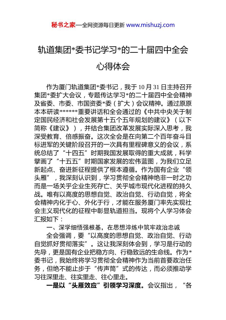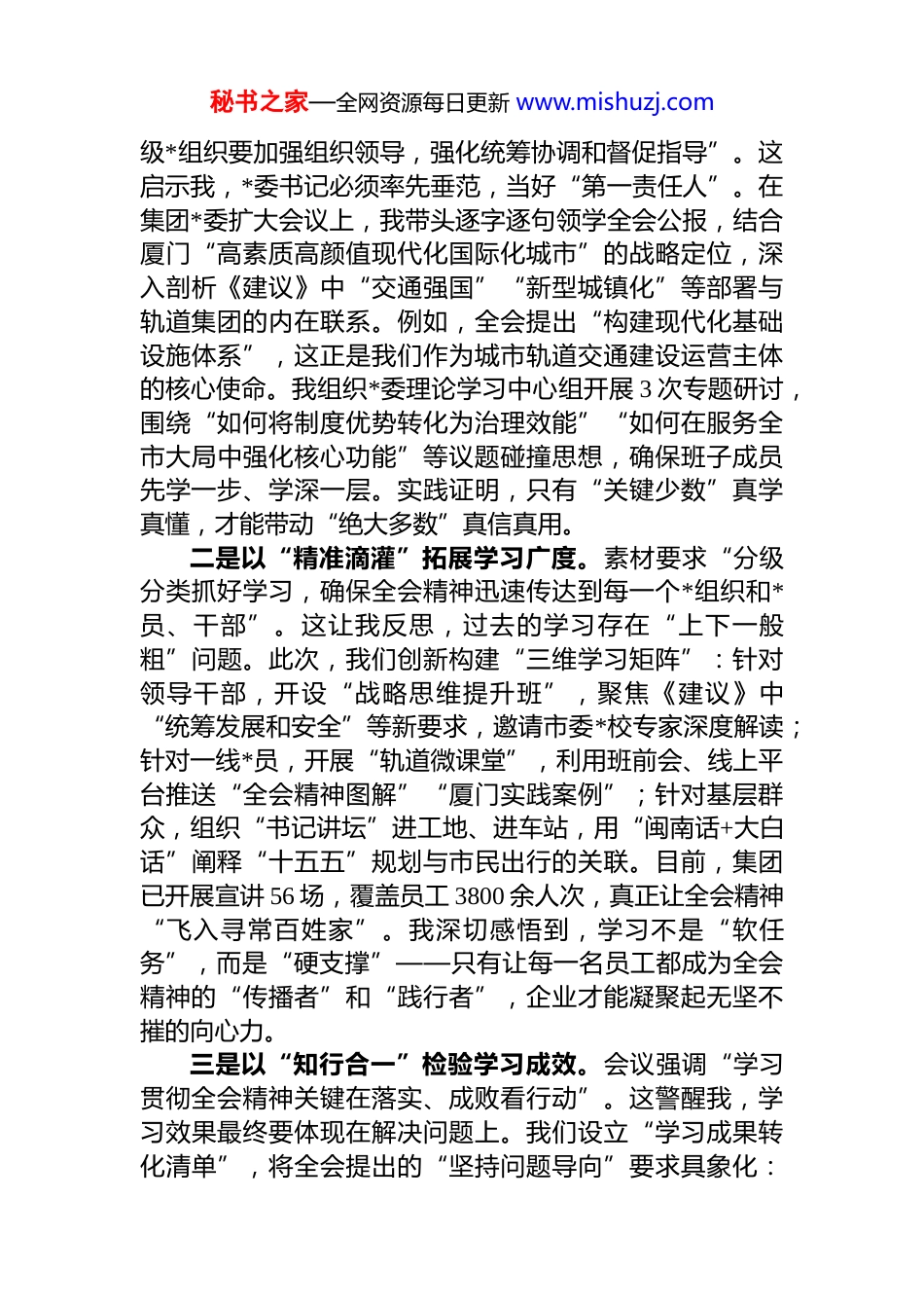 秘书之家—全网资源每日更新 www.mishuzj.com轨道集团*委书记学习*的二十届四中全会心得体会作为厦门轨道集团*委书记,我于 10 月 31 日主持召开集团*委扩大会议,专题传达学习*的二十届四中全会精神及省委、市委、市国资委*委(扩大)会议精神。通过原原本本研读******重要讲话和全会通过的《中共中央关于制定国民经济和社会发展第十五个五年规划的建议》(以下简称《建议》),并结合集团改革发展实际深入思考,我深受教育、倍感振奋。这次全会是在向第二个百年奋斗目标进军的关键阶段召开的一次具有里程碑意义的会议,系统总结了“十四五”时期我国发展取得的重大成就,科学擘画了“十五五”时期国家发展的宏伟蓝图,为我们立足新起点、奋进新征程提供了根本遵循。作为国有企业“领头雁”,我深刻认识到,学习贯彻全会精神绝非一时之功而是一场关乎企业生死存亡、关乎城市现代化进程的持久战。唯有以高度的思想自觉、政治自觉、行动自觉,将全会精神内化于心、外化于行,才能在服务厦门率先实现社会主义现代化的征程中彰显轨道担当。现将个人学习体会汇报如下:一、深学细悟强根基,在思想淬炼中筑牢政治忠诚全会强调,要“以高度的思想自觉、政治自觉、行动自觉抓好贯彻落实”。这让我深刻体会到,学习是行动的先导,更是国有企业把稳方向、行稳致远的生命线。作为*委书记,我始终将学习贯彻全会精神作为当前首要政治任务,但绝不能止步于“传声筒”式的传达,而必须推动学习往深里走、往实里走、往心里走。一是以“头雁效应”引领学习深度。会议指出,“各秘书之家—全网资源每日更新 www.mishuzj.com级*组织要加强组织领导,强化统筹协调和督促指导”。这启示我,*委书记必须率先垂范,当好“第一责任人”。在集团*委扩大会议上,我带头逐字逐句领学全会公报,结合厦门“高素质高颜值现代化国际化城市”的战略定位,深入剖析《建议》中“交通强国”“新型城镇化”等部署与轨道集团的内在联系。例如,全会提出“构建现代化基础设施体系”,这正是我们作为城市轨道交通建设运营主体的核心使命。我组织*委理论学习中心组开展 3 次专题研讨,围绕“如何将制度优势转化为治理效能”“如何在服务全市大局中强化核心功能”等议题碰撞思想,确保班子成员先学一步、学深一层。实践证明,只有“关键少数”真学真懂,才能带动“绝大多数”真信真用。二是以“精准滴灌”拓展学习广度。素材要求“分级分类抓好学习,确保全会精神迅速传达到每一个*组织和*员、干部”。这让我反思,过去的学习存在“上下一般粗”问题。此次,我们创新构建“三维学习矩阵”:针对领导干部,开设“战略思维提升班”,聚焦《建议》中“统筹发展和安全”等新要求,邀请市委*校专家深度解读;针对一线*员,开展“轨道微课堂”,利用班前会、线上平台推送“全会精神图解”“厦门实践案例”;针对基层群众,组织“书记讲坛”进工地、进车站,用“闽南话+大白话”阐释“十五五”规划与市民出行的关联。目前,集团已开展宣讲 56 场,覆盖员工 3800 余人次,真正让全会精神“飞入寻常百姓家”。我深切感悟到,学习不是“软任务”,而是“硬支撑”——只有让每一名员工都成为全会精神的“传播者”和“践行者”,企业才能凝聚起无坚不摧的向心力。三是以“知行合一”检验学习成效。会议强调“学习贯彻全会精神关键在落实、成败看行动”。这警醒我,学习效果最终要体现在解决问题上。我们设立“学习成果转化清单”,将全会提出的“坚持问题导向”要求具象化:秘书之家—全网资源每日更新 www.mishuzj.com针对集团在“十四五”期间暴露的“融资渠道单一”“智能化水平不足”等短板,班子成员每人认领 1-2 项攻坚课题,形成“学习—调研—整改”闭环。例如,通过学习全会“深化国企改革”部署,我带队赴深圳地铁集团对标,推动集团混改方案提速落地。这让我深刻认识到,真学真用全会精神,就是要以“刀刃向内”的勇气破除思想桎梏,在破解难题中锤炼政治判断力、政治领悟力、政治执行力。二、科学谋划谋长远,在战略擘画中扛起时代使命全会通过的《建议》是指导“十五五”发展的纲领性文件,会议要求“把自...