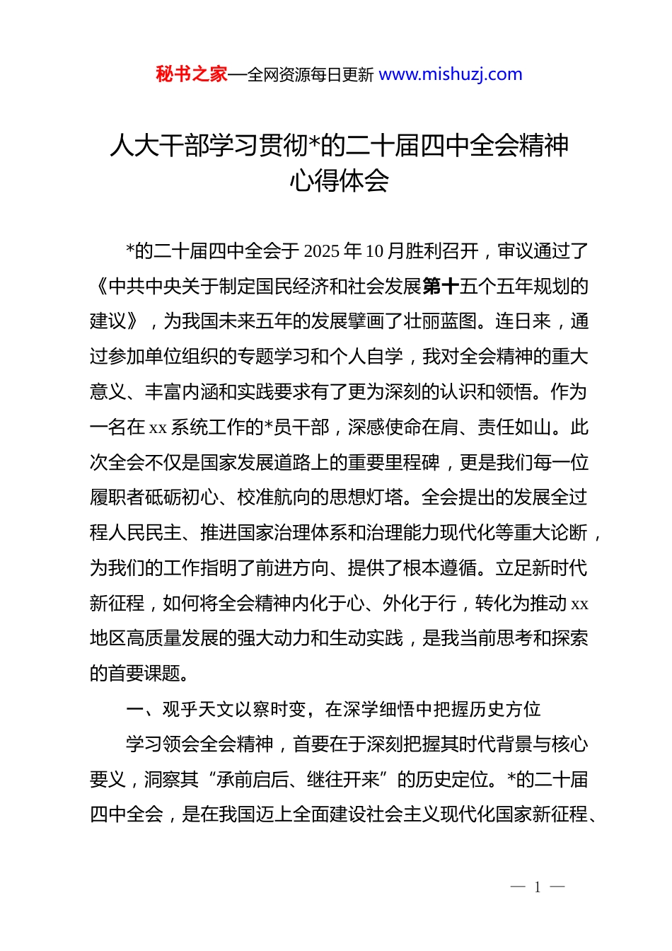 秘书之家—全网资源每日更新 www.mishuzj.com人大干部学习贯彻*的二十届四中全会精神心得体会*的二十届四中全会于 2025 年 10 月胜利召开,审议通过了《中共中央关于制定国民经济和社会发展第十五个五年规划的建议》,为我国未来五年的发展擘画了壮丽蓝图。连日来,通过参加单位组织的专题学习和个人自学,我对全会精神的重大意义、丰富内涵和实践要求有了更为深刻的认识和领悟。作为一名在 xx 系统工作的*员干部,深感使命在肩、责任如山。此次全会不仅是国家发展道路上的重要里程碑,更是我们每一位履职者砥砺初心、校准航向的思想灯塔。全会提出的发展全过程人民民主、推进国家治理体系和治理能力现代化等重大论断,为我们的工作指明了前进方向、提供了根本遵循。立足新时代新征程,如何将全会精神内化于心、外化于行,转化为推动 xx地区高质量发展的强大动力和生动实践,是我当前思考和探索的首要课题。一、观乎天文以察时变,在深学细悟中把握历史方位学习领会全会精神,首要在于深刻把握其时代背景与核心要义,洞察其“承前启后、继往开来”的历史定位。*的二十届四中全会,是在我国迈上全面建设社会主义现代化国家新征程、— 1 —秘书之家—全网资源每日更新 www.mishuzj.com向第二个百年奋斗目标进军的关键时刻召开的一次十分重要的会议。全会系统谋划了“十五五”时期经济社会发展的指导原则、主要目标和战略任务,明确了以中国式现代化全面推进强国建设、民族复兴伟业的实践路径。这要求我们必须站在历史和全局的高度,将学习全会精神置于*和国家事业发展大局中来理解。通过系统学习,我深刻认识到,“十五五”时期是实现2035 年基本实现社会主义现代化目标的关键五年。全会强调要统筹发展和安全全面贯彻新发展理念,这不仅是宏观层面的战略指引,更对我们基层治理工作提出了具体要求。作为人大工作者,必须将这种高瞻远瞩的战略思维,贯穿于依法履职的全过程。要带头先学一步、学深一层,通过参加宣讲报告、专题研讨等形式,反复研读全会公报和《建议》原文,准确把握其中蕴含的新思想、新观点、新举措,确保思想认识与*中央决策部署同频共振,真正做到“知其然,知其所以然,更知其所以必然”。二、应乎人心以顺民意,在履职尽责中践行根本宗旨全过程人民民主是社会主义民主政治的本质属性,也是我们人大工作的生命线。*的二十届四中全会再次对“发展全过程人民民主”作出重要部署,为我们指明了履职的根本方向。学习贯彻全会精神,核心在于将“人民至上”的理念熔铸于血脉、— 2 —秘书之家—全网资源每日更新 www.mishuzj.com付诸于行动。人大代表来自人民、植根人民,我们的职责就是要把群众的“心上事”当作自己的“上心事”。这就要求我们不能仅仅满足于会议室里的学习,更要迈开双腿、深入基层,真正做到“从群众中来,到群众中去”。具体而言,要依托人大代表联络站、社区(村组)等平台,常态化开展联系群众活动,变“被动接访”为“主动下访”,面对面倾听群众在生态环保、食品安全、养老服务等领域的真实诉求和急难愁盼问题。对于收集到的意见建议,要建立从提写、交办、督办到反馈的闭环管理机制,确保每一条建议都有人管、有着落、有回音,让人民群众的“金点子”转化为推动 xx 地区发展的“金钥匙”。这正是对全过程人民民主中民主选举、民主协商、民主决策、民主管理、民主监督各环节贯通的生动诠释也是确保人民当家作主权利落到实处的关键所在。三、取法乎上以求卓越,在守正创新中提升治理效能“十五五”规划强调要以高质量发展为主题,这对地方治理能力提出了新的更高要求。贯彻落实全会精神,必须在实践中大胆探索、守正创新,不断提升依法履职的专业化水平和监督实效。全会提出的推进国家治理体系和治理能力现代化,对人大工作而言,就是要善于运用法治思维和法治方式破解发展难题、化解社会矛盾。一方面,要强化“业务上的行家人”意识。— 3 —秘书之家—全网资源每日更新 www.mishuzj.com严格依照法定权限和程序行使监督权、决定权和任免权,特别是在规范性文件备案审查、执法检查等工作中,要敢于监督、善于监督,围绕群众...