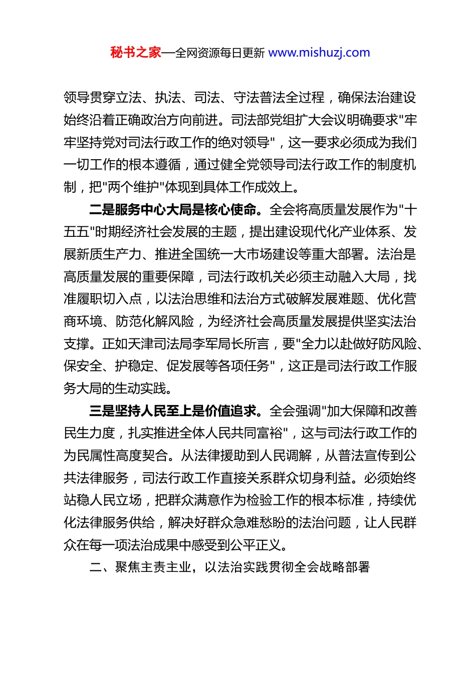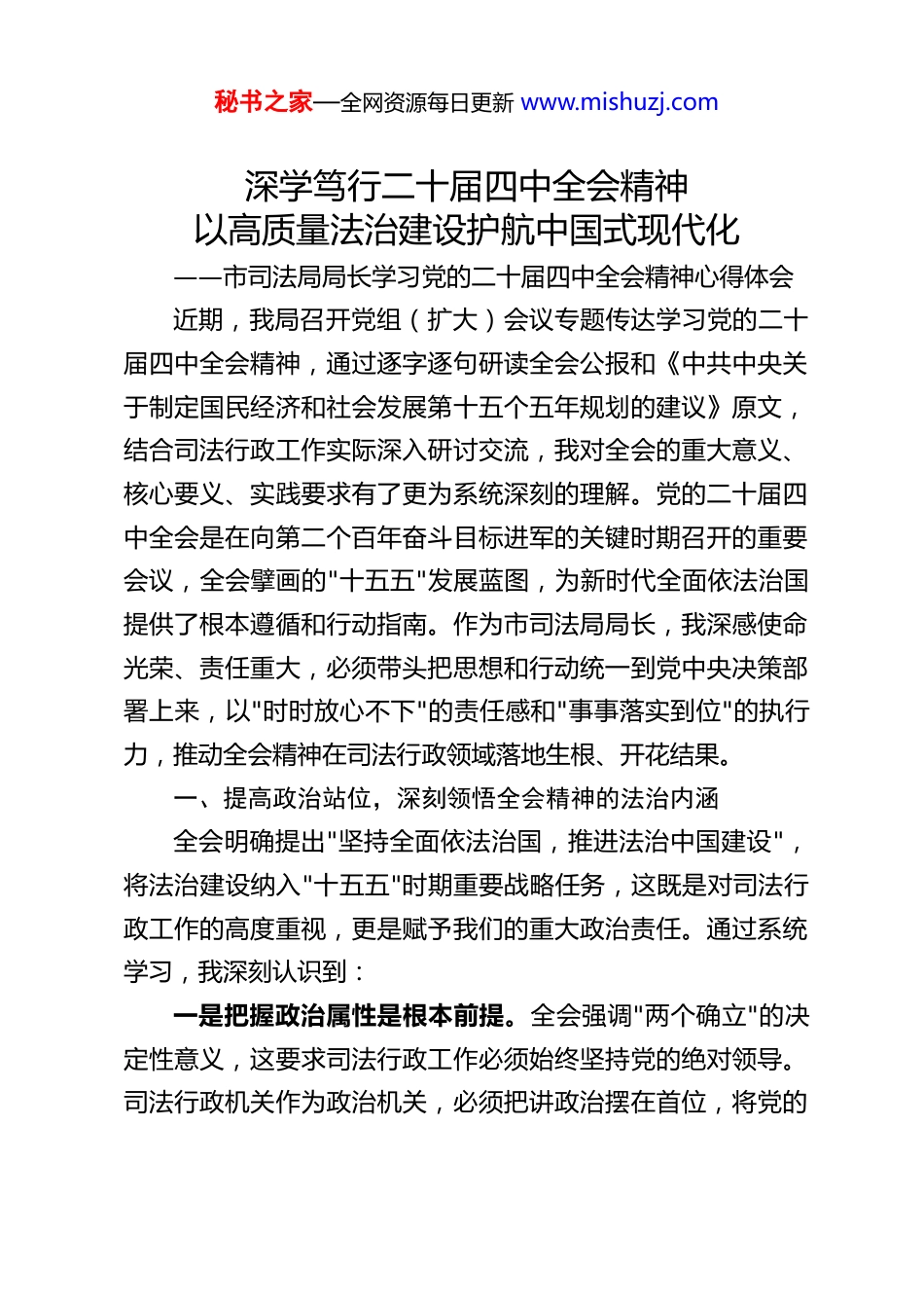 秘书之家—全网资源每日更新 www.mishuzj.com深学笃行二十届四中全会精神以高质量法治建设护航中国式现代化——市司法局局长学习党的二十届四中全会精神心得体会近期,我局召开党组(扩大)会议专题传达学习党的二十届四中全会精神,通过逐字逐句研读全会公报和《中共中央关于制定国民经济和社会发展第十五个五年规划的建议》原文,结合司法行政工作实际深入研讨交流,我对全会的重大意义、核心要义、实践要求有了更为系统深刻的理解。党的二十届四中全会是在向第二个百年奋斗目标进军的关键时期召开的重要会议,全会擘画的"十五五"发展蓝图,为新时代全面依法治国提供了根本遵循和行动指南。作为市司法局局长,我深感使命光荣、责任重大,必须带头把思想和行动统一到党中央决策部署上来,以"时时放心不下"的责任感和"事事落实到位"的执行力,推动全会精神在司法行政领域落地生根、开花结果。一、提高政治站位,深刻领悟全会精神的法治内涵全会明确提出"坚持全面依法治国,推进法治中国建设",将法治建设纳入"十五五"时期重要战略任务,这既是对司法行政工作的高度重视,更是赋予我们的重大政治责任。通过系统学习,我深刻认识到:一是把握政治属性是根本前提。全会强调"两个确立"的决定性意义,这要求司法行政工作必须始终坚持党的绝对领导。司法行政机关作为政治机关,必须把讲政治摆在首位,将党的秘书之家—全网资源每日更新 www.mishuzj.com领导贯穿立法、执法、司法、守法普法全过程,确保法治建设始终沿着正确政治方向前进。司法部党组扩大会议明确要求"牢牢坚持党对司法行政工作的绝对领导",这一要求必须成为我们一切工作的根本遵循,通过健全党领导司法行政工作的制度机制,把"两个维护"体现到具体工作成效上。二是服务中心大局是核心使命。全会将高质量发展作为"十五五"时期经济社会发展的主题,提出建设现代化产业体系、发展新质生产力、推进全国统一大市场建设等重大部署。法治是高质量发展的重要保障,司法行政机关必须主动融入大局,找准履职切入点,以法治思维和法治方式破解发展难题、优化营商环境、防范化解风险,为经济社会高质量发展提供坚实法治支撑。正如天津司法局李军局长所言,要"全力以赴做好防风险、保安全、护稳定、促发展等各项任务",这正是司法行政工作服务大局的生动实践。三是坚持人民至上是价值追求。全会强调"加大保障和改善民生力度,扎实推进全体人民共同富裕",这与司法行政工作的为民属性高度契合。从法律援助到人民调解,从普法宣传到公共法律服务,司法行政工作直接关系群众切身利益。必须始终站稳人民立场,把群众满意作为检验工作的根本标准,持续优化法律服务供给,解决好群众急难愁盼的法治问题,让人民群众在每一项法治成果中感受到公平正义。二、聚焦主责主业,以法治实践贯彻全会战略部署秘书之家—全网资源每日更新 www.mishuzj.com学习贯彻全会精神,关键在落实。结合我市司法行政工作实际,我们将重点抓好五大任务,把全会部署转化为具体工作成效:(一)强化法治供给,服务高质量发展新格局围绕全会提出的"建设现代化产业体系、发展新质生产力"等要求,我们将着力构建与高质量发展相适应的法治保障体系。一是加强重点领域立法。聚焦先进制造业、科技创新、数字经济等新兴领域,开展专项立法调研,健全制度规范,为新质生产力发展提供法治遵循;针对优化营商环境,制定行政执法包容审慎监管清单,规范涉企行政执法行为,防止和纠正趋利性执法、违规异地执法,助力打造市场化法治化国际化一流营商环境。二是深化行政执法改革。全面落实行政执法"三项制度",推进跨领域跨部门综合执法,加强行政执法监督,规范执法自由裁量权,让执法既有力度又有温度。三是提升涉外法治服务能力。围绕"稳步扩大制度型开放"要求,组建涉外法律服务团,对接企业涉外法律需求,提供合规审查、跨境争议解决等服务,助力企业"走出去"。(二)夯实法治根基,推进法治社会建设纵深发展全会要求"协同推进科学立法、严格执法、公正司法、全民守法",我们将以创建全国法治政府建设示范市为抓手,全面提升法治社会建设水平。一是深化普法宣传教育。实施...