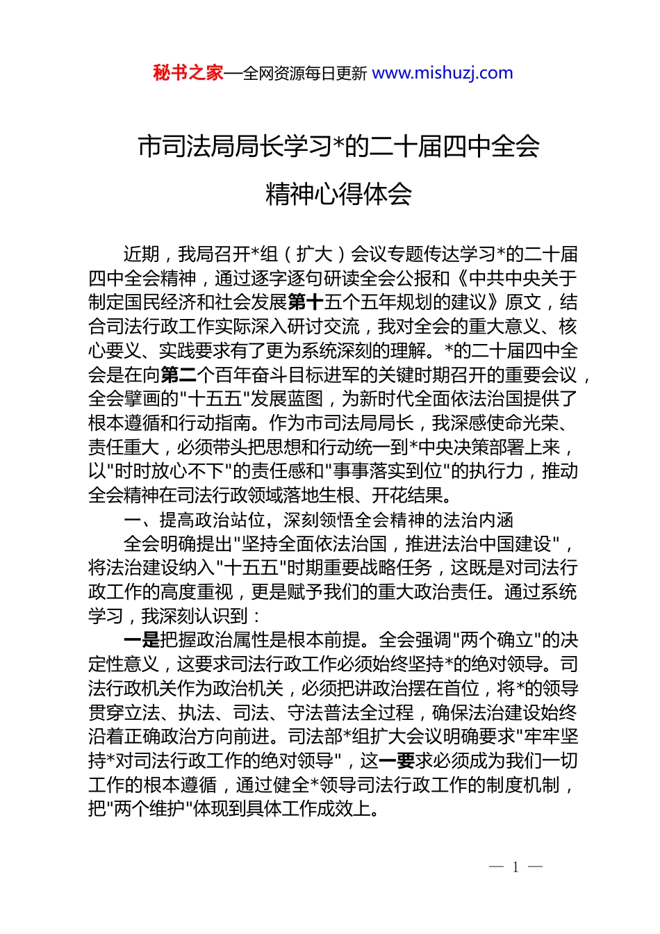 秘书之家—全网资源每日更新 www.mishuzj.com市司法局局长学习*的二十届四中全会精神心得体会近期,我局召开*组(扩大)会议专题传达学习*的二十届四中全会精神,通过逐字逐句研读全会公报和《中共中央关于制定国民经济和社会发展第十五个五年规划的建议》原文,结合司法行政工作实际深入研讨交流,我对全会的重大意义、核心要义、实践要求有了更为系统深刻的理解。*的二十届四中全会是在向第二个百年奋斗目标进军的关键时期召开的重要会议,全会擘画的"十五五"发展蓝图,为新时代全面依法治国提供了根本遵循和行动指南。作为市司法局局长,我深感使命光荣、责任重大,必须带头把思想和行动统一到*中央决策部署上来,以"时时放心不下"的责任感和"事事落实到位"的执行力,推动全会精神在司法行政领域落地生根、开花结果。一、提高政治站位,深刻领悟全会精神的法治内涵全会明确提出"坚持全面依法治国,推进法治中国建设",将法治建设纳入"十五五"时期重要战略任务,这既是对司法行政工作的高度重视,更是赋予我们的重大政治责任。通过系统学习,我深刻认识到:一是把握政治属性是根本前提。全会强调"两个确立"的决定性意义,这要求司法行政工作必须始终坚持*的绝对领导。司法行政机关作为政治机关,必须把讲政治摆在首位,将*的领导贯穿立法、执法、司法、守法普法全过程,确保法治建设始终沿着正确政治方向前进。司法部*组扩大会议明确要求"牢牢坚持*对司法行政工作的绝对领导",这一要求必须成为我们一切工作的根本遵循,通过健全*领导司法行政工作的制度机制,把"两个维护"体现到具体工作成效上。— 1 —秘书之家—全网资源每日更新 www.mishuzj.com二是服务中心大局是核心使命。全会将高质量发展作为"十五五"时期经济社会发展的主题,提出建设现代化产业体系、发展新质生产力、推进全国统一大市场建设等重大部署。法治是高质量发展的重要保障,司法行政机关必须主动融入大局,找准履职切入点,以法治思维和法治方式破解发展难题、优化营商环境、防范化解风险,为经济社会高质量发展提供坚实法治支撑。正如天津司法局李军局长所言,要"全力以赴做好防风险、保安全、护稳定、促发展等各项任务",这正是司法行政工作服务大局的生动实践。三是坚持人民至上是价值追求。全会强调"加大保障和改善民生力度,扎实推进全体人民共同富裕",这与司法行政工作的为民属性高度契合。从法律援助到人民调解,从普法宣传到公共法律服务,司法行政工作直接关系群众切身利益。必须始终站稳人民立场,把群众满意作为检验工作的根本标准,持续优化法律服务供给,解决好群众急难愁盼的法治问题,让人民群众在每一项法治成果中感受到公平正义。二、聚焦主责主业,以法治实践贯彻全会战略部署学习贯彻全会精神,关键在落实。结合我市司法行政工作实际,我们将重点抓好五大任务,把全会部署转化为具体工作成效:(一)强化法治供给,服务高质量发展新格局围绕全会提出的"建设现代化产业体系、发展新质生产力"等要求,我们将着力构建与高质量发展相适应的法治保障体系。一是加强重点领域立法。聚焦先进制造业、科技创新、数字经济等新兴领域,开展专项立法调研,健全制度规范,为新质生产力发展提供法治遵循;针对优化营商环境,制定行政执法包容审慎监管清单,规范涉企行政执法行为,防止和纠正趋利性执法、违规异地执法,助力打造市场化法治化国际化一流营商环境。二是深化行政执法改革。全面落实行政执法"三项制— 2 —秘书之家—全网资源每日更新 www.mishuzj.com度",推进跨领域跨部门综合执法,加强行政执法监督,规范执法自由裁量权,让执法既有力度又有温度。三是提升涉外法治服务能力。围绕"稳步扩大制度型开放"要求,组建涉外法律服务团,对接企业涉外法律需求,提供合规审查、跨境争议解决等服务,助力企业"走出去"。(二)夯实法治根基,推进法治社会建设纵深发展全会要求"协同推进科学立法、严格执法、公正司法、全民守法",我们将以创建全国法治政府建设示范市为抓手,全面提升法治社会建设水平。一是深化普法宣传教育。实施公民法治素养提升行动,结合"八五"普法中期评估,创新普法...