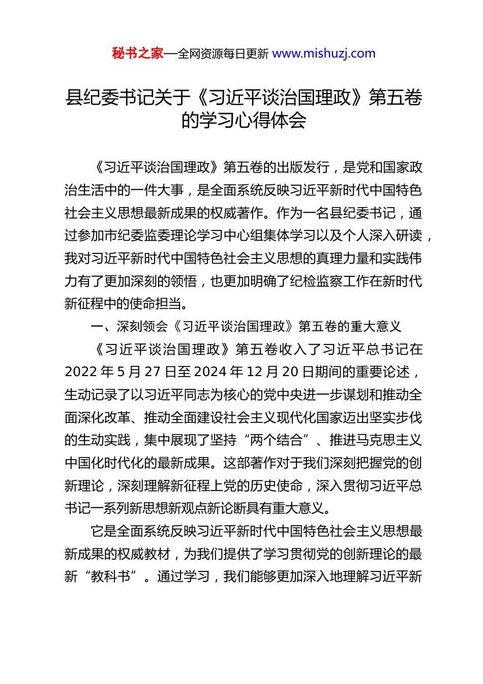 秘书之家—全网资源每日更新 www.mishuzj.com县纪委书记关于《习近平谈治国理政》第五卷的学习心得体会《习近平谈治国理政》第五卷的出版发行,是党和国家政治生活中的一件大事,是全面系统反映习近平新时代中国特色社会主义思想最新成果的权威著作。作为一名县纪委书记,通过参加市纪委监委理论学习中心组集体学习以及个人深入研读,我对习近平新时代中国特色社会主义思想的真理力量和实践伟力有了更加深刻的领悟,也更加明确了纪检监察工作在新时代新征程中的使命担当。一、深刻领会《习近平谈治国理政》第五卷的重大意义《习近平谈治国理政》第五卷收入了习近平总书记在2022 年 5 月 27 日至 2024 年 12 月 20 日期间的重要论述,生动记录了以习近平同志为核心的党中央进一步谋划和推动全面深化改革、推动全面建设社会主义现代化国家迈出坚实步伐的生动实践,集中展现了坚持“两个结合”、推进马克思主义中国化时代化的最新成果。这部著作对于我们深刻把握党的创新理论,深刻理解新征程上党的历史使命,深入贯彻习近平总书记一系列新思想新观点新论断具有重大意义。它是全面系统反映习近平新时代中国特色社会主义思想最新成果的权威教材,为我们提供了学习贯彻党的创新理论的最新“教科书”。通过学习,我们能够更加深入地理解习近平新秘书之家—全网资源每日更新 www.mishuzj.com时代中国特色社会主义思想的科学体系、核心要义、实践要求,更加自觉地用这一思想武装头脑、指导实践、推动工作。它是党和国家事业发展的科学指南,为我们在新征程上应对各种风险挑战、推动各项事业发展提供了根本遵循。书中关于中国式现代化、全面深化改革、全面从严治党等方面的重要论述,为我们做好纪检监察工作指明了方向。二、准确把握《习近平谈治国理政》第五卷中关于纪检监察工作的重要要求(一)以党的自我革命引领全面从严治党《习近平谈治国理政》第五卷专设“坚持和加强党中央集中统一领导,把党的自我革命进行到底”专题,集中记录了党的二十大以来习近平总书记关于党的自我革命、全面从严治党、正风肃纪反腐的重要论述。习近平总书记指出,推进党的自我革命是跳出治乱兴衰历史周期率的重要法宝,要着力铲除腐败滋生的土壤和条件,更加有效清除存量、遏制增量,进一步健全全面从严治党体系,开辟百年大党自我革命新境界。作为纪检监察机关,我们要深刻领悟习近平总书记关于党的自我革命的重要思想,立足职能职责,坚定不移推进全面从严治党,以永远在路上的政治自觉正风肃纪反腐。(二)围绕中国式现代化强化监督保障中国式现代化是党和国家事业发展的总目标,纪检监察工作要围绕这一目标发挥监督保障执行、促进完善发展作用。秘书之家—全网资源每日更新 www.mishuzj.com《习近平谈治国理政》第五卷中关于中国式现代化的重要论述,为我们开展监督工作提供了重要依据。我们要围绕贯彻新发展理念、构建新发展格局、推动高质量发展等重大决策部署,强化政治监督,确保党中央政令畅通。要聚焦“中国式现代化”强化监督,保障中国式现代化行稳致远,特别是要加强对黄河流域生态保护等党中央重大决策部署落实情况的监督检查,确保各项政策措施落地见效。(三)践行人民立场,整治群众身边不正之风和腐败问题习近平总书记始终坚持人民立场,强调要把人民对美好生活的向往作为奋斗目标。《习近平谈治国理政》第五卷中多处体现了这一思想。纪检监察工作要坚持以人民为中心,深入整治群众身边不正之风和腐败问题。要突出办案重点,提升办案质量,坚决查处群众反映强烈的突出问题。要办好民生实事,坚持问效于民,兜牢民生底线,让人民群众感受到全面从严治党的实际成效。要做好信访这个“送上门来的群众工作”,健全完善信访举报闭环监督管理机制,引导群众依法有序反映问题,切实解决群众的操心事、烦心事、揪心事。三、切实将《习近平谈治国理政》第五卷学习成果转化为纪检监察工作实效(一)加强理论武装,提高政治站位要把学习贯彻《习近平谈治国理政》第五卷作为重大政治任务,与第一卷至第四卷贯通起来,深入学习领会习近平新时秘书之家—全网资源每日更新 www.mishuzj.co...