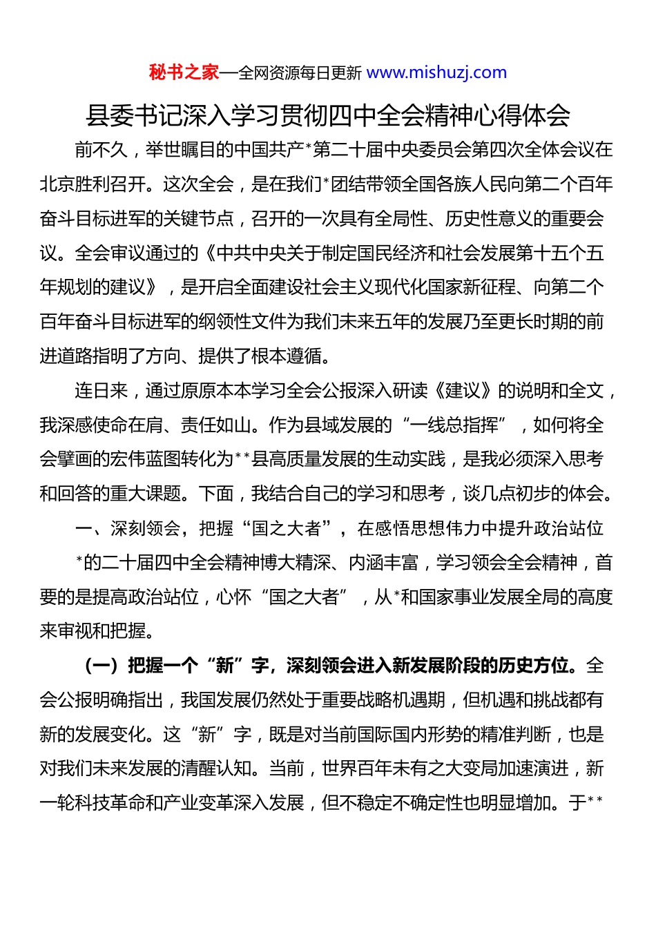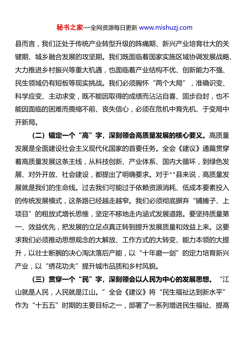 秘书之家—全网资源每日更新 www.mishuzj.com县委书记深入学习贯彻四中全会精神心得体会前不久,举世瞩目的中国共产*第二十届中央委员会第四次全体会议在北京胜利召开。这次全会,是在我们*团结带领全国各族人民向第二个百年奋斗目标进军的关键节点,召开的一次具有全局性、历史性意义的重要会议。全会审议通过的《中共中央关于制定国民经济和社会发展第十五个五年规划的建议》,是开启全面建设社会主义现代化国家新征程、向第二个百年奋斗目标进军的纲领性文件为我们未来五年的发展乃至更长时期的前进道路指明了方向、提供了根本遵循。连日来,通过原原本本学习全会公报深入研读《建议》的说明和全文,我深感使命在肩、责任如山。作为县域发展的“一线总指挥”,如何将全会擘画的宏伟蓝图转化为**县高质量发展的生动实践,是我必须深入思考和回答的重大课题。下面,我结合自己的学习和思考,谈几点初步的体会。一、深刻领会,把握“国之大者”,在感悟思想伟力中提升政治站位*的二十届四中全会精神博大精深、内涵丰富,学习领会全会精神,首要的是提高政治站位,心怀“国之大者”,从*和国家事业发展全局的高度来审视和把握。(一)把握一个“新”字,深刻领会进入新发展阶段的历史方位。全会公报明确指出,我国发展仍然处于重要战略机遇期,但机遇和挑战都有新的发展变化。这“新”字,既是对当前国际国内形势的精准判断,也是对我们未来发展的清醒认知。当前,世界百年未有之大变局加速演进,新一轮科技革命和产业变革深入发展,但不稳定不确定性也明显增加。于**秘书之家—全网资源每日更新 www.mishuzj.com县而言,我们正处于传统产业转型升级的阵痛期、新兴产业培育壮大的关键期、城乡融合发展的攻坚期。我们既面临着国家实施区域协调发展战略、大力推进乡村振兴等重大机遇,也面临着产业结构不优、创新能力不强、民生领域仍有短板等现实挑战。我们必须胸怀“两个大局”,准确识变、科学应变、主动求变,既不能因取得的成绩而沾沾自喜、固步自封,也不能因面临的困难而畏缩不前、丧失信心,必须在危机中育先机、于变局中开新局。(二)锚定一个“高”字,深刻领会高质量发展的核心要义。高质量发展是全面建设社会主义现代化国家的首要任务。全会《建议》通篇贯穿着高质量发展这条主线,从科技创新、产业体系、国内大循环,到绿色发展、对外开放、社会建设,都提出了明确要求。对于**县来说,高质量发展就是我们的生命线。过去我们可能过于依赖资源消耗、低成本要素投入的传统发展模式,这条路已经越走越窄。我们必须彻底摒弃“铺摊子、上项目”的粗放式增长思维,坚定不移地走内涵式发展道路。要坚持质量第一、效益优先,把发展的立足点真正转到提升发展质量和效益上来。这要求我们必须推动思想观念的大解放、工作方式的大转变、能力本领的大提升,以壮士断腕的决心淘汰落后产能,以“十年磨一剑”的定力培育新兴产业,以“绣花功夫”提升城市品质和乡村风貌。(三)贯穿一个“民”字,深刻领会以人民为中心的发展思想。“江山就是人民,人民就是江山。”全会《建议》将“民生福祉达到新水平”作为“十五五”时期的主要目标之一,部署了一系列增进民生福祉、提高秘书之家—全网资源每日更新 www.mishuzj.com人民生活品质的重大举措。这充分彰显了我们*始终不变的为民情怀。作为县委书记,我时刻告诫自己,我们的一切工作,出发点和落脚点都是为了让**的百姓过上更美好的生活。群众的“急难愁盼”就是我们工作的“头等大事”。全县发展成果要更多更公平地惠及全体人民,要让群众看到实实在在的变化、得到真真切切的实惠。我们抓经济、搞建设,最终的检验标准就是看人民群众的获得感、幸福感、安全感是否得到提升。二、对标对表,检视自身不足,在找准短板弱项中明确主攻方向学习贯彻全会精神,不能停留在口号上,必须紧密结合**县的实际,坚持问题导向,清醒地看到我们存在的差距和不足,才能精准发力、靶向施策。(一)在产业能级上,存在“不大不强”的短板。**县的传统支柱产业,如建材、纺织等,近年来虽然有所提升,但总体上仍处于产业链中低端,产品附加值不高,市场...