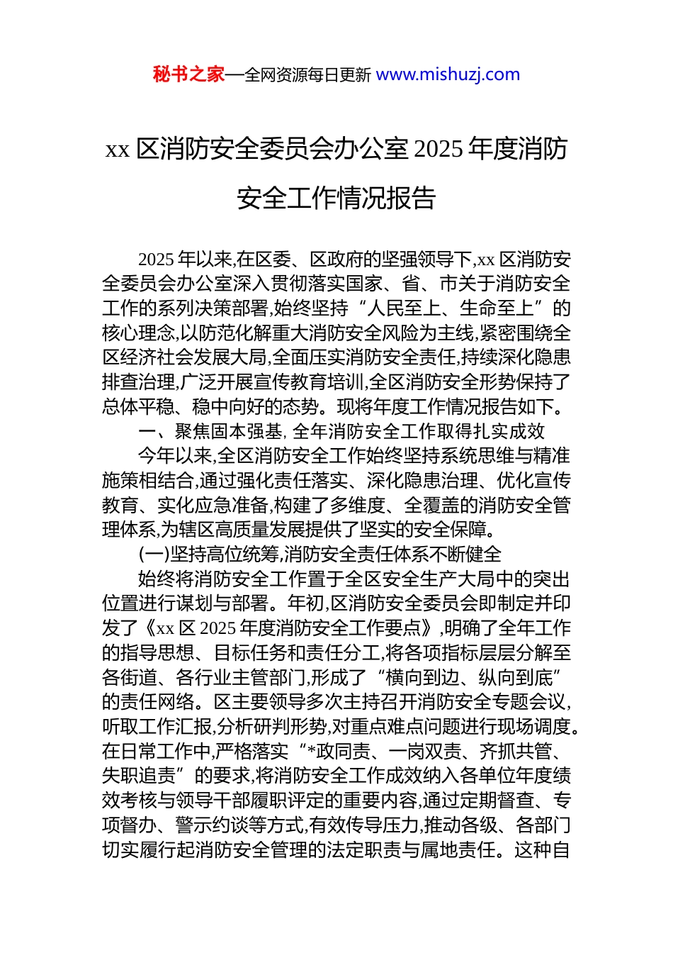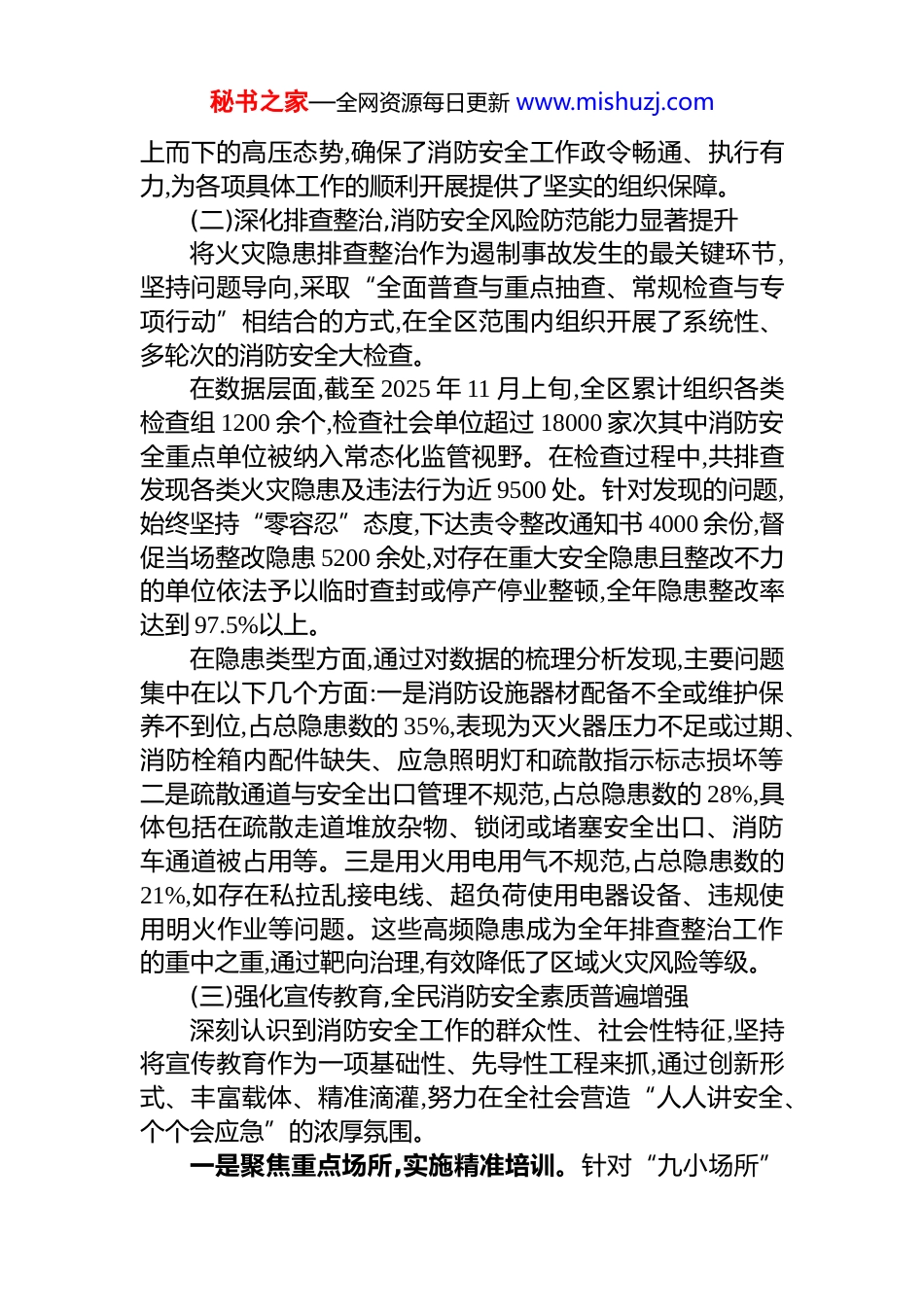 秘书之家—全网资源每日更新 www.mishuzj.comxx 区消防安全委员会办公室 2025 年度消防安全工作情况报告2025 年以来,在区委、区政府的坚强领导下,xx 区消防安全委员会办公室深入贯彻落实国家、省、市关于消防安全工作的系列决策部署,始终坚持“人民至上、生命至上”的核心理念,以防范化解重大消防安全风险为主线,紧密围绕全区经济社会发展大局,全面压实消防安全责任,持续深化隐患排查治理,广泛开展宣传教育培训,全区消防安全形势保持了总体平稳、稳中向好的态势。现将年度工作情况报告如下。一、聚焦固本强基,全年消防安全工作取得扎实成效今年以来,全区消防安全工作始终坚持系统思维与精准施策相结合,通过强化责任落实、深化隐患治理、优化宣传教育、实化应急准备,构建了多维度、全覆盖的消防安全管理体系,为辖区高质量发展提供了坚实的安全保障。(一)坚持高位统筹,消防安全责任体系不断健全始终将消防安全工作置于全区安全生产大局中的突出位置进行谋划与部署。年初,区消防安全委员会即制定并印发了《xx 区 2025 年度消防安全工作要点》,明确了全年工作的指导思想、目标任务和责任分工,将各项指标层层分解至各街道、各行业主管部门,形成了“横向到边、纵向到底”的责任网络。区主要领导多次主持召开消防安全专题会议,听取工作汇报,分析研判形势,对重点难点问题进行现场调度。在日常工作中,严格落实“*政同责、一岗双责、齐抓共管、失职追责”的要求,将消防安全工作成效纳入各单位年度绩效考核与领导干部履职评定的重要内容,通过定期督查、专项督办、警示约谈等方式,有效传导压力,推动各级、各部门切实履行起消防安全管理的法定职责与属地责任。这种自秘书之家—全网资源每日更新 www.mishuzj.com上而下的高压态势,确保了消防安全工作政令畅通、执行有力,为各项具体工作的顺利开展提供了坚实的组织保障。(二)深化排查整治,消防安全风险防范能力显著提升将火灾隐患排查整治作为遏制事故发生的最关键环节,坚持问题导向,采取“全面普查与重点抽查、常规检查与专项行动”相结合的方式,在全区范围内组织开展了系统性、多轮次的消防安全大检查。在数据层面,截至 2025 年 11 月上旬,全区累计组织各类检查组 1200 余个,检查社会单位超过 18000 家次其中消防安全重点单位被纳入常态化监管视野。在检查过程中,共排查发现各类火灾隐患及违法行为近 9500 处。针对发现的问题,始终坚持“零容忍”态度,下达责令整改通知书 4000 余份,督促当场整改隐患 5200 余处,对存在重大安全隐患且整改不力的单位依法予以临时查封或停产停业整顿,全年隐患整改率达到 97.5%以上。在隐患类型方面,通过对数据的梳理分析发现,主要问题集中在以下几个方面:一是消防设施器材配备不全或维护保养不到位,占总隐患数的 35%,表现为灭火器压力不足或过期、消防栓箱内配件缺失、应急照明灯和疏散指示标志损坏等二是疏散通道与安全出口管理不规范,占总隐患数的 28%,具体包括在疏散走道堆放杂物、锁闭或堵塞安全出口、消防车通道被占用等。三是用火用电用气不规范,占总隐患数的21%,如存在私拉乱接电线、超负荷使用电器设备、违规使用明火作业等问题。这些高频隐患成为全年排查整治工作的重中之重,通过靶向治理,有效降低了区域火灾风险等级。(三)强化宣传教育,全民消防安全素质普遍增强深刻认识到消防安全工作的群众性、社会性特征,坚持将宣传教育作为一项基础性、先导性工程来抓,通过创新形式、丰富载体、精准滴灌,努力在全社会营造“人人讲安全、个个会应急”的浓厚氛围。一是聚焦重点场所,实施精准培训。针对“九小场所”秘书之家—全网资源每日更新 www.mishuzj.com点多面广、从业人员流动性大、消防安全基础薄弱的特点,xx 街道 b 于 11 月 13 日专门组织召开了“九小场所”消防安全培训会议。会议通过播放典型火灾案例警示教育片,给与会者带来强烈的视觉冲击和心灵震撼。随后,邀请安全生产专家,结合近年来“九小场所”火灾的特点与规律,系统解读了《中华人民共和国消防法》等法律法规的核心要义,并就如何开展日常防火巡查、如何正确使用消防设施、如何在火灾初期进行有效扑救、如何组...