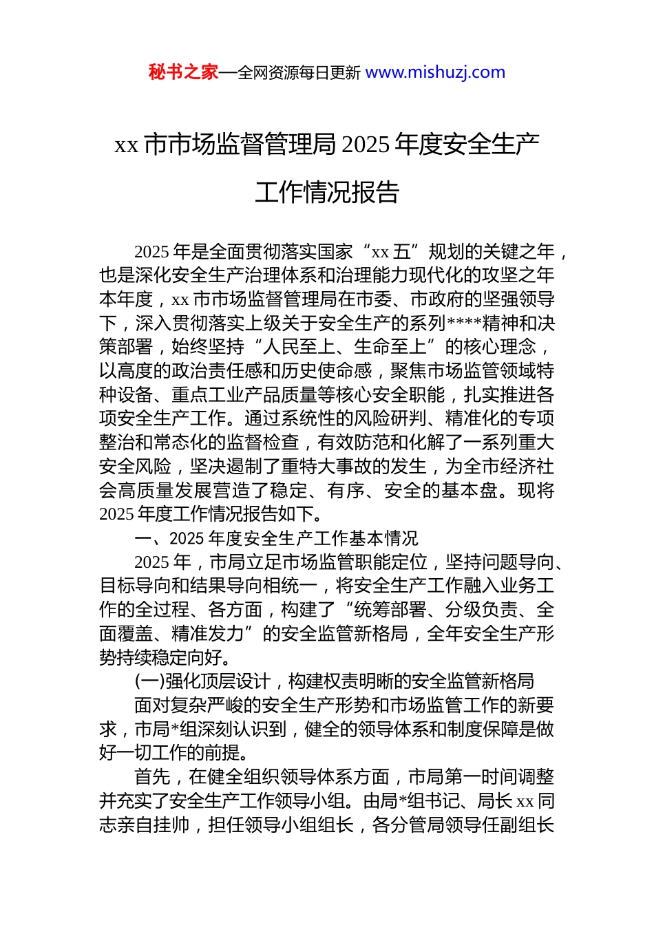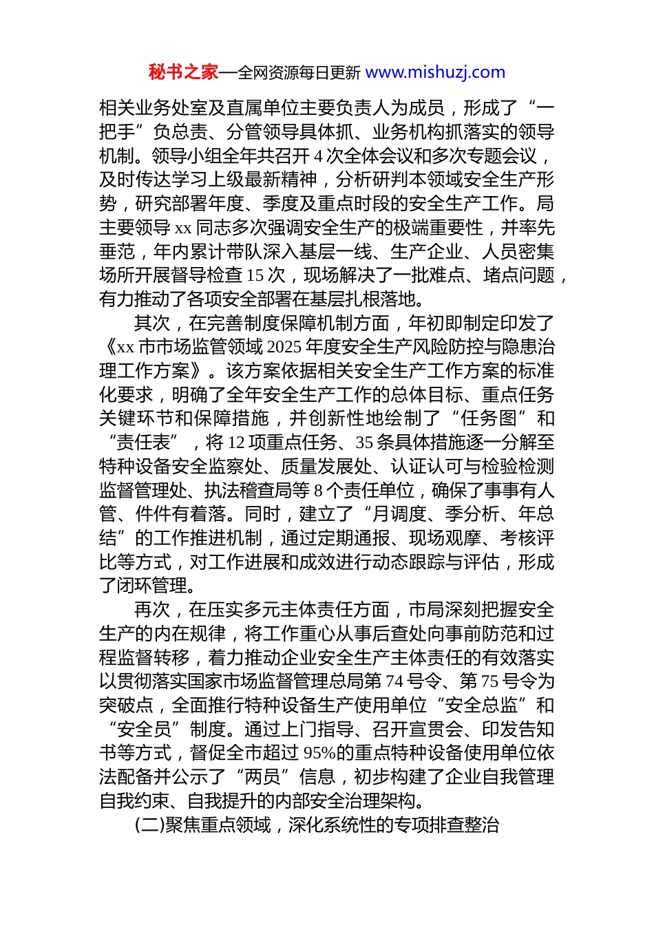 秘书之家—全网资源每日更新 www.mishuzj.comxx 市市场监督管理局 2025 年度安全生产工作情况报告2025 年是全面贯彻落实国家“xx 五”规划的关键之年,也是深化安全生产治理体系和治理能力现代化的攻坚之年本年度,xx 市市场监督管理局在市委、市政府的坚强领导下,深入贯彻落实上级关于安全生产的系列****精神和决策部署,始终坚持“人民至上、生命至上”的核心理念,以高度的政治责任感和历史使命感,聚焦市场监管领域特种设备、重点工业产品质量等核心安全职能,扎实推进各项安全生产工作。通过系统性的风险研判、精准化的专项整治和常态化的监督检查,有效防范和化解了一系列重大安全风险,坚决遏制了重特大事故的发生,为全市经济社会高质量发展营造了稳定、有序、安全的基本盘。现将2025 年度工作情况报告如下。一、2025 年度安全生产工作基本情况2025 年,市局立足市场监管职能定位,坚持问题导向、目标导向和结果导向相统一,将安全生产工作融入业务工作的全过程、各方面,构建了“统筹部署、分级负责、全面覆盖、精准发力”的安全监管新格局,全年安全生产形势持续稳定向好。(一)强化顶层设计,构建权责明晰的安全监管新格局面对复杂严峻的安全生产形势和市场监管工作的新要求,市局*组深刻认识到,健全的领导体系和制度保障是做好一切工作的前提。首先,在健全组织领导体系方面,市局第一时间调整并充实了安全生产工作领导小组。由局*组书记、局长 xx 同志亲自挂帅,担任领导小组组长,各分管局领导任副组长秘书之家—全网资源每日更新 www.mishuzj.com相关业务处室及直属单位主要负责人为成员,形成了“一把手”负总责、分管领导具体抓、业务机构抓落实的领导机制。领导小组全年共召开 4 次全体会议和多次专题会议,及时传达学习上级最新精神,分析研判本领域安全生产形势,研究部署年度、季度及重点时段的安全生产工作。局主要领导 xx 同志多次强调安全生产的极端重要性,并率先垂范,年内累计带队深入基层一线、生产企业、人员密集场所开展督导检查 15 次,现场解决了一批难点、堵点问题,有力推动了各项安全部署在基层扎根落地。其次,在完善制度保障机制方面,年初即制定印发了《xx 市市场监管领域 2025 年度安全生产风险防控与隐患治理工作方案》。该方案依据相关安全生产工作方案的标准化要求,明确了全年安全生产工作的总体目标、重点任务关键环节和保障措施,并创新性地绘制了“任务图”和“责任表”,将 12 项重点任务、35 条具体措施逐一分解至特种设备安全监察处、质量发展处、认证认可与检验检测监督管理处、执法稽查局等 8 个责任单位,确保了事事有人管、件件有着落。同时,建立了“月调度、季分析、年总结”的工作推进机制,通过定期通报、现场观摩、考核评比等方式,对工作进展和成效进行动态跟踪与评估,形成了闭环管理。再次,在压实多元主体责任方面,市局深刻把握安全生产的内在规律,将工作重心从事后查处向事前防范和过程监督转移,着力推动企业安全生产主体责任的有效落实以贯彻落实国家市场监督管理总局第 74 号令、第 75 号令为突破点,全面推行特种设备生产使用单位“安全总监”和“安全员”制度。通过上门指导、召开宣贯会、印发告知书等方式,督促全市超过 95%的重点特种设备使用单位依法配备并公示了“两员”信息,初步构建了企业自我管理自我约束、自我提升的内部安全治理架构。(二)聚焦重点领域,深化系统性的专项排查整治秘书之家—全网资源每日更新 www.mishuzj.com市局坚持“隐患就是事故”的理念,以“零容忍”的态度,针对风险高、隐患多的重点领域和薄弱环节,组织开展了一系列具有针对性和实效性的专项整治行动,以高压态势倒逼安全责任落实。其一,全面开展多领域专项整治行动。参照相关行业领域安全生产专项整治行动的普遍做法结合本市产业特点和风险分布,全年先后组织部署了 8 个重点专项整治行动,实现了对高风险领域的精准打击。这 8 个专项行动分别是:城镇燃气安全“全链条”排查整治行动、电梯安全筑底攻坚行动、大型游乐设施及客运索道安全守护行动、重点工业产品质量安全“清源...