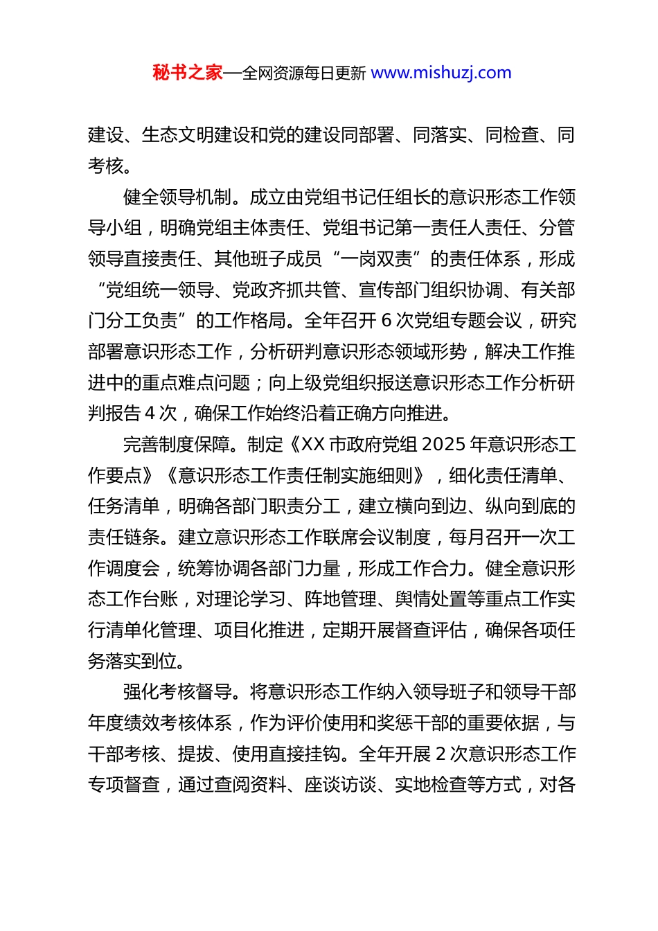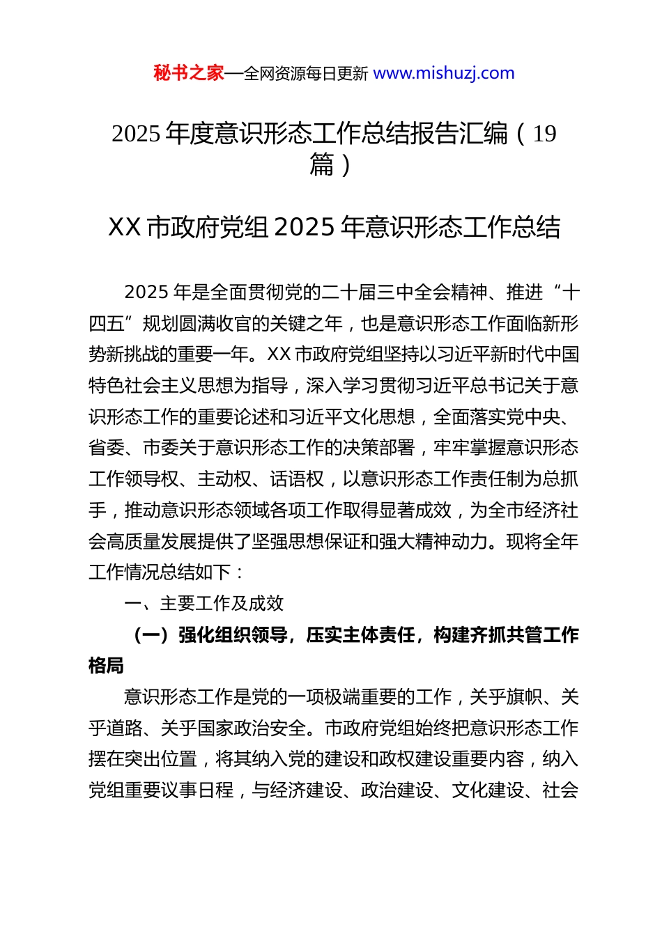 秘书之家—全网资源每日更新 www.mishuzj.com2025 年度意识形态工作总结报告汇编(19篇)XX 市政府党组 2025 年意识形态工作总结2025 年是全面贯彻党的二十届三中全会精神、推进“十四五”规划圆满收官的关键之年,也是意识形态工作面临新形势新挑战的重要一年。XX 市政府党组坚持以习近平新时代中国特色社会主义思想为指导,深入学习贯彻习近平总书记关于意识形态工作的重要论述和习近平文化思想,全面落实党中央、省委、市委关于意识形态工作的决策部署,牢牢掌握意识形态工作领导权、主动权、话语权,以意识形态工作责任制为总抓手,推动意识形态领域各项工作取得显著成效,为全市经济社会高质量发展提供了坚强思想保证和强大精神动力。现将全年工作情况总结如下:一、主要工作及成效(一)强化组织领导,压实主体责任,构建齐抓共管工作格局意识形态工作是党的一项极端重要的工作,关乎旗帜、关乎道路、关乎国家政治安全。市政府党组始终把意识形态工作摆在突出位置,将其纳入党的建设和政权建设重要内容,纳入党组重要议事日程,与经济建设、政治建设、文化建设、社会秘书之家—全网资源每日更新 www.mishuzj.com建设、生态文明建设和党的建设同部署、同落实、同检查、同考核。健全领导机制。成立由党组书记任组长的意识形态工作领导小组,明确党组主体责任、党组书记第一责任人责任、分管领导直接责任、其他班子成员“一岗双责”的责任体系,形成“党组统一领导、党政齐抓共管、宣传部门组织协调、有关部门分工负责”的工作格局。全年召开 6 次党组专题会议,研究部署意识形态工作,分析研判意识形态领域形势,解决工作推进中的重点难点问题;向上级党组织报送意识形态工作分析研判报告 4 次,确保工作始终沿着正确方向推进。完善制度保障。制定《XX 市政府党组 2025 年意识形态工作要点》《意识形态工作责任制实施细则》,细化责任清单、任务清单,明确各部门职责分工,建立横向到边、纵向到底的责任链条。建立意识形态工作联席会议制度,每月召开一次工作调度会,统筹协调各部门力量,形成工作合力。健全意识形态工作台账,对理论学习、阵地管理、舆情处置等重点工作实行清单化管理、项目化推进,定期开展督查评估,确保各项任务落实到位。强化考核督导。将意识形态工作纳入领导班子和领导干部年度绩效考核体系,作为评价使用和奖惩干部的重要依据,与干部考核、提拔、使用直接挂钩。全年开展 2 次意识形态工作专项督查,通过查阅资料、座谈访谈、实地检查等方式,对各秘书之家—全网资源每日更新 www.mishuzj.com部门工作落实情况进行全面检视,发现问题 32 项,现场反馈并督促整改到位。对工作不力、责任落实不到位的 2 个部门进行约谈提醒,切实传导工作压力,确保意识形态工作责任制落到实处。(二)深化理论武装,筑牢思想根基,凝聚奋进磅礴力量坚持把学习贯彻习近平新时代中国特色社会主义思想作为首要政治任务,持续深化理论学习,推动党的创新理论入脑入心、落地生根,不断增强党员干部的政治判断力、政治领悟力、政治执行力。强化中心组领学。严格落实“第一议题”制度,党组理论学习中心组带头学习习近平新时代中国特色社会主义思想、党的二十大和二十届三中全会精神、习近平总书记关于意识形态工作的重要论述和习近平文化思想,全年组织中心组学习 16次,其中意识形态专题研讨 6 次,班子成员带头撰写心得体会、调研报告 24 篇。举办为期 10 天的主题教育读书班,围绕“强化理论武装、筑牢思想根基”“践行习近平文化思想、推动文化高质量发展”等专题开展集中学习研讨,切实发挥中心组示范引领作用。丰富学习形式载体。综合运用集中学习、个人自学、专题讲座、辅导报告、研讨交流、现场教学等多种形式,推动理论学习走深走实。邀请省、市专家学者开展意识形态专题辅导 8场,组织党员干部赴红色教育基地开展现场教学 4 次,传承红秘书之家—全网资源每日更新 www.mishuzj.com色基因、筑牢理想信念。充分运用“学习强国”学习平台、干部网络学院等线上载体,建立学习考核机制,定期通报学习情况,推动理论学习全覆盖、常态化...