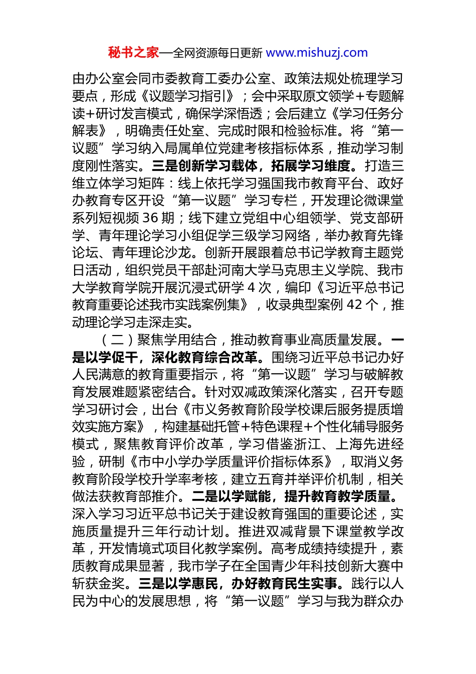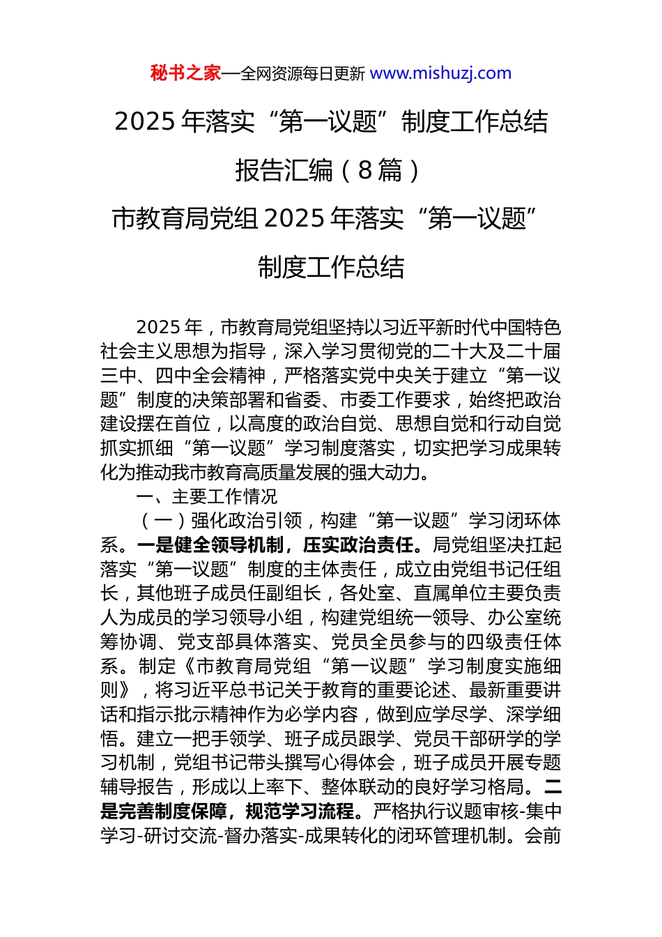 秘书之家—全网资源每日更新 www.mishuzj.com2025 年落实“第一议题”制度工作总结报告汇编(8 篇)市教育局党组 2025 年落实“第一议题”制度工作总结2025 年,市教育局党组坚持以习近平新时代中国特色社会主义思想为指导,深入学习贯彻党的二十大及二十届三中、四中全会精神,严格落实党中央关于建立“第一议题”制度的决策部署和省委、市委工作要求,始终把政治建设摆在首位,以高度的政治自觉、思想自觉和行动自觉抓实抓细“第一议题”学习制度落实,切实把学习成果转化为推动我市教育高质量发展的强大动力。一、主要工作情况(一)强化政治引领,构建“第一议题”学习闭环体系。一是健全领导机制,压实政治责任。局党组坚决扛起落实“第一议题”制度的主体责任,成立由党组书记任组长,其他班子成员任副组长,各处室、直属单位主要负责人为成员的学习领导小组,构建党组统一领导、办公室统筹协调、党支部具体落实、党员全员参与的四级责任体系。制定《市教育局党组“第一议题”学习制度实施细则》,将习近平总书记关于教育的重要论述、最新重要讲话和指示批示精神作为必学内容,做到应学尽学、深学细悟。建立一把手领学、班子成员跟学、党员干部研学的学习机制,党组书记带头撰写心得体会,班子成员开展专题辅导报告,形成以上率下、整体联动的良好学习格局。二是完善制度保障,规范学习流程。严格执行议题审核-集中学习-研讨交流-督办落实-成果转化的闭环管理机制。会前秘书之家—全网资源每日更新 www.mishuzj.com由办公室会同市委教育工委办公室、政策法规处梳理学习要点,形成《议题学习指引》;会中采取原文领学+专题解读+研讨发言模式,确保学深悟透;会后建立《学习任务分解表》,明确责任处室、完成时限和检验标准。将“第一议题”学习纳入局属单位党建考核指标体系,推动学习制度刚性落实。三是创新学习载体,拓展学习维度。打造三维立体学习矩阵:线上依托学习强国我市教育平台、政好办教育专区开设“第一议题”学习专栏,开发理论微课堂系列短视频 36 期;线下建立党组中心组领学、党支部研学、青年理论学习小组促学三级学习网络,举办教育先锋论坛、青年理论沙龙。创新开展跟着总书记学教育主题党日活动,组织党员干部赴河南大学马克思主义学院、我市大学教育学院开展沉浸式研学 4 次,编印《习近平总书记教育重要论述我市实践案例集》,收录典型案例 42 个,推动理论学习走深走实。(二)聚焦学用结合,推动教育事业高质量发展。一是以学促干,深化教育综合改革。围绕习近平总书记办好人民满意的教育重要指示,将“第一议题”学习与破解教育发展难题紧密结合。针对双减政策深化落实,召开专题学习研讨会,出台《市义务教育阶段学校课后服务提质增效实施方案》,构建基础托管+特色课程+个性化辅导服务模式,聚焦教育评价改革,学习借鉴浙江、上海先进经验,研制《市中小学办学质量评价指标体系》,取消义务教育阶段学校升学率考核,建立五育并举评价机制,相关做法获教育部推介。二是以学赋能,提升教育教学质量。深入学习习近平总书记关于建设教育强国的重要论述,实施质量提升三年行动计划。推进双减背景下课堂教学改革,开发情境式项目化教学案例。高考成绩持续提升,素质教育成果显著,我市学子在全国青少年科技创新大赛中斩获金奖。三是以学惠民,办好教育民生实事。践行以人民为中心的发展思想,将“第一议题”学习与我为群众办秘书之家—全网资源每日更新 www.mishuzj.com实事实践活动相结合。针对入学难问题,新建改扩建中小学、幼儿园,新增学位,超额完成年度目标。推进集团化办学改革,组建教育集团,优质教育资源覆盖率提升。落实双减政策,开展学科类培训机构专项治理。建立特殊群体学生帮扶机制,为留守儿童提供学业辅导+心理疏导服务,相关做法被《中国教育报》专题报道。(三)强化督导问效,提升学习制度落实质效。一是严格督导检查。建立月调度、季通报、年考核督导机制,采取四不两直方式开展专项督查 4 次,查阅学习档案,列席支部学习会。开发“第一议题”学习管理平台,实现学习计划、考勤记录、心得体会、成果转化等全程...