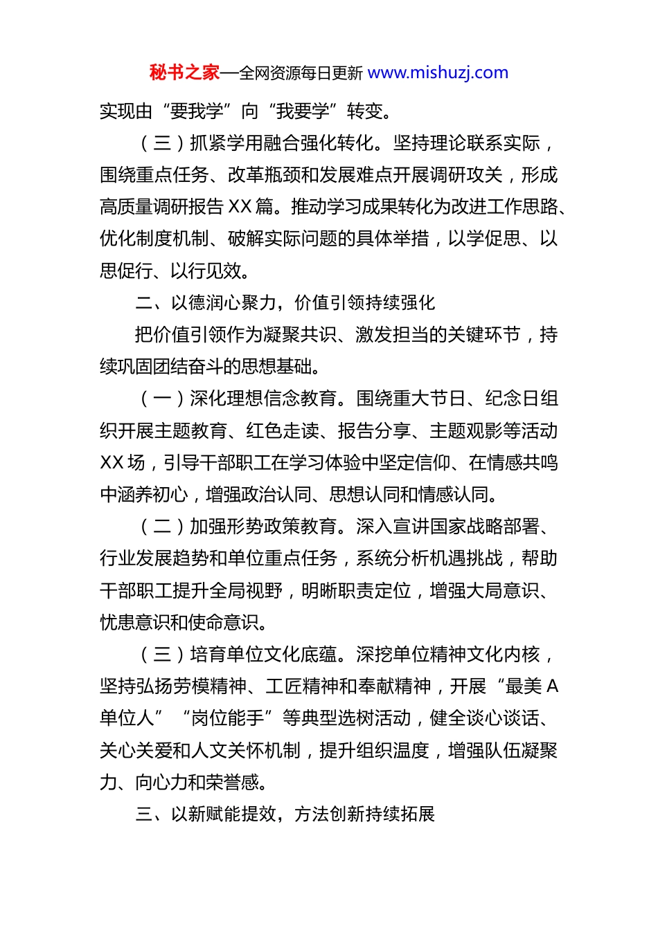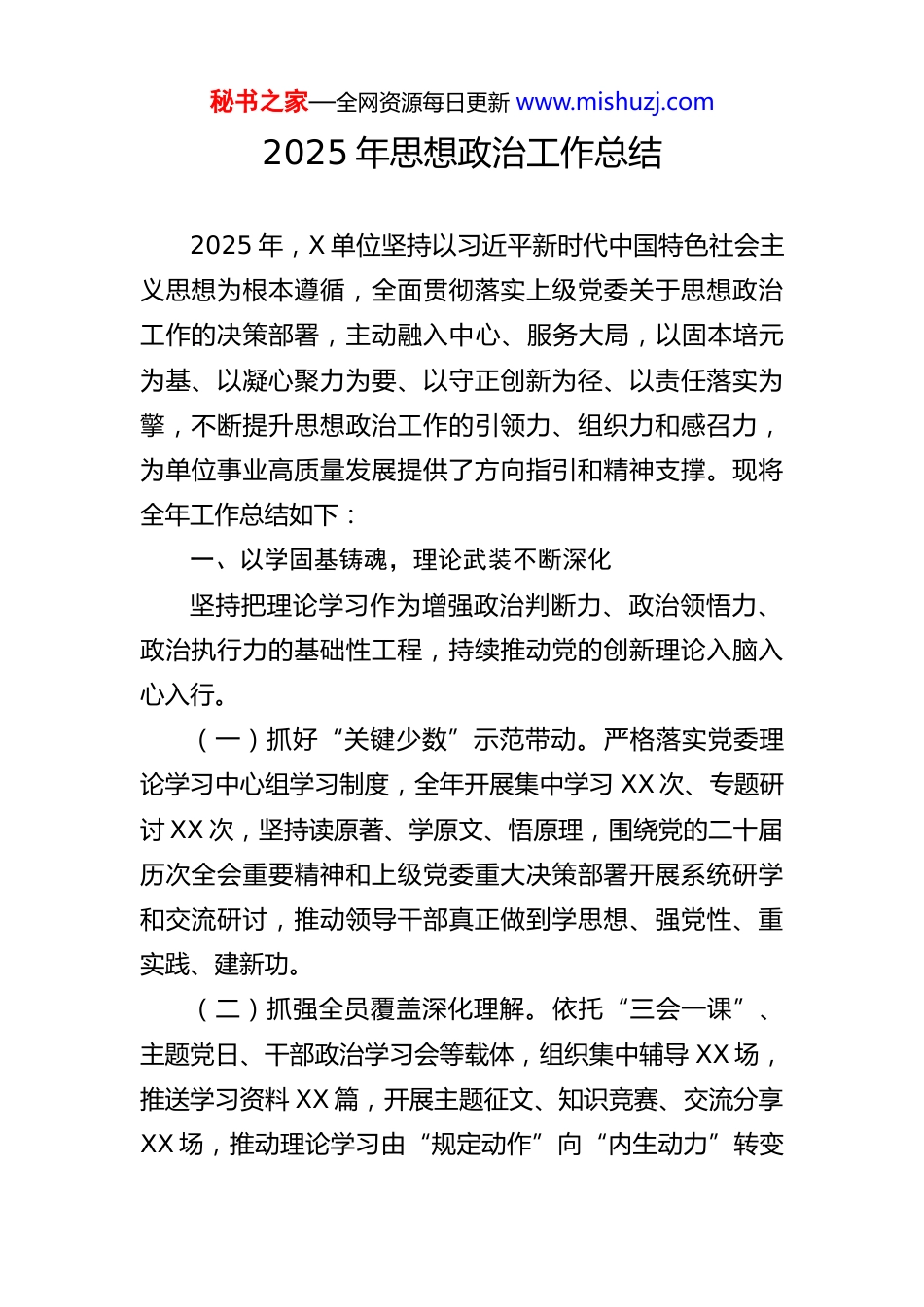 秘书之家—全网资源每日更新 www.mishuzj.com2025 年思想政治工作总结2025 年,X 单位坚持以习近平新时代中国特色社会主义思想为根本遵循,全面贯彻落实上级党委关于思想政治工作的决策部署,主动融入中心、服务大局,以固本培元为基、以凝心聚力为要、以守正创新为径、以责任落实为擎,不断提升思想政治工作的引领力、组织力和感召力,为单位事业高质量发展提供了方向指引和精神支撑。现将全年工作总结如下:一、以学固基铸魂,理论武装不断深化坚持把理论学习作为增强政治判断力、政治领悟力、政治执行力的基础性工程,持续推动党的创新理论入脑入心入行。(一)抓好“关键少数”示范带动。严格落实党委理论学习中心组学习制度,全年开展集中学习 XX 次、专题研讨 XX 次,坚持读原著、学原文、悟原理,围绕党的二十届历次全会重要精神和上级党委重大决策部署开展系统研学和交流研讨,推动领导干部真正做到学思想、强党性、重实践、建新功。(二)抓强全员覆盖深化理解。依托“三会一课”、主题党日、干部政治学习会等载体,组织集中辅导 XX 场,推送学习资料 XX 篇,开展主题征文、知识竞赛、交流分享XX 场,推动理论学习由“规定动作”向“内生动力”转变秘书之家—全网资源每日更新 www.mishuzj.com实现由“要我学”向“我要学”转变。(三)抓紧学用融合强化转化。坚持理论联系实际,围绕重点任务、改革瓶颈和发展难点开展调研攻关,形成高质量调研报告 XX 篇。推动学习成果转化为改进工作思路、优化制度机制、破解实际问题的具体举措,以学促思、以思促行、以行见效。二、以德润心聚力,价值引领持续强化把价值引领作为凝聚共识、激发担当的关键环节,持续巩固团结奋斗的思想基础。(一)深化理想信念教育。围绕重大节日、纪念日组织开展主题教育、红色走读、报告分享、主题观影等活动XX 场,引导干部职工在学习体验中坚定信仰、在情感共鸣中涵养初心,增强政治认同、思想认同和情感认同。(二)加强形势政策教育。深入宣讲国家战略部署、行业发展趋势和单位重点任务,系统分析机遇挑战,帮助干部职工提升全局视野,明晰职责定位,增强大局意识、忧患意识和使命意识。(三)培育单位文化底蕴。深挖单位精神文化内核,坚持弘扬劳模精神、工匠精神和奉献精神,开展“最美 A单位人”“岗位能手”等典型选树活动,健全谈心谈话、关心关爱和人文关怀机制,提升组织温度,增强队伍凝聚力、向心力和荣誉感。三、以新赋能提效,方法创新持续拓展秘书之家—全网资源每日更新 www.mishuzj.com立足传播格局深刻变化和队伍结构多样化实际,持续丰富思想政治工作载体、拓展工作场景、优化表达方式,切实提升教育引导的针对性、覆盖面和感染力。(一)筑牢宣传阵地,强化主流引领。坚持把宣传思想阵地管理作为意识形态工作的基础工程,严格落实网络意识形态责任制,规范运行办公网站、宣传栏、微信等平台,全年发布政策解读、工作动态、典型经验 XX 篇;聚焦先进典型、身边榜样、典型案例开展系列宣传,形成“可看、可学、可用”的示范引导效应。同时,加强舆情风险预警研判和日常巡查管控,做到早发现、早研判、早处置确保意识形态领域始终清朗向上、稳健有序。(二)融合多元载体,增强教育触达。主动适应干部职工学习方式、行为习惯和媒介使用变化,坚持线上线下同步推进、互为补充。线上依托“学习强国”等平台,打造微课程、短视频、直播课堂等特色栏目,提升内容表达的生动度和亲近感;线下组织现场教学、沉浸体验、案例研讨和主题互动等活动,促进思想认识在“看到—思考—内化”中逐级深化,推动教育由“信息传递”走向“思想共鸣”。(三)突出对象导向,精准靶向施教。坚持不同群体不同关注点,不同阶段不同着力点,科学构建分层分类思想政治教育体系。对青年职工,强化理想信念引导、发展路径规划与成长关怀,帮助“扣好职业生涯第一粒扣子”秘书之家—全网资源每日更新 www.mishuzj.com对业务骨干,注重激发责任意识和创新动力,推动能力提升与事业担当相互促动;对老党员、老同志,加强荣誉激励、情感支持与精神关怀,发挥其在传承经验、凝聚队伍稳定思...