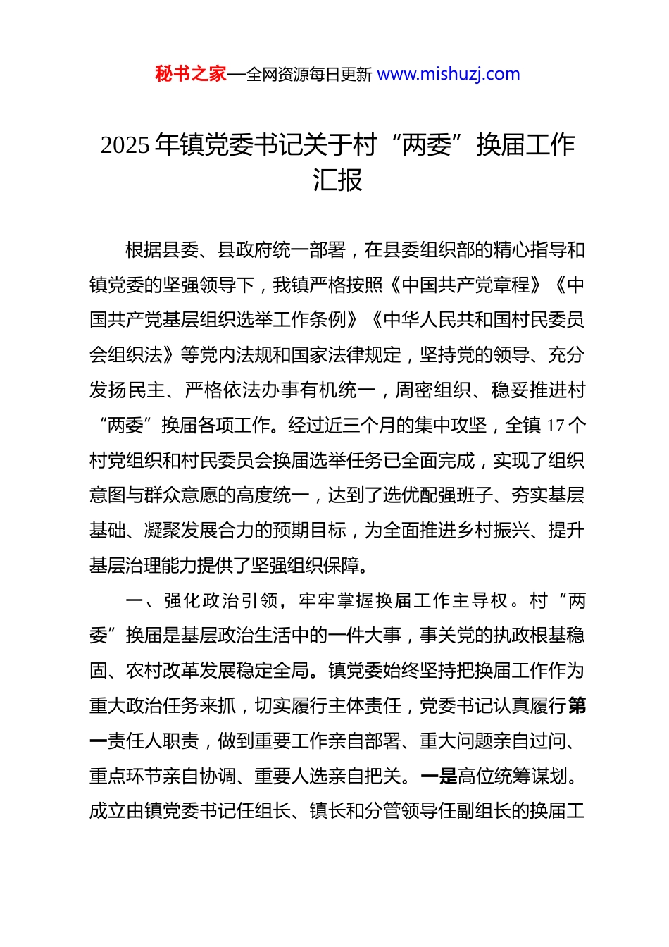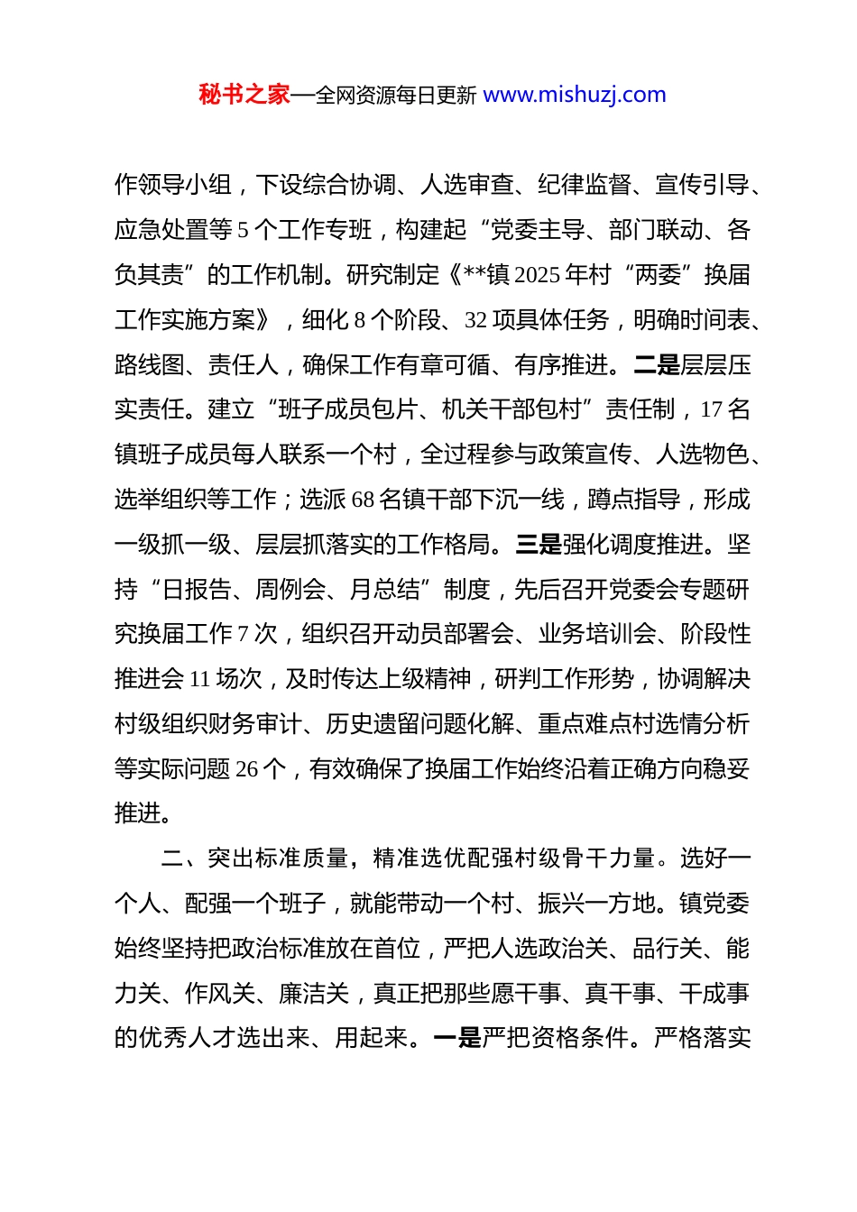 秘书之家—全网资源每日更新 www.mishuzj.com2025 年镇党委书记关于村“两委”换届工作汇报 根据县委、县政府统一部署,在县委组织部的精心指导和镇党委的坚强领导下,我镇严格按照《中国共产党章程》《中国共产党基层组织选举工作条例》《中华人民共和国村民委员会组织法》等党内法规和国家法律规定,坚持党的领导、充分发扬民主、严格依法办事有机统一,周密组织、稳妥推进村“两委”换届各项工作。经过近三个月的集中攻坚,全镇 17 个村党组织和村民委员会换届选举任务已全面完成,实现了组织意图与群众意愿的高度统一,达到了选优配强班子、夯实基层基础、凝聚发展合力的预期目标,为全面推进乡村振兴、提升基层治理能力提供了坚强组织保障。一、强化政治引领,牢牢掌握换届工作主导权。村“两委”换届是基层政治生活中的一件大事,事关党的执政根基稳固、农村改革发展稳定全局。镇党委始终坚持把换届工作作为重大政治任务来抓,切实履行主体责任,党委书记认真履行第一责任人职责,做到重要工作亲自部署、重大问题亲自过问、重点环节亲自协调、重要人选亲自把关。一是高位统筹谋划。成立由镇党委书记任组长、镇长和分管领导任副组长的换届工秘书之家—全网资源每日更新 www.mishuzj.com作领导小组,下设综合协调、人选审查、纪律监督、宣传引导、应急处置等 5 个工作专班,构建起“党委主导、部门联动、各负其责”的工作机制。研究制定《**镇 2025 年村“两委”换届工作实施方案》,细化 8 个阶段、32 项具体任务,明确时间表、路线图、责任人,确保工作有章可循、有序推进。二是层层压实责任。建立“班子成员包片、机关干部包村”责任制,17 名镇班子成员每人联系一个村,全过程参与政策宣传、人选物色、选举组织等工作;选派 68 名镇干部下沉一线,蹲点指导,形成一级抓一级、层层抓落实的工作格局。三是强化调度推进。坚持“日报告、周例会、月总结”制度,先后召开党委会专题研究换届工作 7 次,组织召开动员部署会、业务培训会、阶段性推进会 11 场次,及时传达上级精神,研判工作形势,协调解决村级组织财务审计、历史遗留问题化解、重点难点村选情分析等实际问题 26 个,有效确保了换届工作始终沿着正确方向稳妥推进。二、突出标准质量,精准选优配强村级骨干力量。选好一个人、配强一个班子,就能带动一个村、振兴一方地。镇党委始终坚持把政治标准放在首位,严把人选政治关、品行关、能力关、作风关、廉洁关,真正把那些愿干事、真干事、干成事的优秀人才选出来、用起来。一是严把资格条件。严格落实秘书之家—全网资源每日更新 www.mishuzj.com“双好双强”标准和“十不选”负面清单要求,联合镇纪委、派出所、司法所、综治办、民政办等 10 个部门,对初步人选开展资格联审,累计审查候选人预备人选 89 人,否决不符合条件人选 7 人,坚决防止“带病提名”“带病当选”。二是拓宽选人渠道。坚持“眼睛向下、视野放宽”,注重从本村致富带头人、复员退伍军人、返乡创业青年、大学毕业生中发现优秀人才。通过走访座谈、个别谈话等方式,动员 2 名在外经商办企业且热心家乡建设的能人回村参选,并顺利当选村党支部书记兼村委会主任,实现了“能人回村、强人治村”的良好效果。三是优化班子结构。着眼村级班子长远发展,统筹考虑年龄梯次、学历层次、性别比例和专业背景,着力改善班子整体结构。换届后,村“两委”班子成员平均年龄由上届的 48.6 岁下降至43.2 岁,35 岁以下年轻干部占 21.3%;大专及以上学历占比由32%提升至 54.7%,较上届提高 22.7 个百分点;女性成员占比达 31.6%,较上届上升 8.4 个百分点;每个村均配备至少 1 名35 岁以下全日制大专学历的“两委”成员。实现了年龄结构更趋合理、文化层次明显提升、性别比例持续优化的目标,为村级组织注入了新鲜血液和发展活力。三、严格程序步骤,依法依规推进换届流程。程序正义是实体公正的重要保障。我镇始终坚持依法依规操作,确保每个秘书之家—全网资源每日更新 www.mishuzj.com环节都经得起法律检验、群众评判和历史考验。一是抓实培训指导。围绕换届政...