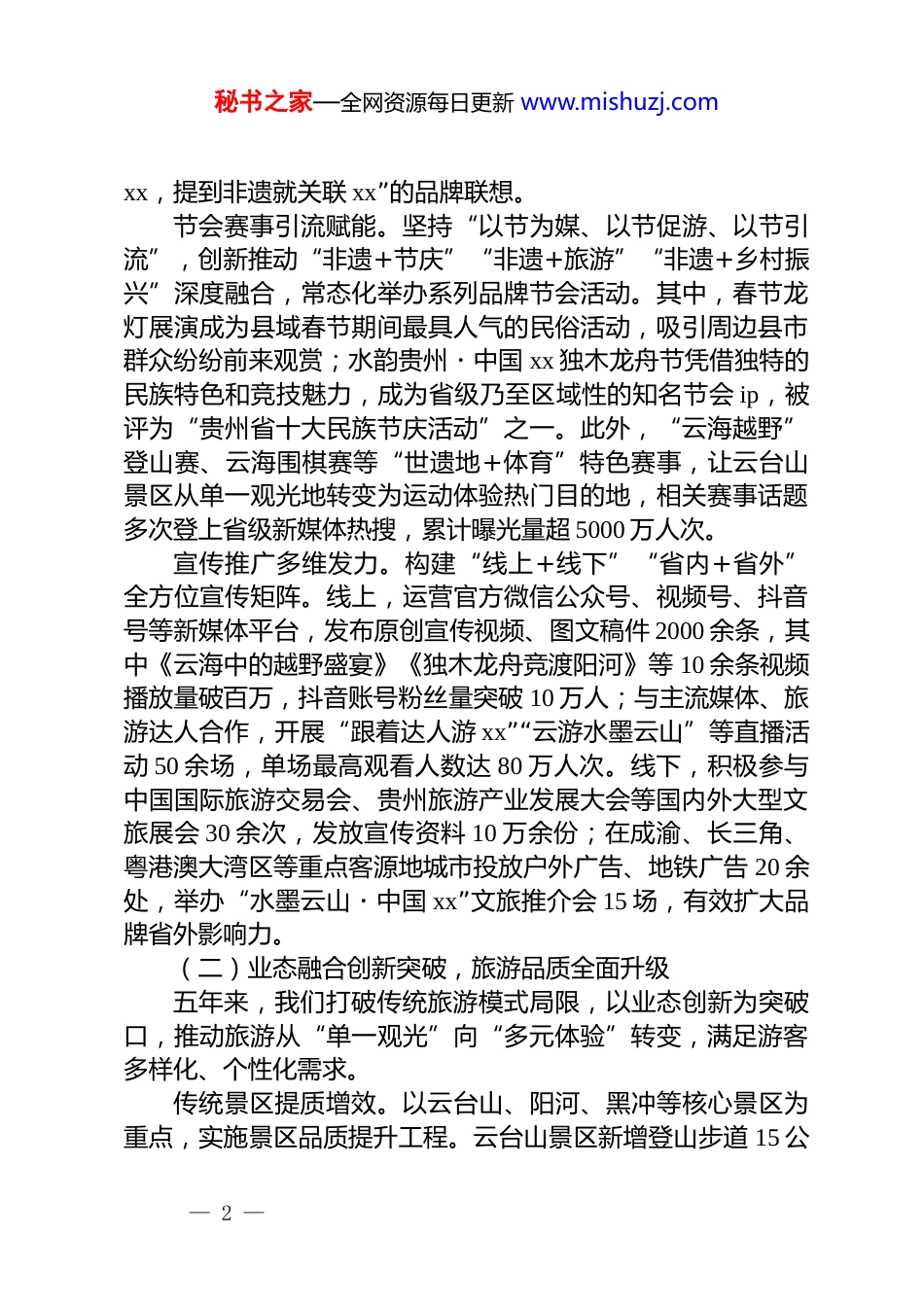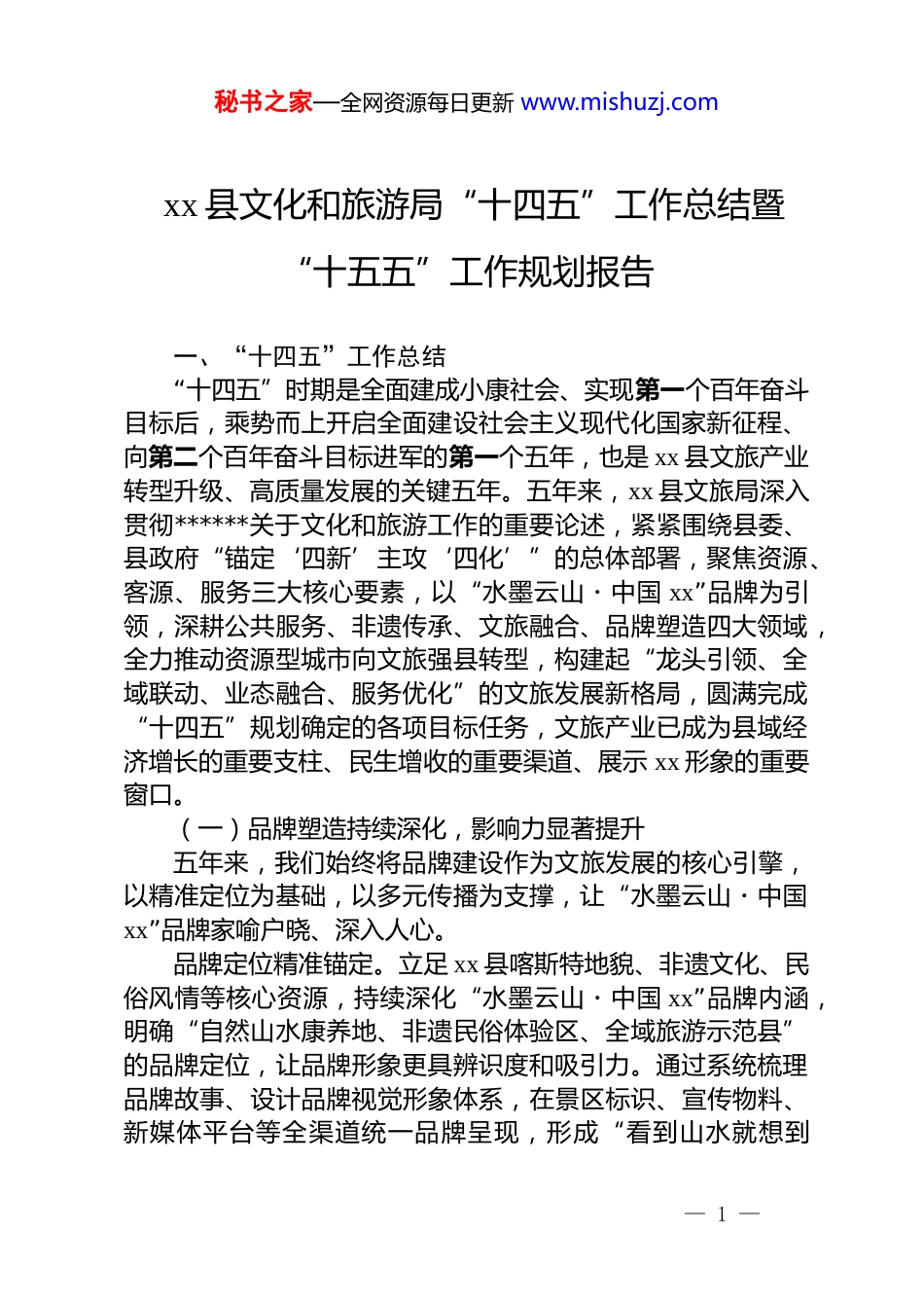 秘书之家—全网资源每日更新 www.mishuzj.comxx 县文化和旅游局“十四五”工作总结暨“十五五”工作规划报告一、“十四五”工作总结“十四五”时期是全面建成小康社会、实现第一个百年奋斗目标后,乘势而上开启全面建设社会主义现代化国家新征程、向第二个百年奋斗目标进军的第一个五年,也是 xx 县文旅产业转型升级、高质量发展的关键五年。五年来,xx 县文旅局深入贯彻******关于文化和旅游工作的重要论述,紧紧围绕县委、县政府“锚定‘四新’主攻‘四化’”的总体部署,聚焦资源、客源、服务三大核心要素,以“水墨云山・中国 xx”品牌为引领,深耕公共服务、非遗传承、文旅融合、品牌塑造四大领域,全力推动资源型城市向文旅强县转型,构建起“龙头引领、全域联动、业态融合、服务优化”的文旅发展新格局,圆满完成“十四五”规划确定的各项目标任务,文旅产业已成为县域经济增长的重要支柱、民生增收的重要渠道、展示 xx 形象的重要窗口。(一)品牌塑造持续深化,影响力显著提升五年来,我们始终将品牌建设作为文旅发展的核心引擎,以精准定位为基础,以多元传播为支撑,让“水墨云山・中国xx”品牌家喻户晓、深入人心。品牌定位精准锚定。立足 xx 县喀斯特地貌、非遗文化、民俗风情等核心资源,持续深化“水墨云山・中国 xx”品牌内涵,明确“自然山水康养地、非遗民俗体验区、全域旅游示范县”的品牌定位,让品牌形象更具辨识度和吸引力。通过系统梳理品牌故事、设计品牌视觉形象体系,在景区标识、宣传物料、新媒体平台等全渠道统一品牌呈现,形成“看到山水就想到— 1 —秘书之家—全网资源每日更新 www.mishuzj.comxx,提到非遗就关联 xx”的品牌联想。节会赛事引流赋能。坚持“以节为媒、以节促游、以节引流”,创新推动“非遗+节庆”“非遗+旅游”“非遗+乡村振兴”深度融合,常态化举办系列品牌节会活动。其中,春节龙灯展演成为县域春节期间最具人气的民俗活动,吸引周边县市群众纷纷前来观赏;水韵贵州・中国 xx 独木龙舟节凭借独特的民族特色和竞技魅力,成为省级乃至区域性的知名节会 ip,被评为“贵州省十大民族节庆活动”之一。此外,“云海越野”登山赛、云海围棋赛等“世遗地+体育”特色赛事,让云台山景区从单一观光地转变为运动体验热门目的地,相关赛事话题多次登上省级新媒体热搜,累计曝光量超 5000 万人次。宣传推广多维发力。构建“线上+线下”“省内+省外”全方位宣传矩阵。线上,运营官方微信公众号、视频号、抖音号等新媒体平台,发布原创宣传视频、图文稿件 2000 余条,其中《云海中的越野盛宴》《独木龙舟竞渡阳河》等 10 余条视频播放量破百万,抖音账号粉丝量突破 10 万人;与主流媒体、旅游达人合作,开展“跟着达人游 xx”“云游水墨云山”等直播活动 50 余场,单场最高观看人数达 80 万人次。线下,积极参与中国国际旅游交易会、贵州旅游产业发展大会等国内外大型文旅展会 30 余次,发放宣传资料 10 万余份;在成渝、长三角、粤港澳大湾区等重点客源地城市投放户外广告、地铁广告 20 余处,举办“水墨云山・中国 xx”文旅推介会 15 场,有效扩大品牌省外影响力。(二)业态融合创新突破,旅游品质全面升级五年来,我们打破传统旅游模式局限,以业态创新为突破口,推动旅游从“单一观光”向“多元体验”转变,满足游客多样化、个性化需求。传统景区提质增效。以云台山、阳河、黑冲等核心景区为重点,实施景区品质提升工程。云台山景区新增登山步道 15 公— 2 —秘书之家—全网资源每日更新 www.mishuzj.com里、观景台 8 个,打造“云海越野”特色赛事场景,配套建设赛事服务中心、补给站等设施,成功创建国家 5a 级景区;阳河景区优化游船线路,新增“非遗文化游船体验”项目,让游客在欣赏山水风光的同时感受非遗魅力;黑冲景区打造露营基地、研学实践基地,新增丛林穿越、星空观测等体验项目,成为年轻人青睐的网红打卡地。截至 2024 年底,全县拥有 5 个 a 级景区,其中 5a 级景区 1 个、4a 级景区 2 个、3a 级景区 2 个,景区品质和吸引力显著提升。“文旅+”跨界融...