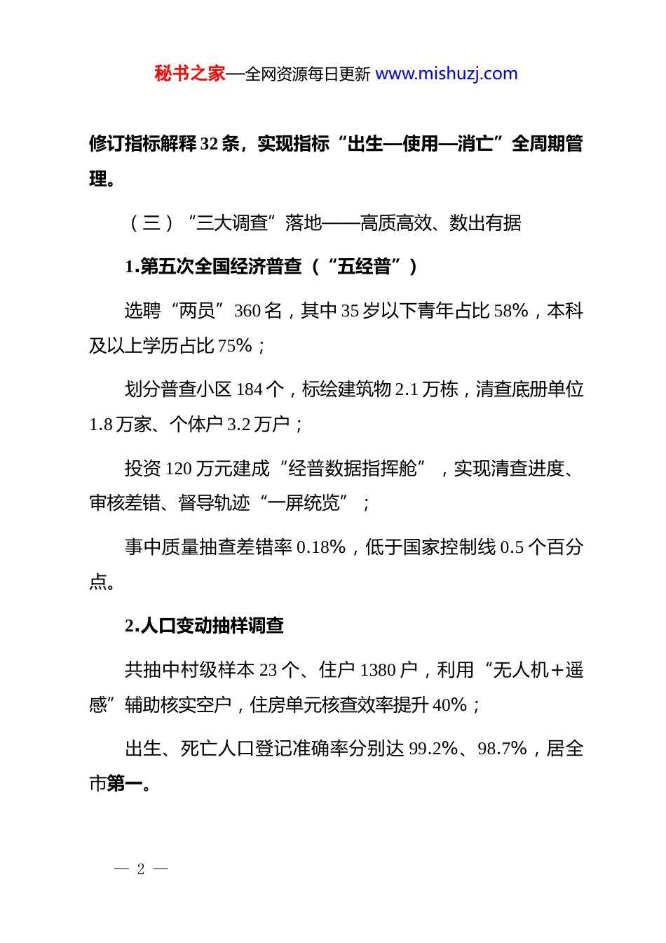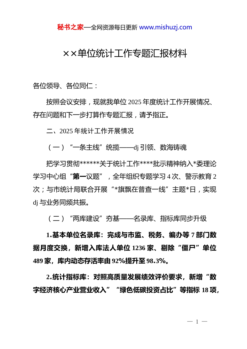 秘书之家—全网资源每日更新 www.mishuzj.com××单位统计工作专题汇报材料各位领导、各位同仁:按照会议安排,现就我单位 2025 年度统计工作开展情况、存在问题和下一步打算作专题汇报,请予指正。二、2025 年统计工作开展情况(一)“一条主线”统揽——dj 引领、数海铸魂把学习贯彻******关于统计工作****批示精神纳入*委理论学习中心组“第一议题”,全年组织专题学习 4 次、警示教育 2次;与市统计局联合开展“*旗飘在普查一线”主题*日,实现dj 与业务同频共振。(二)“两库建设”夯基——名录库、指标库同步升级1.基本单位名录库:完成与市监、税务、编办等 7 部门数据月度交换,新增入库法人单位 1236 家、剔除“僵尸”单位489 家,库内动态存活率由 92%提升至 98.3%。2.统计指标库:对照高质量发展绩效评价要求,新增“数字经济核心产业营业收入”“绿色低碳投资占比”等指标 18 项,— 1 —秘书之家—全网资源每日更新 www.mishuzj.com修订指标解释 32 条,实现指标“出生—使用—消亡”全周期管理。(三)“三大调查”落地——高质高效、数出有据1.第五次全国经济普查(“五经普”)选聘“两员”360 名,其中 35 岁以下青年占比 58%,本科及以上学历占比 75%;划分普查小区 184 个,标绘建筑物 2.1 万栋,清查底册单位1.8 万家、个体户 3.2 万户;投资 120 万元建成“经普数据指挥舱”,实现清查进度、审核差错、督导轨迹“一屏统览”;事中质量抽查差错率 0.18%,低于国家控制线 0.5 个百分点。2.人口变动抽样调查共抽中村级样本 23 个、住户 1380 户,利用“无人机+遥感”辅助核实空户,住房单元核查效率提升 40%;出生、死亡人口登记准确率分别达 99.2%、98.7%,居全市第一。— 2 —秘书之家—全网资源每日更新 www.mishuzj.com3.乡村振兴统计监测创新“一页纸台账”+“随手拍”采集模式,将原来 46 张村级报表压缩至 12 张,填报时间由 3 天缩短到 4 小时;形成《脱贫县农村居民收入监测报告》,获省委副书记批示肯定。(四)“四向协同”赋能——横向到边、纵向到底1.横向协同:与发改、工信、商务共建“经济运行监测专班”,建立“旬报+专报+快报”制度,全年提供即时报表 46期,其中《电子信息产业用工情况快速调查》被市政府采纳并出台稳岗补贴政策。2.纵向联动:县、乡、村三级统计网络全面打通,试点“统计驿站”进村(社区)32 个,配备“云终端+手持 pad”,实现原始数据直报。3.内外协同:与××大学统计学院、××大数据公司签订“政产学研”协议,联合开发“ai 智能编码”工具,地址匹配准确率由 85%提升到 98%。4.线上线下协同:建成“统计 e 家”企业服务平台,注册用 户 8629 家 , 线 上 答 复 统 计 业 务 咨 询 1.1 万 条 , 满 意 率— 3 —秘书之家—全网资源每日更新 www.mishuzj.com99.4%。(五)“五化并举”提质——法治化、标准化、信息化、服务化、品牌化1.法治化:开展“统计法进*校”3 次、进企业园区 18 次,发放普法资料 1.2 万份;立案查处统计违法案件 7 起,罚款金额 63 万元,曝光典型案例 2 起。2.标准化:主导制定《××市数字经济统计核算规范》地方标准,填补省内空白;12 项专业年报通过省级标准化验收。3.信息化:建成“1+3”数据平台(1 个数据资源池、3 大业务系统),实现“报表布置—数据采集—审核汇总—分析应用”全流程线上闭环。4.服务化:打造“数海直通车”品牌,全年撰写《统计专报》28 期,其中《能耗“双控”目标完成情况及预判》获市长批示;《对标分析报告》对标全国 14 个同类城市,提出 36 条赶超建议,采纳率 72%。5.品牌化:创建“数海红帆”dj 品牌,经验做法被《中国信息报》头版报道,并在国家局网站刊发。三、主要指标完成情况(2025 年 1-10 月)— 4 —秘书之家—全网资源每日更新 www.mishuzj.com-gdp:实现地区生产总值 1852.6 亿元,同比增长 6.7%,高于全省 0.9 个百分点;-规上工业增加值:增长 9.1%,居全市第 2;-固定资产投资:增长 8.4%,其中高技术产...