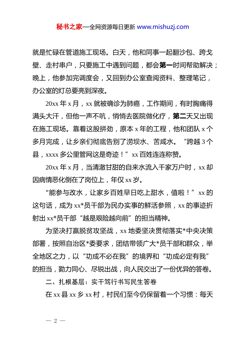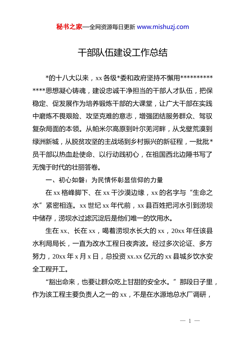 秘书之家—全网资源每日更新 www.mishuzj.com干部队伍建设工作总结*的十八大以来,xx 各级*委和政府坚持不懈用**************思想凝心铸魂,建设忠诚干净担当的干部人才队伍,把保稳定、促发展作为培养锻炼干部的大课堂,让广大干部在实践中磨炼不畏艰险、攻坚克难的意志,增强团结服务群众、驾驭复杂局面的本领。从帕米尔高原到叶尔羌河畔,从戈壁荒漠到绿洲新城,从脱贫攻坚的主战场到乡村振兴的新征程,一批批*员干部以热血赴使命、以行动践初心,在祖国西北边陲书写了无愧于时代的壮丽答卷。一、初心如磐:为民情怀彰显信仰的力量在 xx 格峰脚下、在 xx 干沙漠边缘,xx 的名字与“生命之水”紧密相连。xx 世纪 xx 年代前,xx 县百姓把河水引到涝坝中储存,涝坝水过滤沉淀后是他们唯一的饮用水。生在 xx、长在 xx,喝着涝坝水长大的 xx,20xx 年任该县水利局局长,一直为改水工程日夜奔波。经过多次论证、多方努力,20xx 年 x 月 x 日,总投资 xx.xx 亿元的 xx 县城乡饮水安全工程开工。“豁出命来,也要让群众吃上甘甜的安全水。”那段日子里,作为该工程主要负责人之一的 xx,不是在水源地总水厂调研,— 1 —秘书之家—全网资源每日更新 www.mishuzj.com就是忙碌在管道施工现场。白天,他和同事一起翻沙包、跨戈壁、走村串户,只要施工中遇到问题,都会第一时间帮助解决;晚上,他参加完调度会,又回到办公室查阅资料、整理笔记,办公室的灯总要亮到深夜。20xx 年 x 月,xx 就被确诊为肺癌,工作期间,有时胸痛得满头大汗,但他一声不吭,悄悄去医院做化疗,第二天又出现在施工现场。靠着这股拼劲,原本 x 年的工程,他和团队 x 个多月完成,让乡亲们彻底告别了涝坝水、苦咸水。“跨越 3 个县,xxxx 多公里管网这是奇迹!”xx 百姓连连称赞。20xx 年 x 月,当清澈甘甜的自来水流入千家万户时,xx 却因病情恶化倒在了岗位上,年仅 xx 岁。“能参与改水,让家乡百姓早日吃上甜水,值啦!”xx 的这句话,成为 xx*员干部为民办实事的鲜活参照,xx 的事迹折射出 xx*员干部“越是艰险越向前”的担当精神。为坚决打赢脱贫攻坚战,xx 地委坚决贯彻落实*中央决策部署,按照自治区*委要求,团结带领广大*员干部和群众,举全地区之力,以“功成不必在我”的境界和“功成必定有我”的担当,勠力同心、尽锐出战,向人民交出了一份优异的答卷。二、扎根基层:实干笃行书写民生答卷在 xx 县 xx 乡 xx 村,村民们至今仍保留着一个习惯:每天— 2 —秘书之家—全网资源每日更新 www.mishuzj.com清晨,都要到老村委会——xxx 先进事迹展示馆看看他们的老支书。这位担任村干部 xx 年的“全国最美村官”,用一生践行了“全心全意服务乡亲”的铮铮誓言。在展示馆里,一本荣誉证书摆在 xxx 的遗像旁。这是他生前获得的最后一个荣誉——全国最美村官。xx 生前在该村担任村干部 xx 余年,19xx 年起任村*支部书记、村委会主任。面对科克墩村贫穷落后的面貌,他带领群众改善生产与生活环境,村庄发生了翻天覆地的变化,赢得了村民的拥护和爱戴。该村村民人均纯收入从 19xx 年的不足 xxx 元增加到 20xx年的 xxxx 多元,村民们住上了安居房,告别了无电、无路和长期喝苦水的历史。xx 的笔记本上记满了村民的困难诉求:谁家孩子上学缺学费、谁家老人看病需要帮忙、谁家盖房需要帮手他把自己的收入大都用于帮扶困难群众。陪他一起去 xx 领奖的 xx 说,领完奖的那天,xx 和他聊了很多。有一句话让他印象深刻,xx 说:“个人荣誉没有什么值得骄傲的。我最想做的,是和大伙一起把科克墩村建成最美村庄。”如今的 xx 村,安居房整齐排列,道路也铺上了柏油。一条— 3 —秘书之家—全网资源每日更新 www.mishuzj.com条平坦的道路,就像一条条纽带,把家家户户连接在一起。新建的村委会楼前,修了篮球场和排球场,村里的年轻人一有空就会在这里打篮球、打排球。“干部脚上有土,群众心里不堵。”xx 的事迹只是 xx 基层*员干部“扎根一线、服务群众”的缩影。在 xx 乡村,还有成千上万名像 xx 一样的基层*员干部...