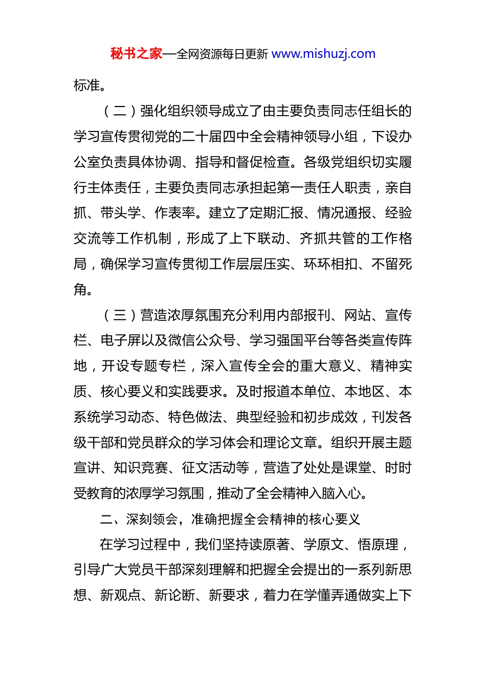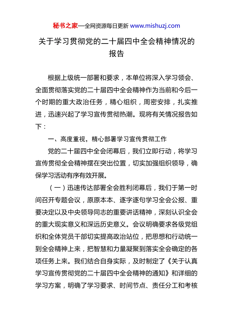 秘书之家—全网资源每日更新 www.mishuzj.com关于学习贯彻党的二十届四中全会精神情况的报告 根据上级统一部署和要求,本单位将深入学习领会、全面贯彻落实党的二十届四中全会精神作为当前和今后一个时期的重大政治任务,精心组织,周密安排,扎实推进,迅速兴起了学习宣传贯彻热潮。现将有关情况报告如下:一、高度重视,精心部署学习宣传贯彻工作党的二十届四中全会闭幕后,我们立即行动,将学习宣传贯彻全会精神摆在突出位置,切实加强组织领导,确保学习活动有序有效开展。(一)迅速传达部署全会胜利闭幕后,我们于第一时间召开专题会议,原原本本、逐字逐句学习全会公报、重要决定以及中央领导同志的重要讲话精神,深刻认识全会的重大现实意义和深远历史意义。会议明确要求各级党组织和全体党员干部切实提高政治站位,把思想和行动统一到全会精神上来,把智慧和力量凝聚到落实全会确定的各项任务上来。我们结合自身实际,及时制定了《关于认真学习宣传贯彻党的二十届四中全会精神的通知》和详细的学习方案,明确了学习要求、时间节点、责任分工和考核秘书之家—全网资源每日更新 www.mishuzj.com标准。(二)强化组织领导成立了由主要负责同志任组长的学习宣传贯彻党的二十届四中全会精神领导小组,下设办公室负责具体协调、指导和督促检查。各级党组织切实履行主体责任,主要负责同志承担起第一责任人职责,亲自抓、带头学、作表率。建立了定期汇报、情况通报、经验交流等工作机制,形成了上下联动、齐抓共管的工作格局,确保学习宣传贯彻工作层层压实、环环相扣、不留死角。(三)营造浓厚氛围充分利用内部报刊、网站、宣传栏、电子屏以及微信公众号、学习强国平台等各类宣传阵地,开设专题专栏,深入宣传全会的重大意义、精神实质、核心要义和实践要求。及时报道本单位、本地区、本系统学习动态、特色做法、典型经验和初步成效,刊发各级干部和党员群众的学习体会和理论文章。组织开展主题宣讲、知识竞赛、征文活动等,营造了处处是课堂、时时受教育的浓厚学习氛围,推动了全会精神入脑入心。二、深刻领会,准确把握全会精神的核心要义在学习过程中,我们坚持读原著、学原文、悟原理,引导广大党员干部深刻理解和把握全会提出的一系列新思想、新观点、新论断、新要求,着力在学懂弄通做实上下秘书之家—全网资源每日更新 www.mishuzj.com功夫。(一)深刻认识新时代取得的重大成就通过学习,广大党员干部深刻认识到,党的十八大以来,党和国家事业取得历史性成就、发生历史性变革,根本在于党中央的坚强领导和科学理论的正确指引。这些成就的取得,为开启全面建设社会主义现代化国家新征程奠定了坚实基础,也更加坚定了我们沿着中国特色社会主义道路坚定不移走下去的信心和决心。大家一致认为,我国发展仍处于重要战略机遇期,经济长期向好的基本面没有改变,2025 年前*季度,国民经济持续恢复向好,高质量发展扎实推进,展现了强大的韧性和活力。(二)准确把握当前发展面临的形势任务我们引导党员干部清醒认识到,当前世界百年未有之大变局加速演进,国内改革发展稳定任务艰巨繁重。全会科学分析了国内外形势,明确了当前和今后一个时期工作的总体要求、主要目标和重点任务。通过学习,大家增强了忧患意识,树立了底线思维,明确了在复杂严峻形势下保持战略定力、集中精力办好自己事情的重要性,更加自觉地服务于国家发展大局。例如,在讨论中,同志们结合*领域面临的新挑战新任务,提出了贯彻落实全会精神、破解发展难题的思路举措。秘书之家—全网资源每日更新 www.mishuzj.com(三)深入理解中国式现代化的内涵特征全会对中国式现代化的理论体系和实践路径进行了深刻阐述和全面部署。我们组织专题学习,引导党员干部深刻理解中国式现代化的中国特色、本质要求和重大原则,认识到这是强国建设、民族复兴的唯一正确道路。大家围绕如何在各自岗位上推进中国式现代化的*实践进行了深入研讨,增强了以中国式现代化全面推进中华民族伟大复兴的历史自觉和行动自觉。特别针对全会就完善社会治理、推进文化自信自强、促进共同富裕等作出的新部署,结合*市在 2025 年启...