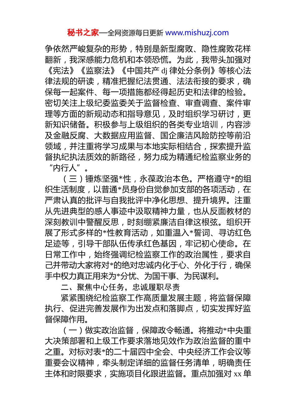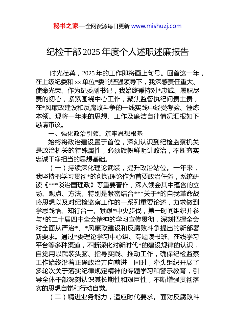 秘书之家—全网资源每日更新 www.mishuzj.com纪检干部 2025 年度个人述职述廉报告 时光荏苒,2025 年的工作即将画上句号。回首这一年,在上级纪委和 xx 单位*委的坚强领导下,我深感责任重大、使命光荣。作为纪委副书记,我始终秉持对*忠诚、履职尽责的初心,紧紧围绕中心工作,聚焦监督执纪问责主责,在*风廉政建设和反腐败斗争的一线实践中经受考验、锤炼本领。现将一年来的思想、工作及廉洁自律情况汇报如下恳请审议。 一、强化政治引领,筑牢思想根基始终将政治建设置于首位,深刻认识到纪检监察机关是政治机关的特殊属性,必须旗帜鲜明讲政治,不断夯实忠诚干净担当的思想基础。(一)持续深化理论武装,提升政治站位。一年来,我坚持把学习贯彻*的创新理论作为首要政治任务,系统研读《***谈治国理政》等重要著作,深入领会其中蕴含的立场、观点、方法。特别是紧密结合***关于*的自我革命战略思想以及对纪检监察工作的一系列重要论述,力求做到学思践悟、知行合一。紧跟*中央步伐,第一时间组织并参与*的二十届四中全会精神的学习宣传贯彻,深刻把握全会对全面从严治*、*风廉政建设和反腐败斗争提出的新部署新要求。通过*委理论学习中心组、专题读书班、在线学习平台等多种渠道,不断深化对新时代*的建设规律的认识,自觉用以武装头脑、指导实践、推动工作,确保纪检监察工作始终沿着正确政治方向前进。同时,牵头组织开展了多轮次关于落实纪律规定精神的专题学习和警示教育,引导全体干部深刻认识其长期性和艰巨性,不断增强贯彻落实的思想自觉和行动自觉。(二)精进业务能力,适应时代要求。面对反腐败斗秘书之家—全网资源每日更新 www.mishuzj.com争依然严峻复杂的形势,特别是新型腐败、隐性腐败花样翻新,我深感能力危机和本领恐慌。为此,我带头加强对《宪法》《监察法》《中国共产 dj 律处分条例》等核心法律法规的研读,精准把握纪法贯通、法法衔接的要求,确保每一起案件、每一项措施都经得起历史和法律的检验。密切关注上级纪委监委关于监督检查、审查调查、案件审理等方面的新规动态和指导意见,及时组织学习研讨,更新知识储备。积极参与上级组织的各类专业培训,内容涉及金融反腐、大数据应用监督、国企廉洁风险防控等前沿领域,并注重将学习成果与本地实际相结合,探索提升监督执纪执法质效的新路径,努力成为精通纪检监察业务的“内行人”。(三)锤炼坚强*性,永葆政治本色。严格遵守*的组织生活制度,以普通*员身份自觉参加支部的各项活动,在严肃认真的批评与自我批评中净化思想、提升境界。注重从先进典型的感人事迹中汲取精神力量,也从反面教材的深刻教训中警醒反思,时刻绷紧廉洁自律这根弦。组织开展了形式多样的*性教育活动,如重温入*誓词、寻访红色足迹等,引导干部队伍传承红色基因,牢记初心使命。在日常工作中,始终强调纪检监察工作的政治属性,要求自己并带动大家将对*的绝对忠诚内化于心、外化于行,确保手中权力真正用来为*分忧、为国干事、为民谋利。二、聚焦中心任务,忠诚履职尽责紧紧围绕纪检监察工作高质量发展主题,将监督保障执行、促进完善发展作为出发点和落脚点,切实发挥好监督保障作用。(一)做实政治监督,保障政令畅通。将推动*中央重大决策部署和上级工作要求落地见效作为政治监督的重中之重。对标对表*的二十届四中全会、中央经济工作会议等重要会议精神,牵头制定详细的监督任务清单,明确责任主体和时限要求,实施项目化跟进监督。重点加强对 xx 单秘书之家—全网资源每日更新 www.mishuzj.com位*委落实全面从严治*主体责任情况的监督检查,通过定期约谈、专项督查等方式,压紧压实管*治*政治责任。围绕区域重大战略实施、重点工程项目推进、营商环境优化等关键领域,深入开展专项监督,坚决纠治有令不行、有禁不止以及不作为、慢作为、乱作为等问题。据统计,年内牵头或参与开展政治监督专项检查 xx 轮,推动整改相关问题 xx 个,有效清除了政策落实的“中梗阻”。(二)做细日常监督,防控廉政风险。坚持抓早抓小、防微杜渐,把监督融入日常、做在经常。综合运用列席会议、谈心谈话、查阅资料、...