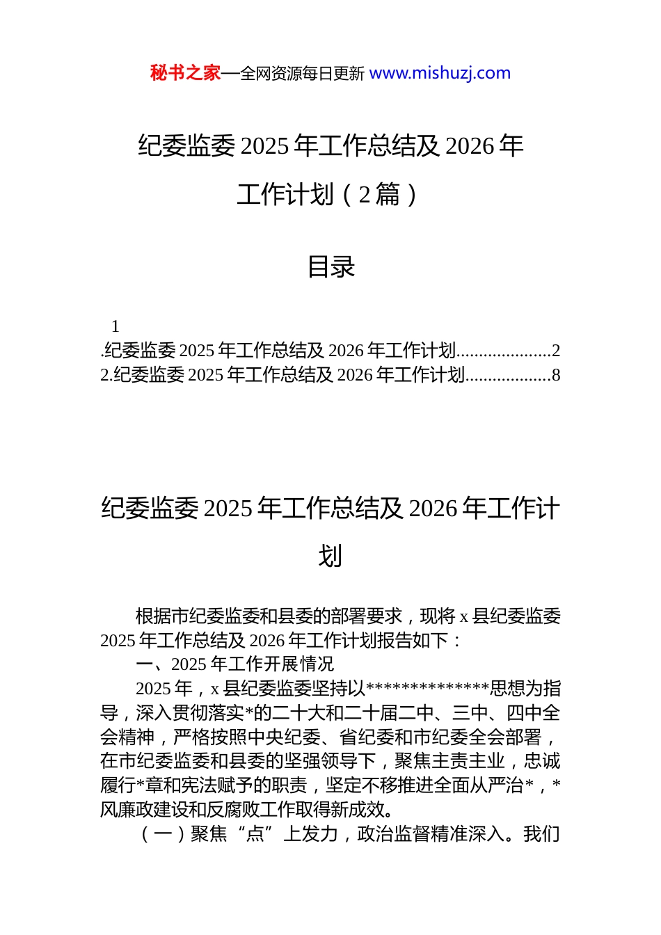 秘书之家—全网资源每日更新 www.mishuzj.com纪委监委 2025 年工作总结及 2026 年工作计划(2 篇)目录1.纪委监委 2025 年工作总结及 2026 年工作计划.....................22.纪委监委 2025 年工作总结及 2026 年工作计划...................8纪委监委 2025 年工作总结及 2026 年工作计划根据市纪委监委和县委的部署要求,现将 x 县纪委监委2025 年工作总结及 2026 年工作计划报告如下:一、2025 年工作开展情况2025 年,x 县纪委监委坚持以**************思想为指导,深入贯彻落实*的二十大和二十届二中、三中、四中全会精神,严格按照中央纪委、省纪委和市纪委全会部署,在市纪委监委和县委的坚强领导下,聚焦主责主业,忠诚履行*章和宪法赋予的职责,坚定不移推进全面从严治*,*风廉政建设和反腐败工作取得新成效。(一)聚焦“点”上发力,政治监督精准深入。我们秘书之家—全网资源每日更新 www.mishuzj.com始终把“两个维护”作为最高政治原则,着力在政治监督的具体化、精准化、常态化上下功夫。要紧紧围绕“国之大者”,将*中央重大决策部署和省委、市委工作要求,与本县中心工作紧密结合,建立“一台账、两清单、双责任双问责”监督机制。针对优化营商环境、推进乡村振兴、黄河流域生态保护和高质量发展等重点工作,开展专项监督检查 x 余次,发现并督促整改问题 x 余个,确保政令畅通。要加强对“关键少数”特别是“一把手”的监督,综合运用谈心谈话、列席会议、查阅廉政档案等方式,开展各类谈心谈话提醒 x 人次,让红脸出汗成为常态。要深化专项整治,对省委巡视反馈问题整改情况进行“嵌入式”监督,严肃查处在执行中打折扣、搞变通等问题 x 起,保障整改落地见效。(二)围绕“线”上延伸,正风反腐协同推进。我们坚持*性*风 dj 一起抓,以严的基调正风肃纪,以零容忍态度惩贪治腐。要锲而不舍落实中央八项规定精神,紧盯中秋、国庆等重要节点,通过下发通知、发送廉政短信、通报案例等方式提前预警,组织明察暗访 x 轮次,严查违规吃喝、违规收送礼品礼金等问题,查处相关问题 x 起,处理 x人。要重点整治“庸懒散奢”及不作为、乱作为、慢作为等作风顽疾,查处相关问题 x 起,处理 x 人,推动干部作风持续向好。要保持反腐高压态势,坚持风腐同查同治,聚焦金融、国企、工程建设、医药等重点领域,立案查处违纪违法案件 x 件,处分 x 人,移送司法 x 人,挽回经济损失x 万元。要深化以案促改促治,协助县委出台《关于进一步规范*员干部操办婚丧喜庆事宜的规定》等制度 x 项,努力做到查处一案、警示一片、治理一域。(三)着眼“面”上覆盖,队伍建设提质增效。我们以规范化、法治化、正规化建设为抓手,努力锻造高素质专业化纪检监察铁军。要创新培养机制,全面推行政治与业务“双导师制”,为 x 名新进和岗位交流干部精准配备导秘书之家—全网资源每日更新 www.mishuzj.com师,建立帮带成长档案,推动年轻干部在监督检查、审查调查一线历练成长。要强化理论武装,依托青年理论学习小组,开展“六学联动”活动 x 次,举办“清风青年”宣讲x 场,不断提升干部政治能力和理论素养。要健全内控机制,严格执行打听案情、过问案件、说情干预报告登记,以及“十必谈”“十必报”等制度,加强对干部“八小时内外”的监督,开展内部督查 x 次,严防“灯下黑”。要关心关爱干部,落实谈心谈话、家访慰问等举措,激发干部干事创业内生动力。二、存在的问题与不足在肯定成绩的同时,我们也清醒地认识到,对照上级要求和群众期盼,工作中还存在一些短板和不足。(一)监督执纪精度有待提升。政治监督在融入业务、破解深层次问题方面,方式方法还不够丰富,有时存在“上下一般粗”现象,精准发现问题的能力有待加强。例如,在优化营商环境监督中,对一些隐性壁垒和新出现问题的洞察力还需提高。“四种形态”运用特别是第一种形态的运用,有时还不够充分、不够规范,政策把握水平需要进一步锤炼。(二)基层监督效能有待增强。虽然实现了县、乡、村三级监督网络覆盖,但基层监督力量相对薄弱,部分乡镇纪检监...