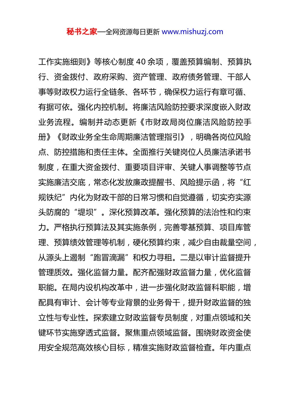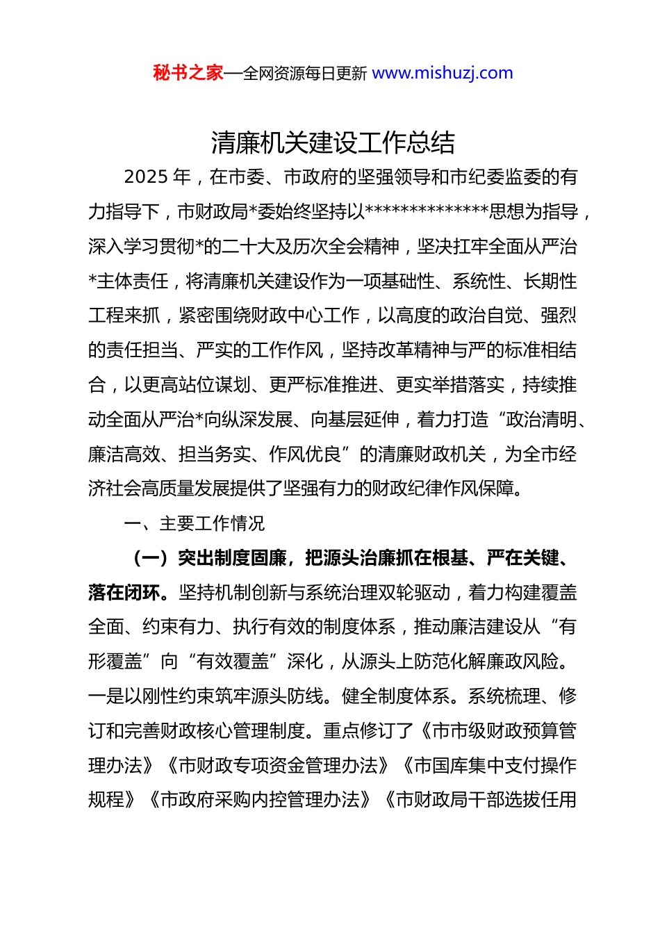 秘书之家—全网资源每日更新 www.mishuzj.com清廉机关建设工作总结2025 年,在市委、市政府的坚强领导和市纪委监委的有力指导下,市财政局*委始终坚持以**************思想为指导,深入学习贯彻*的二十大及历次全会精神,坚决扛牢全面从严治*主体责任,将清廉机关建设作为一项基础性、系统性、长期性工程来抓,紧密围绕财政中心工作,以高度的政治自觉、强烈的责任担当、严实的工作作风,坚持改革精神与严的标准相结合,以更高站位谋划、更严标准推进、更实举措落实,持续推动全面从严治*向纵深发展、向基层延伸,着力打造“政治清明、廉洁高效、担当务实、作风优良”的清廉财政机关,为全市经济社会高质量发展提供了坚强有力的财政纪律作风保障。一、主要工作情况(一)突出制度固廉,把源头治廉抓在根基、严在关键、落在闭环。坚持机制创新与系统治理双轮驱动,着力构建覆盖全面、约束有力、执行有效的制度体系,推动廉洁建设从“有形覆盖”向“有效覆盖”深化,从源头上防范化解廉政风险。一是以刚性约束筑牢源头防线。健全制度体系。系统梳理、修订和完善财政核心管理制度。重点修订了《市市级财政预算管理办法》《市财政专项资金管理办法》《市国库集中支付操作规程》《市政府采购内控管理办法》《市财政局干部选拔任用秘书之家—全网资源每日更新 www.mishuzj.com工作实施细则》等核心制度 40 余项,覆盖预算编制、预算执行、资金拨付、政府采购、资产管理、政府债务管理、干部人事等财政权力运行全链条、各环节,确保权力运行有章可循、有据可依。强化内控机制。将廉洁风险防控要求深度嵌入财政业务流程。编制并动态更新《市财政局岗位廉洁风险防控手册》《财政业务全生命周期廉洁管理指引》,明确各岗位风险点、防控措施和责任主体。全面推行关键岗位人员廉洁承诺书制度,在重大资金拨付、重要项目评审、关键人事调整等节点实施廉洁交底,常态化发放廉政提醒书、风险提示函,将“红规铁纪”内化为财政干部的日常习惯和自觉遵循,切实夯实源头防腐的“堤坝”。深化预算改革。强化预算的法治性和约束力。严格执行预算法及其实施条例,完善零基预算、项目库管理、预算绩效管理等机制,硬化预算约束,减少自由裁量空间,从源头上遏制“跑冒滴漏”和权力寻租。二是以审计监督提升管理质效。强化监督力量。配齐配强财政监督力量,优化监督职能。在局内设机构改革中,进一步强化财政监督科职能,增配具有审计、会计等专业背景的业务骨干,提升财政监督的独立性与专业性。探索建立财政监督专员制度,对重点领域和关键环节实施穿透式监督。聚焦重点领域监督。围绕财政资金使用安全规范高效核心目标,精准实施财政监督检查。年内重点秘书之家—全网资源每日更新 www.mishuzj.com开展了直达资金管理使用情况专项检查、地方政府债务风险化解及合规性审计调查、政府采购领域突出问题专项整治“回头看”、市级行政事业单位国有资产管理绩效评价、重点民生项目资金绩效审计等 15 项专项监督检查,覆盖市本级及部分县区财政、重点预算单位。强化结果运用与整改闭环。坚持问题导向,强化监督成果转化。通过监督检查,推动被检查单位建立健全内控制度 12 项,优化完善资金拨付、项目审批、资产处置等业务流程 28 项,督促加快项目执行进度和资金拨付效率,涉及资金规模超 10 亿元。对发现的违规违纪线索,严格按规定程序移送纪检监察机关。建立问题整改台账,实行销号管理,确保审计监督揭示的问题条条整改、件件落实,切实发挥财政监督“治已病、防未病”的建设性作用。三是以协同监督压实责任链条。深化“纪财”联动。建立健全局机关纪委与财政监督、预算、国库、采购等业务科室的常态化协同监督机制。定期召开联席会议,实现信息互通、问题同查、线索共享、整改同督。年内通过联动机制,共同推动完成巡视巡察反馈问题、审计发现问题、日常监督发现问题等整改落实共计 65 项。创新监督方式。在重大财政政策落实、重点专项资金检查、重要干部选拔任用等工作中,探索实施“进点明廉、驻点督廉、撤点验廉”的嵌入式、全过程廉洁管理模式。在重点检查组设秘书之家—全网资源每...
