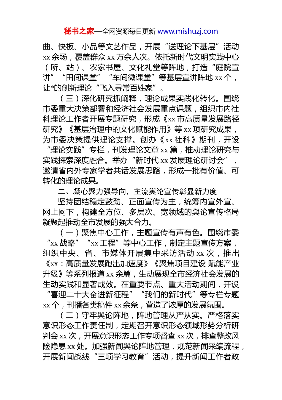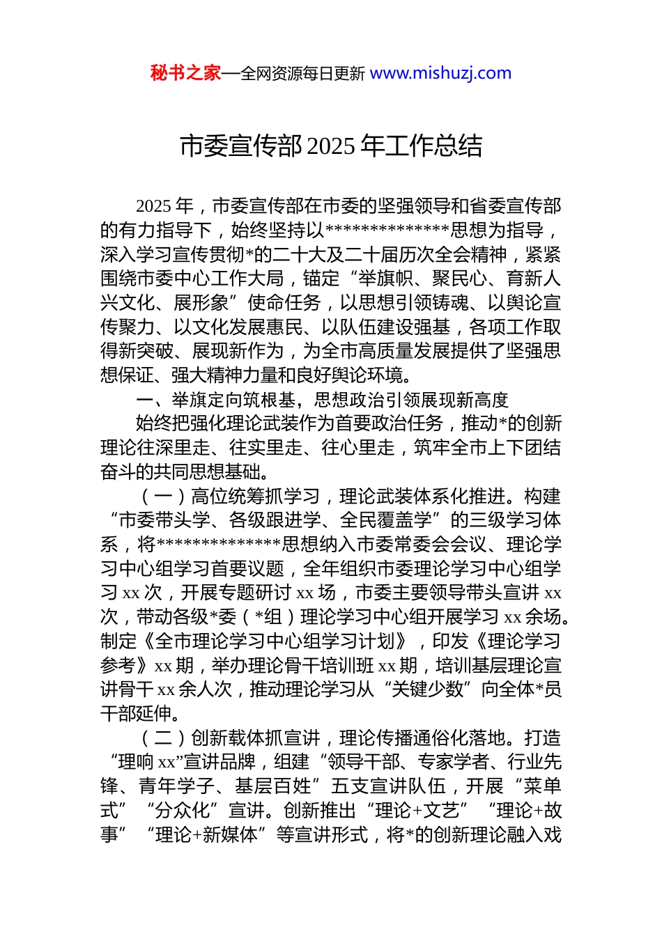 秘书之家—全网资源每日更新 www.mishuzj.com市委宣传部 2025 年工作总结2025 年,市委宣传部在市委的坚强领导和省委宣传部的有力指导下,始终坚持以**************思想为指导,深入学习宣传贯彻*的二十大及二十届历次全会精神,紧紧围绕市委中心工作大局,锚定“举旗帜、聚民心、育新人兴文化、展形象”使命任务,以思想引领铸魂、以舆论宣传聚力、以文化发展惠民、以队伍建设强基,各项工作取得新突破、展现新作为,为全市高质量发展提供了坚强思想保证、强大精神力量和良好舆论环境。一、举旗定向筑根基,思想政治引领展现新高度始终把强化理论武装作为首要政治任务,推动*的创新理论往深里走、往实里走、往心里走,筑牢全市上下团结奋斗的共同思想基础。(一)高位统筹抓学习,理论武装体系化推进。构建“市委带头学、各级跟进学、全民覆盖学”的三级学习体系,将**************思想纳入市委常委会会议、理论学习中心组学习首要议题,全年组织市委理论学习中心组学习 xx 次,开展专题研讨 xx 场,市委主要领导带头宣讲 xx次,带动各级*委(*组)理论学习中心组开展学习 xx 余场。制定《全市理论学习中心组学习计划》,印发《理论学习参考》xx 期,举办理论骨干培训班 xx 期,培训基层理论宣讲骨干 xx 余人次,推动理论学习从“关键少数”向全体*员干部延伸。(二)创新载体抓宣讲,理论传播通俗化落地。打造“理响 xx”宣讲品牌,组建“领导干部、专家学者、行业先锋、青年学子、基层百姓”五支宣讲队伍,开展“菜单式”“分众化”宣讲。创新推出“理论+文艺”“理论+故事”“理论+新媒体”等宣讲形式,将*的创新理论融入戏秘书之家—全网资源每日更新 www.mishuzj.com曲、快板、小品等文艺作品,开展“送理论下基层”活动xx 余场,覆盖群众 xx 万余人次。依托新时代文明实践中心(所、站)、农家书屋、文化礼堂等阵地,打造“庭院宣讲”“田间课堂”“车间微课堂”等基层宣讲阵地 xx 个,让*的创新理论“飞入寻常百姓家”。(三)深化研究抓阐释,理论成果实践化转化。围绕市委重大决策部署和经济社会发展重点课题,组织市内社科理论工作者开展专题研究,形成《xx 市高质量发展路径研究》《基层治理中的文化赋能作用》等 xx 项研究成果,为市委决策提供理论支撑。创办《xx 社科》期刊,开设“理论实践”专栏,刊发理论文章 xx 篇,推动理论研究与实践探索深度融合。举办“新时代 xx 发展理论研讨会”,邀请省内外专家学者共话发展思路,形成一批有价值、可转化的理论成果。二、凝心聚力强导向,主流舆论宣传彰显新力度坚持团结稳定鼓劲、正面宣传为主,统筹内宣外宣、网上网下,构建全方位、多层次、宽领域的舆论宣传格局凝聚起推动全市发展的强大合力。(一)聚焦中心工作,主题宣传有声有色。围绕市委“xx 战略”“xx 工程”等中心工作,制定主题宣传方案,组织中央、省、市媒体开展集中采访活动 xx 次,推出《xx:高质量发展跑出加速度》《聚焦项目建设 赋能产业升级》等系列报道 xx 余篇,生动展现全市经济社会发展的生动实践和显著成效。在重要节点、重大活动期间,开设“喜迎二十大奋进新征程”“我们的新时代”等专栏专题xx 个,刊播各类稿件 xx 余条,营造了浓厚的发展氛围。(二)守牢舆论阵地,阵地管理从严从实。严格落实意识形态工作责任制,定期召开意识形态领域形势分析研判会 xx 次,开展意识形态工作专项督查 xx 次,排查整改风险隐患 xx 处。加强新闻舆论阵地管理,规范新闻采编流程,开展新闻战线“三项学习教育”活动,提升新闻工作者政秘书之家—全网资源每日更新 www.mishuzj.com治素养和业务能力。强化网络意识形态安全,建立健全网络舆情监测、研判、处置机制,全年监测处置网络舆情 xx起,依法依规查处违规账号 xx 个,营造了清朗网络空间。(三)讲好城市故事,对外宣传提质提效。整合外宣资源,加强与中央主流媒体、重点门户网站合作,在《人民日报》《新华社》《光明日报》等中央媒体刊发稿件 xx篇,其中头版头条 xx 篇,提升了城市知名度和美誉度。精心策划“xx 城市形象推广周”活动,...