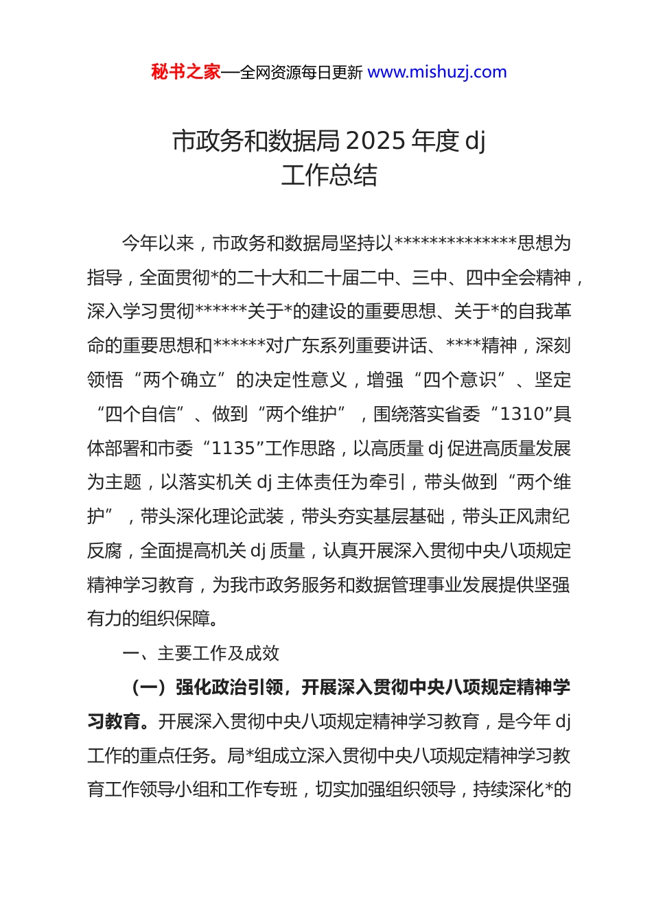 秘书之家—全网资源每日更新 www.mishuzj.com市政务和数据局 2025 年度 dj工作总结今年以来,市政务和数据局坚持以**************思想为指导,全面贯彻*的二十大和二十届二中、三中、四中全会精神,深入学习贯彻******关于*的建设的重要思想、关于*的自我革命的重要思想和******对广东系列重要讲话、****精神,深刻领悟“两个确立”的决定性意义,增强“四个意识”、坚定“四个自信”、做到“两个维护”,围绕落实省委“1310”具体部署和市委“1135”工作思路,以高质量 dj 促进高质量发展为主题,以落实机关 dj 主体责任为牵引,带头做到“两个维护”,带头深化理论武装,带头夯实基层基础,带头正风肃纪反腐,全面提高机关 dj 质量,认真开展深入贯彻中央八项规定精神学习教育,为我市政务服务和数据管理事业发展提供坚强有力的组织保障。一、主要工作及成效(一)强化政治引领,开展深入贯彻中央八项规定精神学习教育。开展深入贯彻中央八项规定精神学习教育,是今年 dj工作的重点任务。局*组成立深入贯彻中央八项规定精神学习教育工作领导小组和工作专班,切实加强组织领导,持续深化*的秘书之家—全网资源每日更新 www.mishuzj.com创新理论武装,锲而不舍落实中央八项规定精神,驰而不息抓好学习教育各项任务的落实,聚焦主题、精准发力,一体推进学查改,推进作风建设常态化、长效化。局*组切实负起*的政治建设工作主体责任,牢固树立政治机关意识,把政治建设贯穿机关 dj 全过程,*组书记认真履行第一责任人职责,*组其他成员根据职责分工,按照“一岗双责”要求,抓好分管部门和领域*的政治建设工作。(二)加强理论武装,健全理论学习长效机制。健全以学铸魂、以学增智、以学正风、以学促干长效机制,落实“第一议题”“三会一课”、主题*日等制度,完善“五学联动”机制,把*的创新理论作为基层学习教育培训的首课、主课、必修课抓实抓好,推动*的创新理论入脑入心、见行见效。认真落实《中国共产**委(*组)理论学习中心组学习规则》,提升理论学习质效,发挥领学促学作用。加强年轻干部教育引领,建强用好青年理论学习小组,持续开展“青年学思行”活动,深度凝聚青年干部智慧,着力提升青年干部的政治素养。(三)夯实组织建设,推进机关 dj 工作见实见效。开展“两比两论”活动,优化便民服务。贯彻落实市委七届七次全会和全市大抓产业大抓招商大抓项目苦干实干加快推进高质量发展大会精神,结合我局工作实际,在*员、干部中开展“两比秘书之家—全网资源每日更新 www.mishuzj.com两论”活动,围绕优化营商环境、阳光交易建设、数字赋能基层治理、改善人居环境、重点工作争先进位、发挥 dj 引领作用、办好民生实事等方面,适时集中研讨并凝聚共识,聚焦群众急难愁盼,找准工作重点,查实工作差距,狠抓工作落实,压实具体责任,倡导苦干实干。同时,加强组织建设,有序发展新*员。把好*员入口关,共培养发展对象 2 名,为*组织输入“新鲜血液”。(四)创新活动载体,引导*员干部增强宗旨意识。一是扎实开展“先锋引领双报到”活动。经常组织*员志愿者到挂钩联系村 xx 区西郊社区开展志愿活动;植树节之际与中国联通 xx市分公司到“双报到”挂钩联系点 xx 区西马街道西郊社区开展“共绘绿美 xx,共建幸福家园”义务植树活动;与中国移动xx 市分公司到揭西县钱坑镇开展“联合共建、绿美 xx”植树主题*日活动,助力绿美 xx 生态建设。二是组织干部职工参观“书香润机关 鉴往启新程”史志文化展。结合当前深入开展的中央八项规定精神学习教育,通过观展与阅读,引导*员干部永葆初心使命、提升文化传承自觉、汲取社会治理经验,凝聚精神力量,深化*的创新理论武装。(五)持之以恒正风肃纪,建设风清气正的纪律机关。一是严格执行中央八项规定精神和廉洁从政各项规章制度及本局秘书之家—全网资源每日更新 www.mishuzj.com制定的“守法、守纪、守经、守正、守真、守职、守时、守口、守信、守廉”行为规范。坚持抓 dj、固根本,加强纪律教育,严格纪律执行,将*风廉政建设责任融入单位中心工作和管理之中。二是巩固 dj 学习教育成果,...