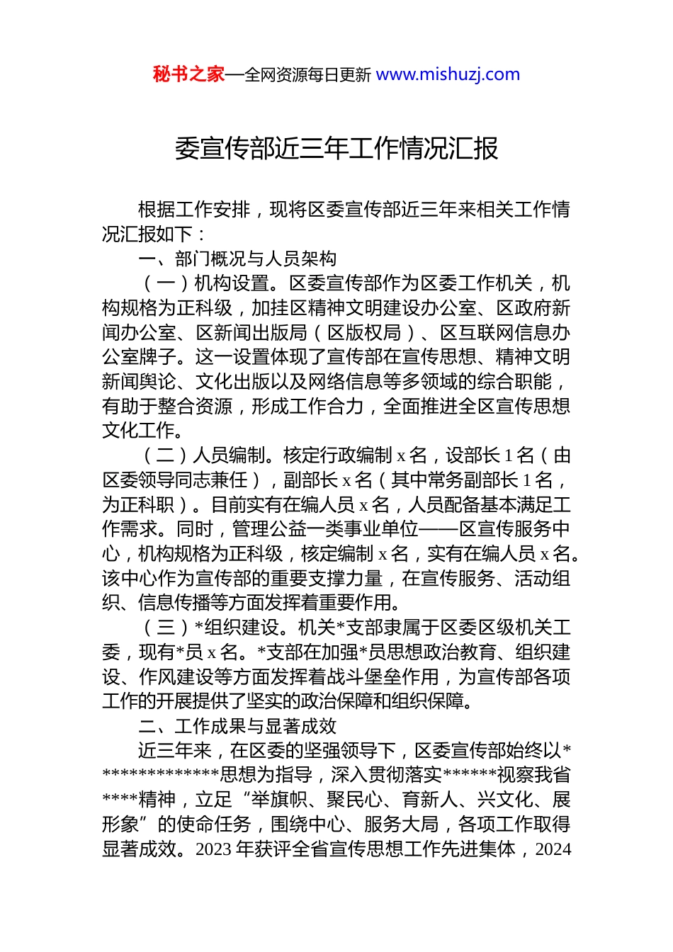 秘书之家—全网资源每日更新 www.mishuzj.com委宣传部近三年工作情况汇报根据工作安排,现将区委宣传部近三年来相关工作情况汇报如下:一、部门概况与人员架构(一)机构设置。区委宣传部作为区委工作机关,机构规格为正科级,加挂区精神文明建设办公室、区政府新闻办公室、区新闻出版局(区版权局)、区互联网信息办公室牌子。这一设置体现了宣传部在宣传思想、精神文明新闻舆论、文化出版以及网络信息等多领域的综合职能,有助于整合资源,形成工作合力,全面推进全区宣传思想文化工作。(二)人员编制。核定行政编制 x 名,设部长 1 名(由区委领导同志兼任),副部长 x 名(其中常务副部长 1 名,为正科职)。目前实有在编人员 x 名,人员配备基本满足工作需求。同时,管理公益一类事业单位——区宣传服务中心,机构规格为正科级,核定编制 x 名,实有在编人员 x 名。该中心作为宣传部的重要支撑力量,在宣传服务、活动组织、信息传播等方面发挥着重要作用。(三)*组织建设。机关*支部隶属于区委区级机关工委,现有*员 x 名。*支部在加强*员思想政治教育、组织建设、作风建设等方面发挥着战斗堡垒作用,为宣传部各项工作的开展提供了坚实的政治保障和组织保障。二、工作成果与显著成效近三年来,在区委的坚强领导下,区委宣传部始终以**************思想为指导,深入贯彻落实******视察我省****精神,立足“举旗帜、聚民心、育新人、兴文化、展形象”的使命任务,围绕中心、服务大局,各项工作取得显著成效。2023 年获评全省宣传思想工作先进集体,2024秘书之家—全网资源每日更新 www.mishuzj.com年荣获第六届全省“人民满意的公务员集体”称号。(一)强化理论武装,推动决策部署落地。一是创新宣传教育活动。精心组织“强国复兴有我”群众性宣传教育活动,以群众喜闻乐见的形式,广泛传播*的创新理论和方针政策。通过举办主题展览、演讲比赛、文艺演出等活动,激发了广大群众的爱国热情和奋斗精神,营造了浓厚的社会氛围。二是推进重要精神学习宣传。扎实推进*的二十大及二十届历次全会精神学习宣传,常态化指导各级*委(*组)理论学习中心组学习。通过举办专题讲座、研讨班、培训班等形式,帮助各级领导干部深刻领会会议精神实质提高政治理论水平和工作能力。三是打造特色传播体系。创新打造“新农村大喇叭+乡音宣讲队+理论微矩阵”传播体系,充分利用农村大喇叭覆盖面广、传播速度快的优势结合乡音宣讲队的亲和力和感染力,以及理论微矩阵的便捷性和互动性,推动*的创新理论直达基层。三年来,在省级及以上媒体刊发新闻作品 x 篇/条,有效提升了 x 区的知名度与影响力。(二)筑牢意识形态防线,维护社会稳定。一是健全责任体系。健全意识形态工作责任体系,明确各级*组织和相关部门的意识形态工作责任,形成了*委统一领导、*政齐抓共管、宣传部门组织协调、有关部门分工负责的工作格局。二是加强风险管控。加强重点领域和阵地风险管控对新闻媒体、网络平台、文化场所等意识形态阵地进行严格管理,确保意识形态领域安全。同时,建立健全舆情监测预警机制,及时发现和处置各类舆情事件。三是落实舆情处置机制。严格落实“1+n”舆情处置机制,即由宣传部牵头,相关部门协同配合,实现舆情处置与问题解决同步推进。近三年未发生重大影响的舆情事件,意识形态领域保持平稳有序。(三)促进文化事业繁荣,丰富群众精神生活。一是壮大文化产业规模。培育规上文化企业 x 家,通过政策扶持、秘书之家—全网资源每日更新 www.mishuzj.com资金投入、项目引导等方式,推动文化产业转型升级,持续壮大特色文化产业规模。文化产业的发展不仅为经济增长注入了新动力,也为文化事业的繁荣提供了有力支撑。二是开展群众文化活动。开展“我们的中国梦——文化进万家”、百姓“村晚”等群众文化活动 x 余场次,丰富了群众的精神文化生活。这些活动贴近群众、贴近生活、贴近实际,深受广大群众的欢迎,成为了宣传思想文化工作的重要载体。三是实施文艺精品创作工程。实施文艺精品创作工程,鼓励和支持文艺工作者深入生活、扎根人民,创作了一批具有思想深度、艺...