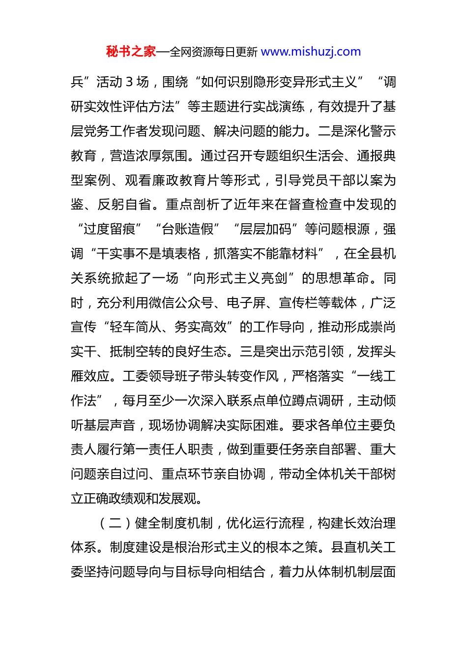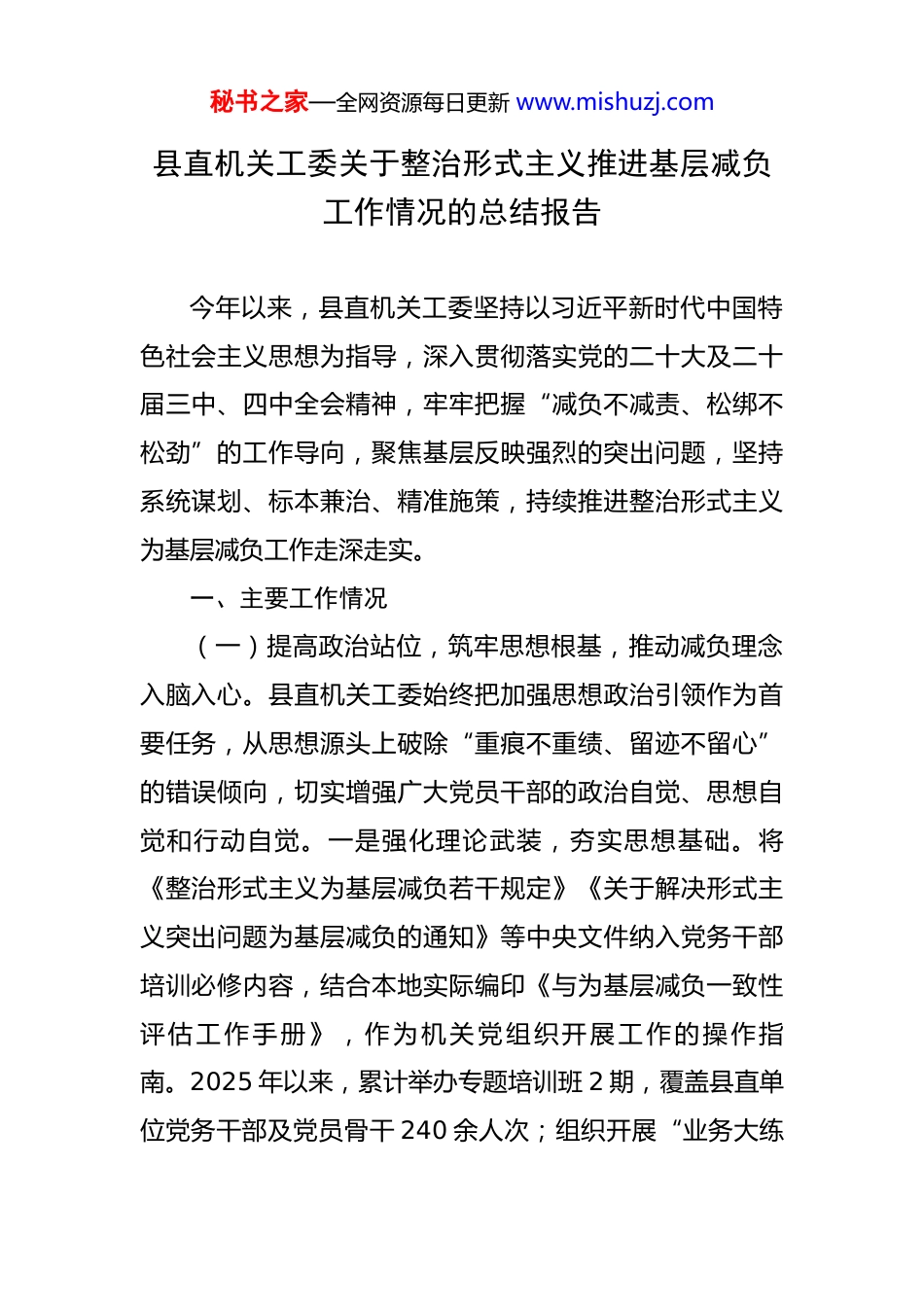秘书之家—全网资源每日更新 www.mishuzj.com县直机关工委关于整治形式主义推进基层减负工作情况的总结报告 今年以来,县直机关工委坚持以习近平新时代中国特色社会主义思想为指导,深入贯彻落实党的二十大及二十届三中、四中全会精神,牢牢把握“减负不减责、松绑不松劲”的工作导向,聚焦基层反映强烈的突出问题,坚持系统谋划、标本兼治、精准施策,持续推进整治形式主义为基层减负工作走深走实。一、主要工作情况(一)提高政治站位,筑牢思想根基,推动减负理念入脑入心。县直机关工委始终把加强思想政治引领作为首要任务,从思想源头上破除“重痕不重绩、留迹不留心”的错误倾向,切实增强广大党员干部的政治自觉、思想自觉和行动自觉。一是强化理论武装,夯实思想基础。将《整治形式主义为基层减负若干规定》《关于解决形式主义突出问题为基层减负的通知》等中央文件纳入党务干部培训必修内容,结合本地实际编印《与为基层减负一致性评估工作手册》,作为机关党组织开展工作的操作指南。2025 年以来,累计举办专题培训班 2 期,覆盖县直单位党务干部及党员骨干 240 余人次;组织开展“业务大练秘书之家—全网资源每日更新 www.mishuzj.com兵”活动 3 场,围绕“如何识别隐形变异形式主义”“调研实效性评估方法”等主题进行实战演练,有效提升了基层党务工作者发现问题、解决问题的能力。二是深化警示教育,营造浓厚氛围。通过召开专题组织生活会、通报典型案例、观看廉政教育片等形式,引导党员干部以案为鉴、反躬自省。重点剖析了近年来在督查检查中发现的“过度留痕”“台账造假”“层层加码”等问题根源,强调“干实事不是填表格,抓落实不能靠材料”,在全县机关系统掀起了一场“向形式主义亮剑”的思想革命。同时,充分利用微信公众号、电子屏、宣传栏等载体,广泛宣传“轻车简从、务实高效”的工作导向,推动形成崇尚实干、抵制空转的良好生态。三是突出示范引领,发挥头雁效应。工委领导班子带头转变作风,严格落实“一线工作法”,每月至少一次深入联系点单位蹲点调研,主动倾听基层声音,现场协调解决实际困难。要求各单位主要负责人履行第一责任人职责,做到重要任务亲自部署、重大问题亲自过问、重点环节亲自协调,带动全体机关干部树立正确政绩观和发展观。(二)健全制度机制,优化运行流程,构建长效治理体系。制度建设是根治形式主义的根本之策。县直机关工委坚持问题导向与目标导向相结合,着力从体制机制层面秘书之家—全网资源每日更新 www.mishuzj.com破解“上面千条线、下面一根针”的结构性矛盾,推动各项工作由“被动迎检”向“主动服务”转变。一是精简考核体系,变“繁文缛节”为“实绩导向”。针对以往党建考核中存在的“重资料、轻实效”“多头查、反复考”等问题,工委联合县委组织部对机关党建年度考评办法进行全面修订。取消原定的半年度集中检查,实行“年初明责、年中提醒、年末综合评价”的新模式;实地考核由每年两次压缩至一次,考核事项从 6 项精简为“政治建设、组织建设、作风建设、作用发挥、群众满意度”5 个核心维度,并建立负面清单管理制度,对出现形式主义典型问题的单位实行“一票否决”。同时,全面推行“四不两直”工作法,减少程序性负担。日常指导改为线上清单推送+季度动态提醒,变“纸质台账”为“数据支撑+实地验证”,真正实现“让数据多跑路、让干部少填表”。二是规范调研行为,打破“扎堆扰民”困局。工委牵头制定《县开展调研与为基层减负一致性评估工作机制》,明确所有县级部门赴乡镇、村社开展调研必须提前报备,填写《调研一致性评估审批表》,经审核通过后方可实施。在此基础上,建立“调研统筹调度平台”,每周汇总各部门调研计划,由工委办公室会同县委办、县政府办进行联合会审,防止时间集中、地点重叠、内容重复。每月与县工信局、秘书之家—全网资源每日更新 www.mishuzj.com国资委等部门召开联席会议,分析调研频次、范围、成效,提出优化建议。2025 年至今,共受理并审批调研事项79 项,涉及 17 个职能部门,未发生一起扎堆调研或违规陪同事件,基层普遍反映“终于有时间静下心...