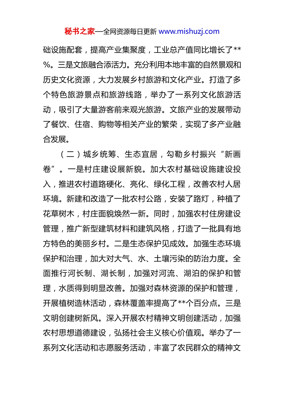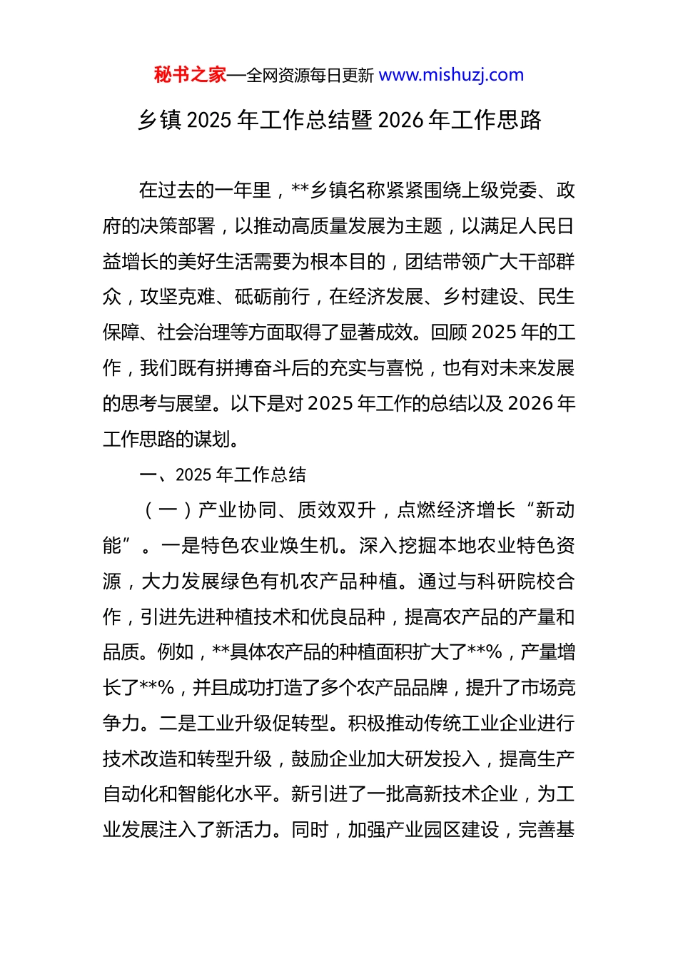 秘书之家—全网资源每日更新 www.mishuzj.com乡镇 2025 年工作总结暨 2026 年工作思路 在过去的一年里,**乡镇名称紧紧围绕上级党委、政府的决策部署,以推动高质量发展为主题,以满足人民日益增长的美好生活需要为根本目的,团结带领广大干部群众,攻坚克难、砥砺前行,在经济发展、乡村建设、民生保障、社会治理等方面取得了显著成效。回顾 2025 年的工作,我们既有拼搏奋斗后的充实与喜悦,也有对未来发展的思考与展望。以下是对 2025 年工作的总结以及 2026 年工作思路的谋划。一、2025 年工作总结(一)产业协同、质效双升,点燃经济增长“新动能”。一是特色农业焕生机。深入挖掘本地农业特色资源,大力发展绿色有机农产品种植。通过与科研院校合作,引进先进种植技术和优良品种,提高农产品的产量和品质。例如,**具体农产品的种植面积扩大了**%,产量增长了**%,并且成功打造了多个农产品品牌,提升了市场竞争力。二是工业升级促转型。积极推动传统工业企业进行技术改造和转型升级,鼓励企业加大研发投入,提高生产自动化和智能化水平。新引进了一批高新技术企业,为工业发展注入了新活力。同时,加强产业园区建设,完善基秘书之家—全网资源每日更新 www.mishuzj.com础设施配套,提高产业集聚度,工业总产值同比增长了**%。三是文旅融合添活力。充分利用本地丰富的自然景观和历史文化资源,大力发展乡村旅游和文化产业。打造了多个特色旅游景点和旅游线路,举办了一系列文化旅游活动,吸引了大量游客前来观光旅游。文旅产业的发展带动了餐饮、住宿、购物等相关产业的繁荣,实现了多产业融合发展。(二)城乡统筹、生态宜居,勾勒乡村振兴“新画卷”。一是村庄建设展新貌。加大农村基础设施建设投入,推进农村道路硬化、亮化、绿化工程,改善农村人居环境。新建和改造了一批农村公路,安装了路灯,种植了花草树木,村庄面貌焕然一新。同时,加强农村住房建设管理,推广新型建筑材料和建筑风格,打造了一批具有地方特色的美丽乡村。二是生态保护见成效。加强生态环境保护和治理,加大对大气、水、土壤污染的防治力度。全面推行河长制、湖长制,加强对河流、湖泊的保护和管理,水质得到明显改善。加强对森林资源的保护和管理,开展植树造林活动,森林覆盖率提高了**个百分点。三是文明创建树新风。深入开展农村精神文明创建活动,加强农村思想道德建设,弘扬社会主义核心价值观。举办了一系列文化活动和志愿服务活动,丰富了农民群众的精神文秘书之家—全网资源每日更新 www.mishuzj.com化生活。同时,加强农村移风易俗工作,破除陈规陋习,树立文明新风尚。(三)民生改善、福祉增进,筑牢群众幸福“基本盘”。一是社会保障更完善。加大社会保障力度,扩大社会保险覆盖面,提高保障水平。完善社会救助体系,加强对困难群众的帮扶救助,做到应保尽保、应救尽救。新建了一批养老服务设施,提高了养老服务质量,让老年人安享晚年。二是教育医疗有提升。加强教育基础设施建设,改善办学条件,提高教育教学质量。新建和改造了一批学校,配备了先进的教学设备。加强教师队伍建设,提高教师素质。同时,加强医疗卫生服务体系建设,改善医疗条件,提高医疗服务水平。新建了一批医疗卫生机构,引进了一批先进的医疗设备,群众看病就医更加方便。三是就业创业促增收。积极开展就业创业培训,提高农民群众的就业创业能力。出台了一系列优惠政策,鼓励农民群众自主创业。加强与企业的合作,开展订单式培训,为企业输送了大量高素质的劳动力。全年新增就业**人,创业带动就业**人,农民人均可支配收入同比增长了**%。(四)平安建设、风险防控,织密基层治理“安全网”。一是矛盾化解保稳定。加强矛盾纠纷排查化解工作,建立健全矛盾纠纷多元化解机制。定期开展矛盾纠纷秘书之家—全网资源每日更新 www.mishuzj.com排查,及时发现和解决问题。加强人民调解、行政调解、司法调解的衔接配合,提高矛盾纠纷化解效率。全年共排查化解矛盾纠纷**起,成功率达到了**%,维护了社会稳定。二是安全生产强监管。加强安全生产监管,落实安全生产责任制。开展安全生产大检查和专项整...