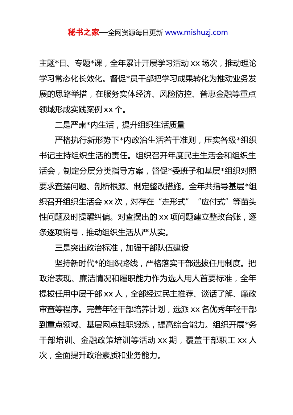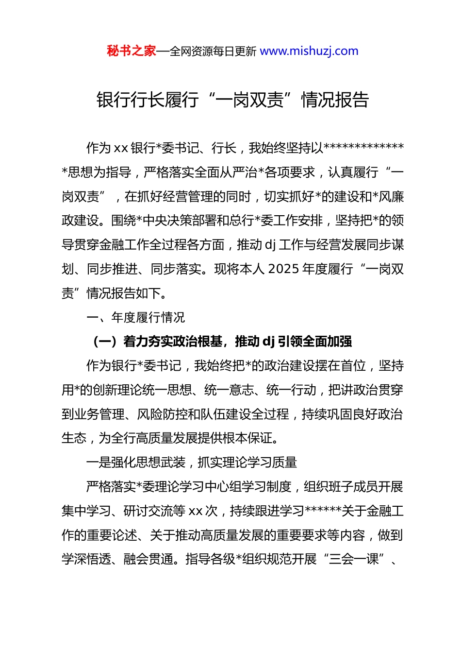 秘书之家—全网资源每日更新 www.mishuzj.com银行行长履行“一岗双责”情况报告作为 xx 银行*委书记、行长,我始终坚持以**************思想为指导,严格落实全面从严治*各项要求,认真履行“一岗双责”,在抓好经营管理的同时,切实抓好*的建设和*风廉政建设。围绕*中央决策部署和总行*委工作安排,坚持把*的领导贯穿金融工作全过程各方面,推动 dj 工作与经营发展同步谋划、同步推进、同步落实。现将本人 2025 年度履行“一岗双责”情况报告如下。一、年度履行情况(一)着力夯实政治根基,推动 dj 引领全面加强作为银行*委书记,我始终把*的政治建设摆在首位,坚持用*的创新理论统一思想、统一意志、统一行动,把讲政治贯穿到业务管理、风险防控和队伍建设全过程,持续巩固良好政治生态,为全行高质量发展提供根本保证。一是强化思想武装,抓实理论学习质量严格落实*委理论学习中心组学习制度,组织班子成员开展集中学习、研讨交流等 xx 次,持续跟进学习******关于金融工作的重要论述、关于推动高质量发展的重要要求等内容,做到学深悟透、融会贯通。指导各级*组织规范开展“三会一课”、秘书之家—全网资源每日更新 www.mishuzj.com主题*日、专题*课,全年累计开展学习活动 xx 场次,推动理论学习常态化长效化。督促*员干部把学习成果转化为推动业务发展的思路举措,在服务实体经济、风险防控、普惠金融等重点领域形成实践案例 xx 个。二是严肃*内生活,提升组织生活质量严格执行新形势下*内政治生活若干准则,压实各级*组织书记主持组织生活的责任。组织召开年度民主生活会和组织生活会,制定分层分类指导方案,督促*委班子和基层*组织对照要求查摆问题、剖析根源、制定整改措施。全年共指导基层*组织召开组织生活会 xx 次,对存在“走形式”“应付式”等苗头性问题及时提醒纠偏。对查摆出的 xx 项问题建立整改台账,逐条逐项销号,推动组织生活从严从实。三是突出政治标准,加强干部队伍建设坚持新时代*的组织路线,严格落实干部选拔任用制度。把政治表现、廉洁情况和履职能力作为选人用人首要标准,全年提拔任用中层干部 xx 人,全部经过民主推荐、谈话了解、廉政审查等程序。完善年轻干部培养计划,选派 xx 名优秀年轻干部到重点领域、基层网点挂职锻炼,提高综合能力。组织开展*务干部培训、金融政策培训等活动 xx 期,覆盖干部职工 xx 人次,全面提升政治素质和业务能力。秘书之家—全网资源每日更新 www.mishuzj.com四是深化作风建设,推动责任压力传导紧盯中央八项规定精神落实情况,加强节日假期等关键节点的作风监督。组织开展作风建设专项检查 xx 次,对发现的迟到早退、服务意识不强等问题进行通报曝光,督促立整立改。完善谈心谈话制度,对领导班子成员、部门负责人、关键岗位人员开展谈话提醒 xx 人次,做到抓早抓小、防微杜渐。坚持以上率下,推动*员干部形成真抓实干、务实担当的良好作风。五是注重融合互促,推动 dj 与业务同向发力坚持把 dj 工作与经营管理深度融合,明确基层*组织在服务实体经济、优化营商环境、防范金融风险等重点领域的责任清单,推动 dj 成果向业务质效转化。全年组织开展 dj 引领业务竞赛、客户服务提升月等活动 xx 次,推动全行存贷款增长、风险资产压降、普惠金融覆盖面提升等关键指标持续向好。对表现突出的*组织和*员评选表彰 xx 个(名),进一步激发 dj 工作活力。(二)全面压实主体责任,推动管*治*从严从紧作为*委书记,我始终把履行管*治*责任作为根本职责,坚持严的基调不动摇,以制度建设、监督推进、责任落实为抓手,推动全面从严治*在全行落地生根,确保各项要求真正“落地见效”。秘书之家—全网资源每日更新 www.mishuzj.com一是健全责任体系,压紧压实各级责任严格落实全面从严治*责任清单制度,制定《2025 年度*风廉政建设责任分解表》,明确*委书记负总责、班子成员“一岗双责”、部门负责人具体抓落实,形成层层负责、人人担责的工作格局。年内召开专题会议 xx 次,听取责任落实情况汇报,及时研究部署重点工作。组织开展责任落实情况专项检查xx 次,推动问...