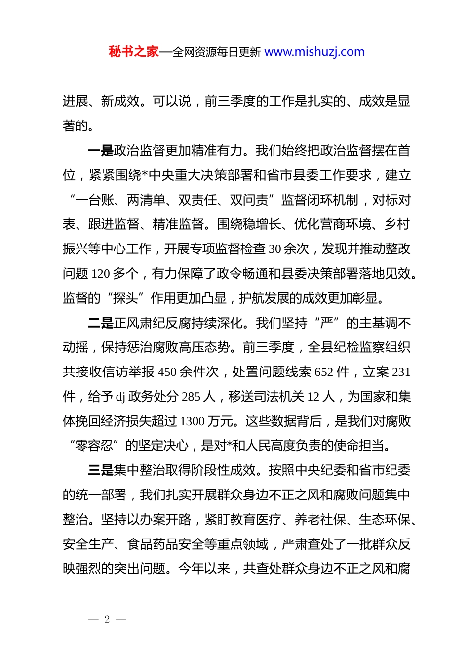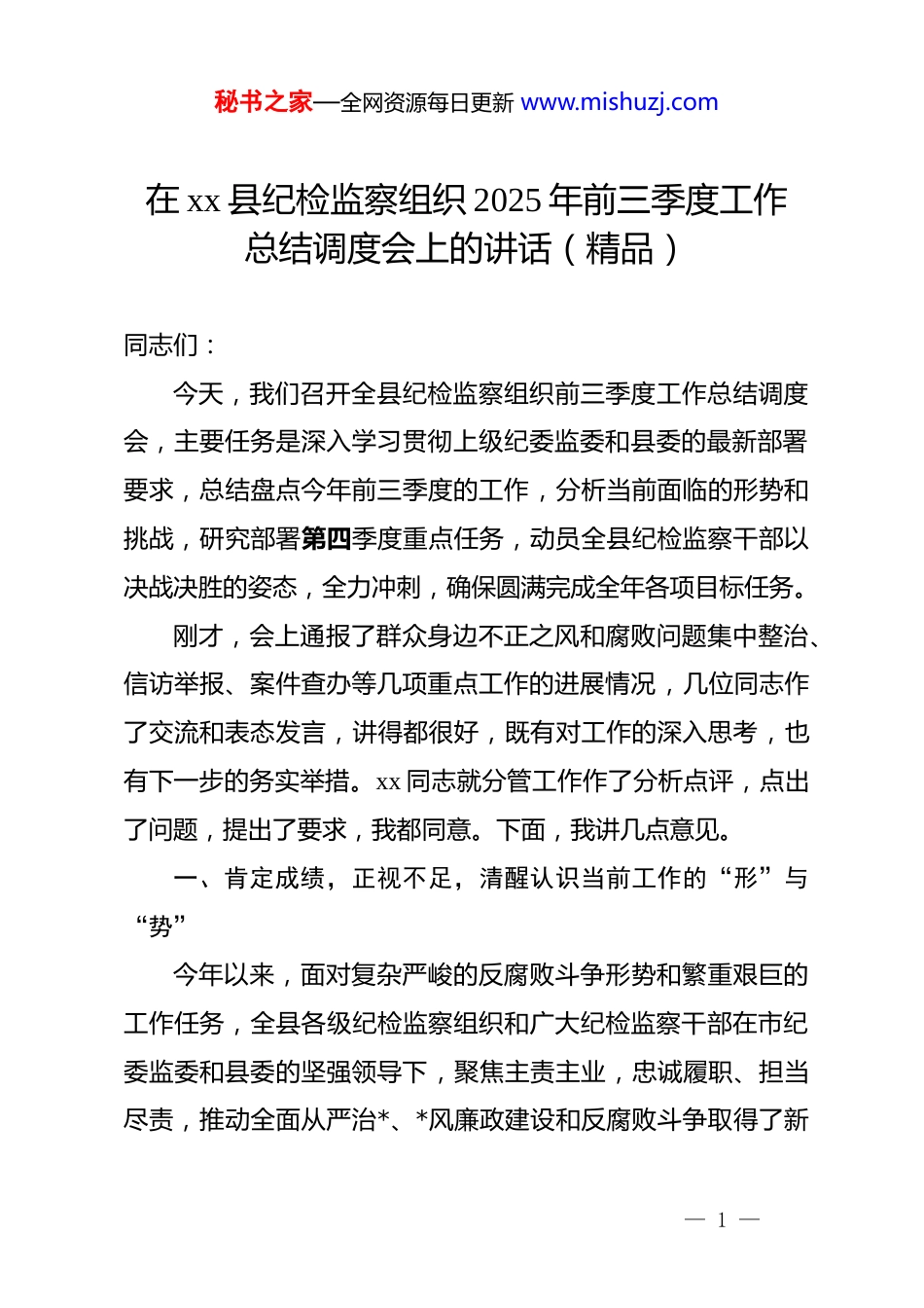秘书之家—全网资源每日更新 www.mishuzj.com在 xx 县纪检监察组织 2025 年前三季度工作总结调度会上的讲话(精品)同志们:今天,我们召开全县纪检监察组织前三季度工作总结调度会,主要任务是深入学习贯彻上级纪委监委和县委的最新部署要求,总结盘点今年前三季度的工作,分析当前面临的形势和挑战,研究部署第四季度重点任务,动员全县纪检监察干部以决战决胜的姿态,全力冲刺,确保圆满完成全年各项目标任务。刚才,会上通报了群众身边不正之风和腐败问题集中整治、信访举报、案件查办等几项重点工作的进展情况,几位同志作了交流和表态发言,讲得都很好,既有对工作的深入思考,也有下一步的务实举措。xx 同志就分管工作作了分析点评,点出了问题,提出了要求,我都同意。下面,我讲几点意见。一、肯定成绩,正视不足,清醒认识当前工作的“形”与“势”今年以来,面对复杂严峻的反腐败斗争形势和繁重艰巨的工作任务,全县各级纪检监察组织和广大纪检监察干部在市纪委监委和县委的坚强领导下,聚焦主责主业,忠诚履职、担当尽责,推动全面从严治*、*风廉政建设和反腐败斗争取得了新— 1 —秘书之家—全网资源每日更新 www.mishuzj.com进展、新成效。可以说,前三季度的工作是扎实的、成效是显著的。一是政治监督更加精准有力。我们始终把政治监督摆在首位,紧紧围绕*中央重大决策部署和省市县委工作要求,建立“一台账、两清单、双责任、双问责”监督闭环机制,对标对表、跟进监督、精准监督。围绕稳增长、优化营商环境、乡村振兴等中心工作,开展专项监督检查 30 余次,发现并推动整改问题 120 多个,有力保障了政令畅通和县委决策部署落地见效。监督的“探头”作用更加凸显,护航发展的成效更加彰显。二是正风肃纪反腐持续深化。我们坚持“严”的主基调不动摇,保持惩治腐败高压态势。前三季度,全县纪检监察组织共接收信访举报 450 余件次,处置问题线索 652 件,立案 231件,给予 dj 政务处分 285 人,移送司法机关 12 人,为国家和集体挽回经济损失超过 1300 万元。这些数据背后,是我们对腐败“零容忍”的坚定决心,是对*和人民高度负责的使命担当。三是集中整治取得阶段性成效。按照中央纪委和省市纪委的统一部署,我们扎实开展群众身边不正之风和腐败问题集中整治。坚持以办案开路,紧盯教育医疗、养老社保、生态环保、安全生产、食品药品安全等重点领域,严肃查处了一批群众反映强烈的突出问题。今年以来,共查处群众身边不正之风和腐— 2 —秘书之家—全网资源每日更新 www.mishuzj.com败问题 85 起,处理 112 人,其中 dj 政务处分 95 人。通过解决一件件群众的“急难愁盼”,人民群众的获得感、幸福感、安全感得到切实提升。四是作风建设堤坝不断加固。我们锲而不舍落实中央八项规定及其实施细则精神,对“四风”问题露头就打、寸步不让。持续深化违规吃喝、违规收送礼品礼金等顽瘴固疾专项整治,严肃查处“不吃公款吃老板”、“不收现金收礼卡”等隐形变异问题。前三季度,全县共查处违反中央八项规定精神问题 48起,处理 65 人,给予 dj 政务处分 52 人。通过持续释放越往后执纪越严的强烈信号,崇廉拒腐、风清气正的政治生态持续向好。五是监督体系效能有效提升。我们着力构建系统集成、协同高效的监督体系,不断增强监督治理效能。加强纪律监督、监察监督、派驻监督、巡察监督的统筹衔接,深化与其他各类监督的贯通协调机制。前三季度,纪委监委机关与巡察机构协作,移送问题线索 35 条,立案 11 件;与审计、财政等部门共享信息、共商对策,监督合力显著增强。通过做实“后半篇文章”,制发纪检监察建议书 28 份,推动相关单位建章立制 40余项,监督、办案、治理一体推进的综合效应初步显现。六是“三化”建设迈出坚实步伐。我们以“三化建设年”— 3 —秘书之家—全网资源每日更新 www.mishuzj.com行动为抓手,着力锻造高素质专业化纪检监察铁军。在制度化方面,修订完善了线索处置、审查调查、案件审理等一系列工作规程,让权力在制度轨道上运行。在规范化方面,全面推广应用标准化文书模板,统一...