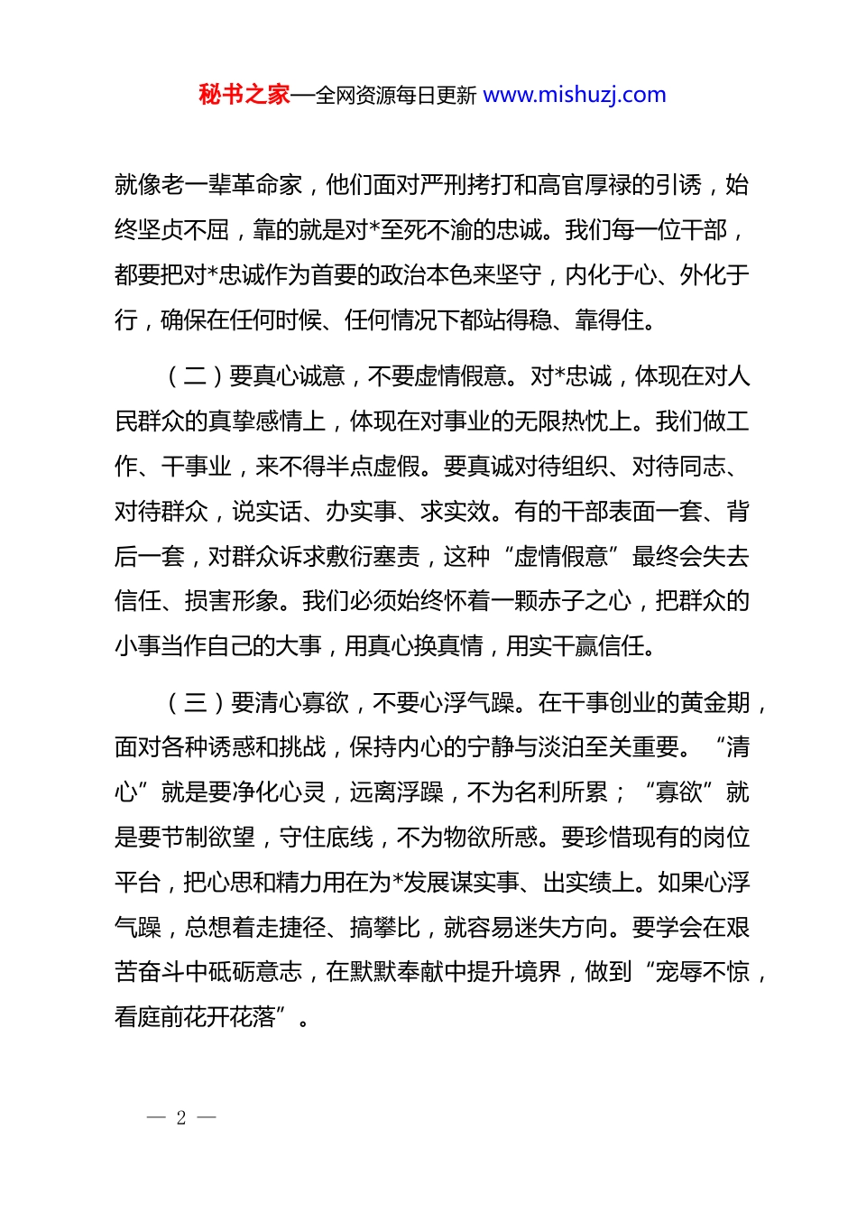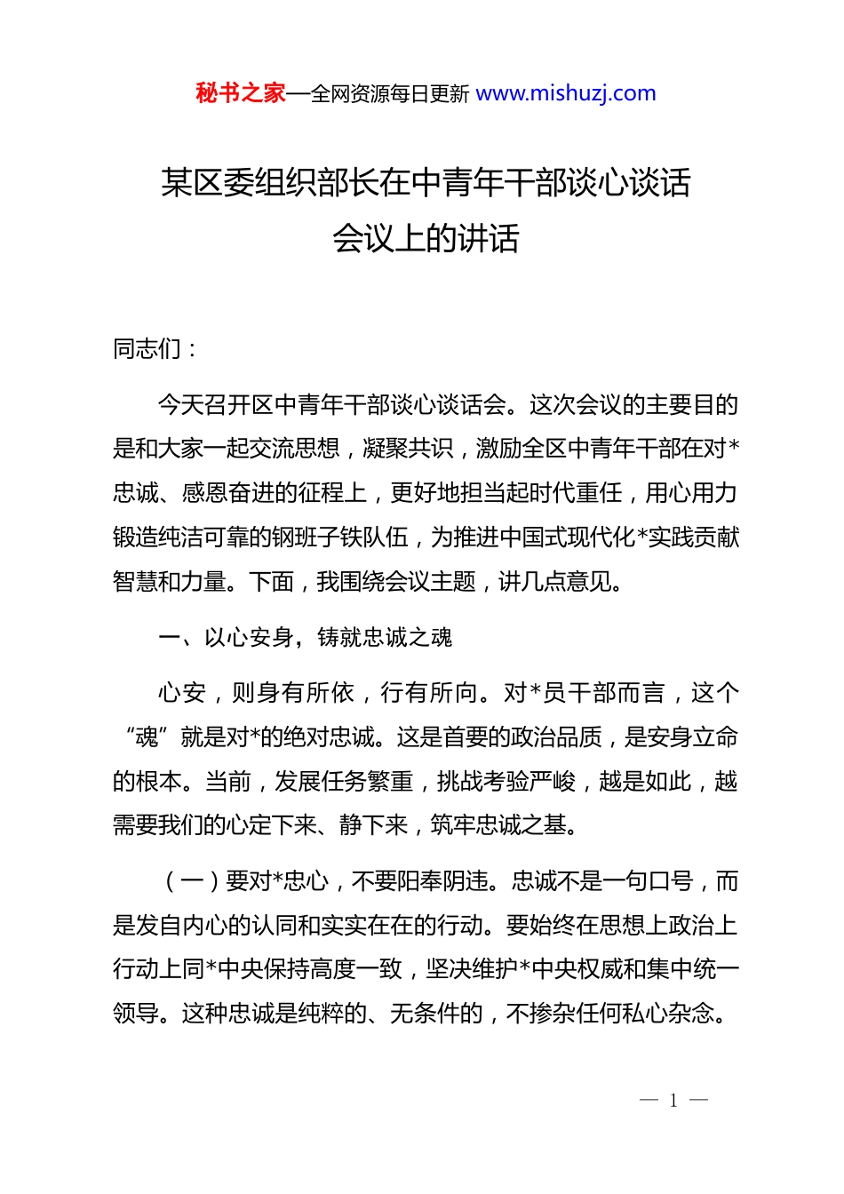 秘书之家—全网资源每日更新 www.mishuzj.com某区委组织部长在中青年干部谈心谈话会议上的讲话同志们:今天召开区中青年干部谈心谈话会。这次会议的主要目的是和大家一起交流思想,凝聚共识,激励全区中青年干部在对*忠诚、感恩奋进的征程上,更好地担当起时代重任,用心用力锻造纯洁可靠的钢班子铁队伍,为推进中国式现代化*实践贡献智慧和力量。下面,我围绕会议主题,讲几点意见。一、以心安身,铸就忠诚之魂心安,则身有所依,行有所向。对*员干部而言,这个“魂”就是对*的绝对忠诚。这是首要的政治品质,是安身立命的根本。当前,发展任务繁重,挑战考验严峻,越是如此,越需要我们的心定下来、静下来,筑牢忠诚之基。(一)要对*忠心,不要阳奉阴违。忠诚不是一句口号,而是发自内心的认同和实实在在的行动。要始终在思想上政治上行动上同*中央保持高度一致,坚决维护*中央权威和集中统一领导。这种忠诚是纯粹的、无条件的,不掺杂任何私心杂念。— 1 —秘书之家—全网资源每日更新 www.mishuzj.com就像老一辈革命家,他们面对严刑拷打和高官厚禄的引诱,始终坚贞不屈,靠的就是对*至死不渝的忠诚。我们每一位干部,都要把对*忠诚作为首要的政治本色来坚守,内化于心、外化于行,确保在任何时候、任何情况下都站得稳、靠得住。(二)要真心诚意,不要虚情假意。对*忠诚,体现在对人民群众的真挚感情上,体现在对事业的无限热忱上。我们做工作、干事业,来不得半点虚假。要真诚对待组织、对待同志、对待群众,说实话、办实事、求实效。有的干部表面一套、背后一套,对群众诉求敷衍塞责,这种“虚情假意”最终会失去信任、损害形象。我们必须始终怀着一颗赤子之心,把群众的小事当作自己的大事,用真心换真情,用实干赢信任。(三)要清心寡欲,不要心浮气躁。在干事创业的黄金期,面对各种诱惑和挑战,保持内心的宁静与淡泊至关重要。“清心”就是要净化心灵,远离浮躁,不为名利所累;“寡欲”就是要节制欲望,守住底线,不为物欲所惑。要珍惜现有的岗位平台,把心思和精力用在为*发展谋实事、出实绩上。如果心浮气躁,总想着走捷径、搞攀比,就容易迷失方向。要学会在艰苦奋斗中砥砺意志,在默默奉献中提升境界,做到“宠辱不惊,看庭前花开花落”。— 2 —秘书之家—全网资源每日更新 www.mishuzj.com二、以德修身,夯实立身之本“国无德不兴,人无德不立。”德行是干部立身之本、成事之基。良好的道德修养,如同木之根本、水之源头,决定着干部能走多远、能担多重。中青年干部必须把修身立德摆在更加突出的位置,不断锤炼*性,提升境界。(一)要精诚团结,不要团团伙伙。团结出凝聚力、出战斗力。我们讲的团结,是建立在共同理想信念和目标基础上的“精诚团结”,是大事讲原则、小事讲风格的团结。要像爱护眼睛一样爱护团结,善于团结不同意见的同志一道工作。坚决反对那种不讲原则、只讲人情的“团团伙伙”,那种搞亲亲疏疏、拉帮结派的行为,只会破坏政治生态,损害事业发展的根基。我们要做促进团结的事,说利于团结的话,形成“九牛爬坡、个个出力”的生动局面。(二)要虚怀若谷,不要鸡肠小肚。胸怀决定格局。中青年干部要有容人容事的气度和雅量,听得进不同意见,容得下批评指责,做到“有则改之,无则加勉”。切不可心胸狭窄、小肚鸡肠,为一点成绩沾沾自喜,为一句批评耿耿于怀。要向老一辈学习,学习他们“虚怀若谷”的品格,善于取人之长、补己之短。在工作中,要多看别人的优点,多反思自己的不足,— 3 —秘书之家—全网资源每日更新 www.mishuzj.com在相互学习、相互支持中共同进步。(三)要淡泊名利,不要追名逐利。如何看待名利,是检验干部德行修养的试金石。我们要追求实至名归的名声,但绝不能追名逐利。要把事业看得重一些,把个人得失看得轻一些。就像“草鞋书记”杨善洲,退休后扎根大亮山植树造林,将价值数亿元的林场无偿献给国家,他图的是什么?图的是为百姓留下一片绿洲,这种淡泊名利、无私奉献的精神值得我们终生学习。要始终保持一颗平常心,把岗位作为干事创业的平台,把职位作为服务群众的载体,努力追求“重于泰山”的人...