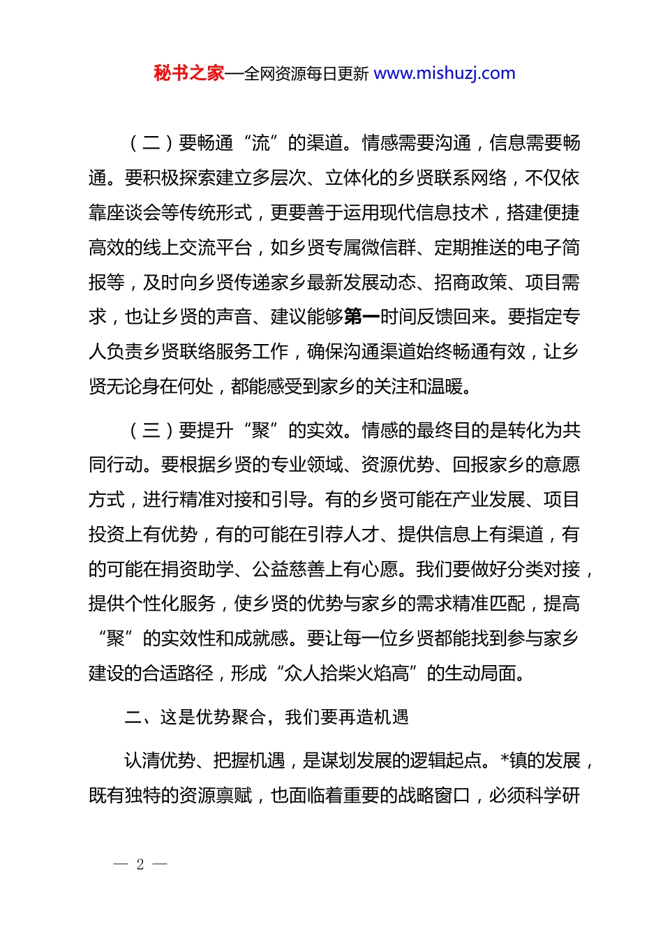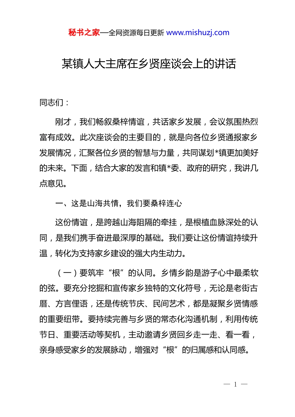 秘书之家—全网资源每日更新 www.mishuzj.com某镇人大主席在乡贤座谈会上的讲话同志们:刚才,我们畅叙桑梓情谊,共话家乡发展,会议氛围热烈富有成效。此次座谈会的主要目的,就是向各位乡贤通报家乡发展情况,汇聚各位乡贤的智慧与力量,共同谋划*镇更加美好的未来。下面,结合大家的发言和镇*委、政府的研究,我讲几点意见。一、这是山海共情,我们要桑梓连心这份情谊,是跨越山海阻隔的牵挂,是根植血脉深处的认同,是我们携手奋进最深厚的基础。我们要让这份情谊持续升温,转化为支持家乡建设的强大内生动力。(一)要筑牢“根”的认同。乡情乡韵是游子心中最柔软的弦。要充分挖掘和宣传家乡独特的文化符号,无论是老街古厝、方言俚语,还是传统节庆、民间艺术,都是凝聚乡贤情感的重要纽带。要持续完善与乡贤的常态化沟通机制,利用传统节日、重要活动等契机,主动邀请乡贤回乡走一走、看一看,亲身感受家乡的发展脉动,增强对“根”的归属感和认同感。— 1 —秘书之家—全网资源每日更新 www.mishuzj.com(二)要畅通“流”的渠道。情感需要沟通,信息需要畅通。要积极探索建立多层次、立体化的乡贤联系网络,不仅依靠座谈会等传统形式,更要善于运用现代信息技术,搭建便捷高效的线上交流平台,如乡贤专属微信群、定期推送的电子简报等,及时向乡贤传递家乡最新发展动态、招商政策、项目需求,也让乡贤的声音、建议能够第一时间反馈回来。要指定专人负责乡贤联络服务工作,确保沟通渠道始终畅通有效,让乡贤无论身在何处,都能感受到家乡的关注和温暖。(三)要提升“聚”的实效。情感的最终目的是转化为共同行动。要根据乡贤的专业领域、资源优势、回报家乡的意愿方式,进行精准对接和引导。有的乡贤可能在产业发展、项目投资上有优势,有的可能在引荐人才、提供信息上有渠道,有的可能在捐资助学、公益慈善上有心愿。我们要做好分类对接,提供个性化服务,使乡贤的优势与家乡的需求精准匹配,提高“聚”的实效性和成就感。要让每一位乡贤都能找到参与家乡建设的合适路径,形成“众人拾柴火焰高”的生动局面。二、这是优势聚合,我们要再造机遇认清优势、把握机遇,是谋划发展的逻辑起点。*镇的发展,既有独特的资源禀赋,也面临着重要的战略窗口,必须科学研— 2 —秘书之家—全网资源每日更新 www.mishuzj.com判,精准发力。(一)要放大“点”的优势。特色就是竞争力,就是发展潜力。要深入梳理和评估本镇的特色资源,例如,是否拥有独特的农产品资源,能否在精深加工、品牌打造上做文章;是否蕴含丰富的文化旅游资源,能否与发展乡村旅游、生态康养有机结合;是否具备一定的产业基础,能否通过技术改造、链条延伸实现升级。要围绕这些具有突出特色的“点”,集中资源进行重点培育和突破,打造“人无我有、人有我优”的鲜明标识。避免贪大求全、同质化竞争,坚持走差异化、特色化的发展之路。(二)要拓展“线”的链接。当今发展,必须摒弃“一亩三分地”的思维,在更广阔的空间中谋划。要主动融入区域发展大局,特别是深化“山海协作”的内涵,不能仅限于简单的帮扶,而要着力构建产业协同、优势互补的合作新模式。要积极对接沿海发达地区的产业转移和市场需求,探索“研发设计在沿海、生产转化在家乡”、“市场在都市、基地在家乡”等合作模式,将外部的资本、技术、管理、市场渠道等优质资源“引进来”,与家乡的要素成本、土地空间、特色产品等优势资源高效对接,拓展发展纵深度。— 3 —秘书之家—全网资源每日更新 www.mishuzj.com(三)要布局“面”的生态。良好的发展生态是吸引和留住各类要素的关键。核心是持续优化营商环境,要聚焦企业全生命周期服务,深化“放管服”改革,简化审批流程,提高办事效率,降低制度性交易成本。要强化法治保障,依法保护各类市场主体的合法权益,特别是知识产权保护,营造稳定、公平、透明、可预期的发展环境。要完善基础设施配套,提升教育、医疗、文化等公共服务水平,打造宜居宜业的生活空间,让投资者放心、创业者安心、就业者舒心。要树立“人人都是营商环境”的理念,形成亲商、安商、富商的浓厚氛围。(四)...
