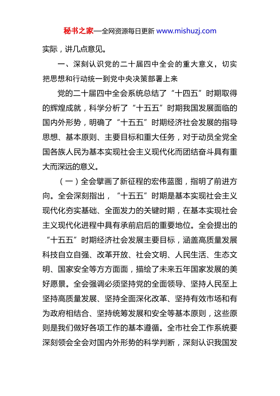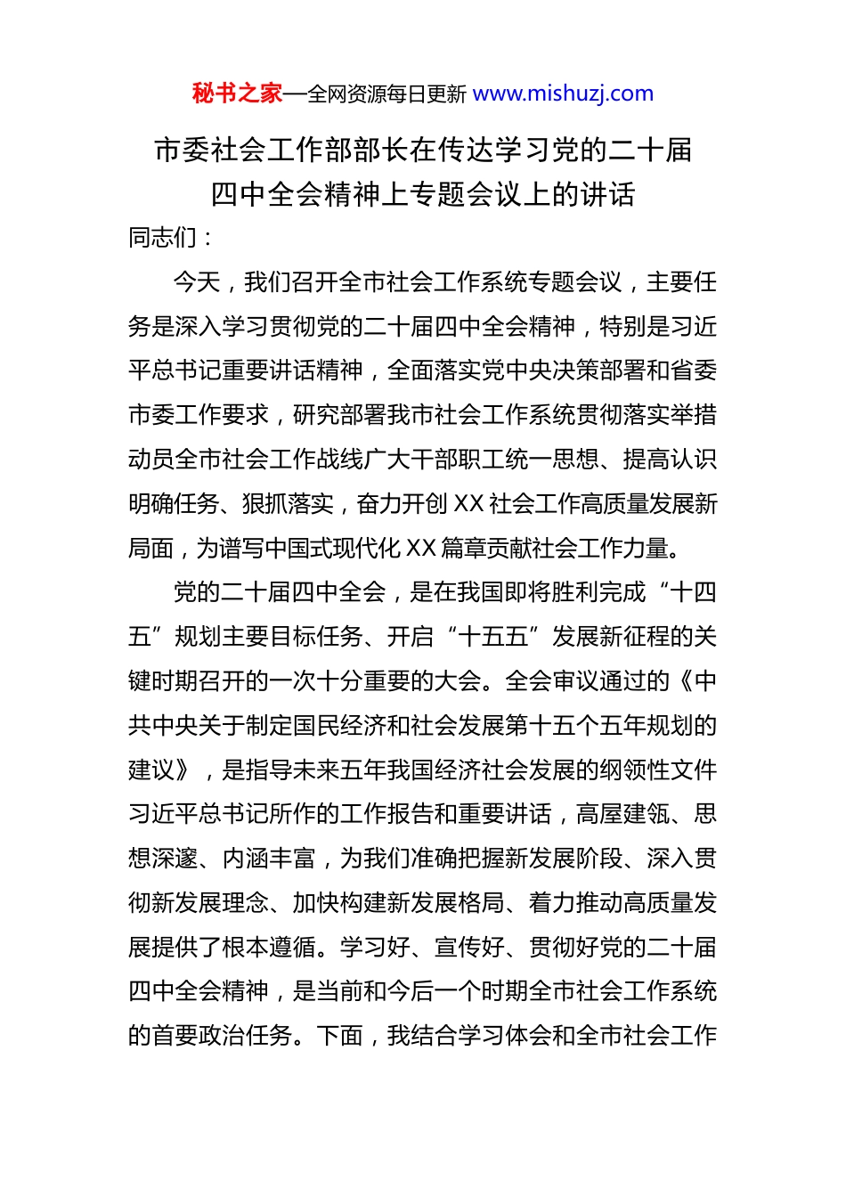 秘书之家—全网资源每日更新 www.mishuzj.com市委社会工作部部长在传达学习党的二十届四中全会精神上专题会议上的讲话 同志们:今天,我们召开全市社会工作系统专题会议,主要任务是深入学习贯彻党的二十届四中全会精神,特别是习近平总书记重要讲话精神,全面落实党中央决策部署和省委市委工作要求,研究部署我市社会工作系统贯彻落实举措动员全市社会工作战线广大干部职工统一思想、提高认识明确任务、狠抓落实,奋力开创 XX 社会工作高质量发展新局面,为谱写中国式现代化 XX 篇章贡献社会工作力量。党的二十届四中全会,是在我国即将胜利完成“十四五”规划主要目标任务、开启“十五五”发展新征程的关键时期召开的一次十分重要的大会。全会审议通过的《中共中央关于制定国民经济和社会发展第十五个五年规划的建议》,是指导未来五年我国经济社会发展的纲领性文件习近平总书记所作的工作报告和重要讲话,高屋建瓴、思想深邃、内涵丰富,为我们准确把握新发展阶段、深入贯彻新发展理念、加快构建新发展格局、着力推动高质量发展提供了根本遵循。学习好、宣传好、贯彻好党的二十届四中全会精神,是当前和今后一个时期全市社会工作系统的首要政治任务。下面,我结合学习体会和全市社会工作秘书之家—全网资源每日更新 www.mishuzj.com实际,讲几点意见。一、深刻认识党的二十届四中全会的重大意义,切实把思想和行动统一到党中央决策部署上来党的二十届四中全会系统总结了“十四五”时期取得的辉煌成就,科学分析了“十五五”时期我国发展面临的国内外形势,明确了“十五五”时期经济社会发展的指导思想、基本原则、主要目标和重大任务,对于动员全党全国各族人民为基本实现社会主义现代化而团结奋斗具有重大而深远的意义。(一)全会擘画了新征程的宏伟蓝图,指明了前进方向。全会深刻指出,“十五五”时期是基本实现社会主义现代化夯实基础、全面发力的关键时期,在基本实现社会主义现代化进程中具有承前启后的重要地位。全会提出的“十五五”时期经济社会发展主要目标,涵盖高质量发展科技自立自强、改革开放、社会文明、人民生活、生态文明、国家安全等方方面面,描绘了未来五年国家发展的美好愿景。全会强调必须坚持党的全面领导、坚持人民至上坚持高质量发展、坚持全面深化改革、坚持有效市场和有为政府相结合、坚持统筹发展和安全等基本原则,这些原则是我们做好各项工作的基本遵循。全市社会工作系统要深刻领会全会对国内外形势的科学判断,深刻认识我国发秘书之家—全网资源每日更新 www.mishuzj.com展仍处于战略机遇和风险挑战并存、不确定难预料因素增多的时期,但经济长期向好的基本面没有改变,诸多优势条件更加彰显。我们要保持战略定力,增强必胜信心,牢牢把握中国式现代化的本质要求和重大原则,自觉把社会工作融入党和国家事业发展大局中去谋划和推进。(二)全会彰显了深厚的为民情怀,凸显了价值追求。全会将“以满足人民日益增长的美好生活需要为根本目的”作为指导方针的重要内容,将“坚持人民至上”作为必须遵循的基本原则,在部署各项任务时,无论是建设强大国内市场、加快农业农村现代化,还是加大保障和改善民生力度、扎实推进共同富裕,都充分体现了以人民为中心的发展思想。全会特别强调要“切实抓好民生保障和生态环境保护”,“解决好人民群众急难愁盼问题”,“畅通社会流动渠道,提高人民生活品质”,这为我们做好新时代社会工作提供了根本指引。社会工作直接服务基层、服务群众,是践行党的群众路线、落实以人民为中心发展思想的重要领域。我们要深刻感悟全会蕴含的为民宗旨,始终把人民放在心中最高位置,把增进民生福祉作为社会工作的出发点和落脚点,努力让改革发展成果更多更公平惠及全体人民。(三)全会部署了系统的战略任务,明确了工作重点。秘书之家—全网资源每日更新 www.mishuzj.com全会从建设现代化产业体系、加快高水平科技自立自强、建设强大国内市场、构建高水平社会主义市场经济体制、扩大高水平对外开放、加快农业农村现代化、优化区域经济布局、繁荣发展社会主义文化、保障和改善民生、建设美丽中国、推进国家安全...