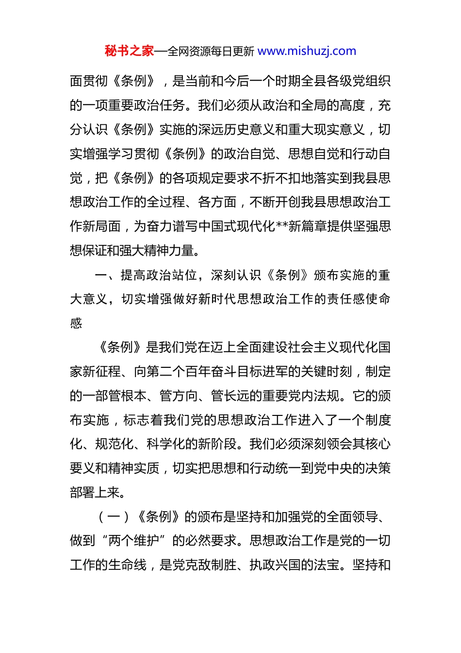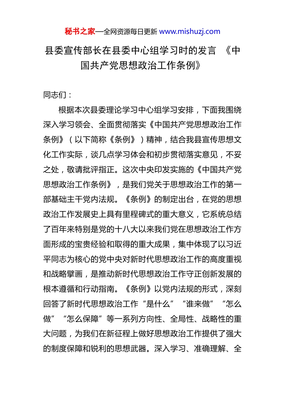 秘书之家—全网资源每日更新 www.mishuzj.com县委宣传部长在县委中心组学习时的发言 《中国共产党思想政治工作条例》同志们:根据本次县委理论学习中心组学习安排,下面我围绕深入学习领会、全面贯彻落实《中国共产党思想政治工作条例》(以下简称《条例》)精神,结合我县宣传思想文化工作实际,谈几点学习体会和初步贯彻落实意见,不妥之处,敬请批评指正。这次中央印发实施的《中国共产党思想政治工作条例》,是我们党关于思想政治工作的第一部基础主干党内法规。《条例》的制定出台,在党的思想政治工作发展史上具有里程碑式的重大意义,它系统总结了百年来特别是党的十八大以来我们党在思想政治工作方面形成的宝贵经验和取得的重大成果,集中体现了以习近平同志为核心的党中央对新时代思想政治工作的高度重视和战略擘画,是推动新时代思想政治工作守正创新发展的根本遵循和行动指南。《条例》以党内法规的形式,深刻回答了新时代思想政治工作“是什么”“谁来做”“怎么做”“怎么保障”等一系列方向性、全局性、战略性的重大问题,为我们在新征程上做好思想政治工作提供了强大的制度保障和锐利的思想武器。深入学习、准确理解、全秘书之家—全网资源每日更新 www.mishuzj.com面贯彻《条例》,是当前和今后一个时期全县各级党组织的一项重要政治任务。我们必须从政治和全局的高度,充分认识《条例》实施的深远历史意义和重大现实意义,切实增强学习贯彻《条例》的政治自觉、思想自觉和行动自觉,把《条例》的各项规定要求不折不扣地落实到我县思想政治工作的全过程、各方面,不断开创我县思想政治工作新局面,为奋力谱写中国式现代化**新篇章提供坚强思想保证和强大精神力量。一、提高政治站位,深刻认识《条例》颁布实施的重大意义,切实增强做好新时代思想政治工作的责任感使命感《条例》是我们党在迈上全面建设社会主义现代化国家新征程、向第二个百年奋斗目标进军的关键时刻,制定的一部管根本、管方向、管长远的重要党内法规。它的颁布实施,标志着我们党的思想政治工作进入了一个制度化、规范化、科学化的新阶段。我们必须深刻领会其核心要义和精神实质,切实把思想和行动统一到党中央的决策部署上来。(一)《条例》的颁布是坚持和加强党的全面领导、做到“两个维护”的必然要求。思想政治工作是党的一切工作的生命线,是党克敌制胜、执政兴国的法宝。坚持和秘书之家—全网资源每日更新 www.mishuzj.com加强党的全面领导,最根本的是坚持党中央权威和集中统一领导,而强有力的思想政治工作正是确保全党在思想上政治上行动上同以习近平同志为核心的党中央保持高度一致的重要途径。《条例》通篇贯穿了坚持和加强党对思想政治工作全面领导这一根本原则,明确规定了党委(党组)的主体责任、书记的第一责任人责任、领导班子成员的“一岗双责”,以及宣传部门、纪检监察机关、组织部门等的具体职责,构建了权责清晰、齐抓共管的责任体系。这从制度机制上确保了党牢牢掌握思想政治工作领导权,确保了思想政治工作始终沿着正确政治方向前进,是全党深刻领悟“两个确立”的决定性意义、坚决做到“两个维护”在思想政治工作领域的具体体现和制度保障。学习贯彻《条例》,首先就要牢牢把握这个最高原则,不断提高政治判断力、政治领悟力、政治执行力,确保我县思想政治工作始终置于党的绝对领导之下,一切工作都朝着坚持和加强党的全面领导来聚焦、来发力。(二)《条例》的颁布是发扬彻底自我革命精神、深入推进全面从严治党的战略举措。勇于自我革命是我们党区别于其他政党的显著标志。思想政治建设是党的基础性建设,是推进党的自我革命的重要抓手。历史和现实都表明,一个政党的衰落,往往是从理想信念的动摇和丧失开秘书之家—全网资源每日更新 www.mishuzj.com始的。《条例》聚焦解决“总开关”问题,对用党的创新理论武装全党、教育人民作出了系统部署,对坚定党员干部的理想信念提出了明确要求,对加强道德建设和党风廉政建设作出了制度安排。这充分体现了我们党以永远在路上的清醒和坚定,依靠思想政治工作这一有力武器,不断进行自我净化、自我完善、自我革新、自...