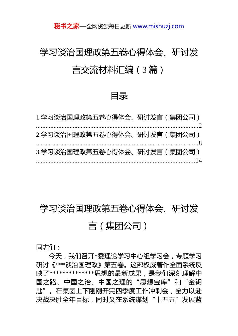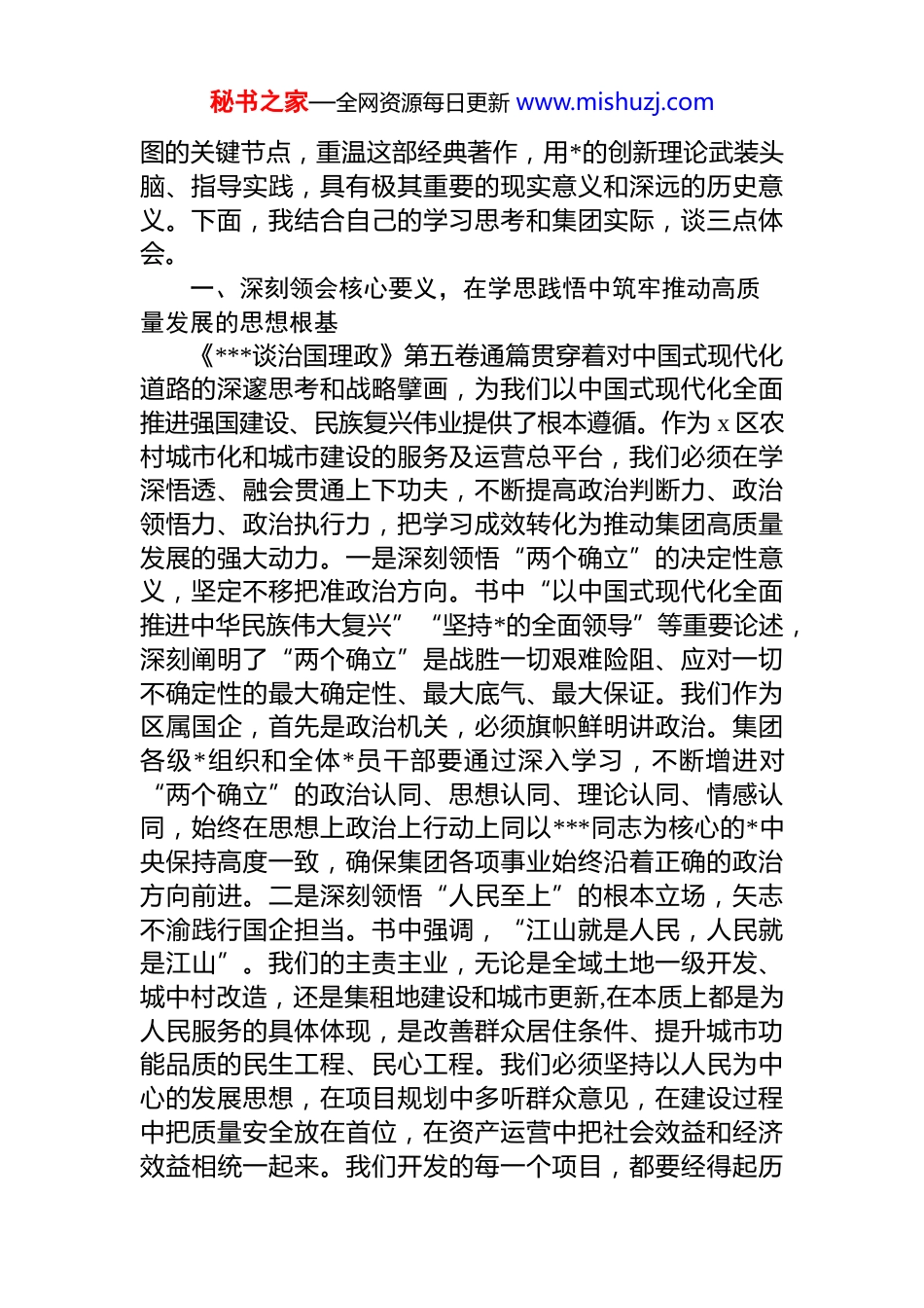 秘书之家—全网资源每日更新 www.mishuzj.com学习谈治国理政第五卷心得体会、研讨发言交流材料汇编(3 篇)目录1.学习谈治国理政第五卷心得体会、研讨发言(集团公司).....................................................................................................22.学习谈治国理政第五卷心得体会、研讨发言(集团公司).....................................................................................................83.学习谈治国理政第五卷心得体会、研讨发言(集团公司)...................................................................................................14学习谈治国理政第五卷心得体会、研讨发言(集团公司)同志们:今天,我们召开*委理论学习中心组学习会,专题学习研讨《***谈治国理政》第五卷。这部权威著作全面系统反映了**************思想的最新成果,是我们深刻理解中国之路、中国之治、中国之理的“思想宝库”和“金钥匙”。在集团上下刚刚开完四季度工作冲刺会,全力以赴决战决胜全年目标,同时又在系统谋划“十五五”发展蓝秘书之家—全网资源每日更新 www.mishuzj.com图的关键节点,重温这部经典著作,用*的创新理论武装头脑、指导实践,具有极其重要的现实意义和深远的历史意义。下面,我结合自己的学习思考和集团实际,谈三点体会。一、深刻领会核心要义,在学思践悟中筑牢推动高质量发展的思想根基《***谈治国理政》第五卷通篇贯穿着对中国式现代化道路的深邃思考和战略擘画,为我们以中国式现代化全面推进强国建设、民族复兴伟业提供了根本遵循。作为 x 区农村城市化和城市建设的服务及运营总平台,我们必须在学深悟透、融会贯通上下功夫,不断提高政治判断力、政治领悟力、政治执行力,把学习成效转化为推动集团高质量发展的强大动力。一是深刻领悟“两个确立”的决定性意义,坚定不移把准政治方向。书中“以中国式现代化全面推进中华民族伟大复兴”“坚持*的全面领导”等重要论述,深刻阐明了“两个确立”是战胜一切艰难险阻、应对一切不确定性的最大确定性、最大底气、最大保证。我们作为区属国企,首先是政治机关,必须旗帜鲜明讲政治。集团各级*组织和全体*员干部要通过深入学习,不断增进对“两个确立”的政治认同、思想认同、理论认同、情感认同,始终在思想上政治上行动上同以***同志为核心的*中央保持高度一致,确保集团各项事业始终沿着正确的政治方向前进。二是深刻领悟“人民至上”的根本立场,矢志不渝践行国企担当。书中强调,“江山就是人民,人民就是江山”。我们的主责主业,无论是全域土地一级开发、城中村改造,还是集租地建设和城市更新,在本质上都是为人民服务的具体体现,是改善群众居住条件、提升城市功能品质的民生工程、民心工程。我们必须坚持以人民为中心的发展思想,在项目规划中多听群众意见,在建设过程中把质量安全放在首位,在资产运营中把社会效益和经济效益相统一起来。我们开发的每一个项目,都要经得起历秘书之家—全网资源每日更新 www.mishuzj.com史和人民的检验;我们运营的每一处资产,都要切实增强人民群众的获得感、幸福感、安全感。三是深刻领悟“高质量发展”的首要任务,奋发有为服务区域大局。书中指出,“高质量发展是全面建设社会主义现代化国家的首要任务。”对集团而言,高质量发展就是要摆脱过去单纯追求规模和速度的路径依赖,转向更加注重质量、效益和可持续发展的内涵式增长。这意味着我们的一级开发不能只算经济账,更要算好生态账、社会账;我们的城市更新不能搞大拆大建,而是要以“绣花”功夫推进有机更新;我们的固定资产运营不能满足于做“二手房东”,而是要通过专业化、精细化、智慧化运营,提升资产价值和区域活力。我们必须将高质量发展要求贯穿于集团工作的各方面和全过程,争当 x 区经济社会高质量发展的排头兵和主力军。二、全面贯彻实践要求,在实干担当中打赢决胜全年的收官之战学习的目的全在于运用。检验我们学习成效的最好“试金石”,就是看我们能否将思想伟力转化为攻坚克难干事创业的实际行动。当前,2025 年只剩下不到...