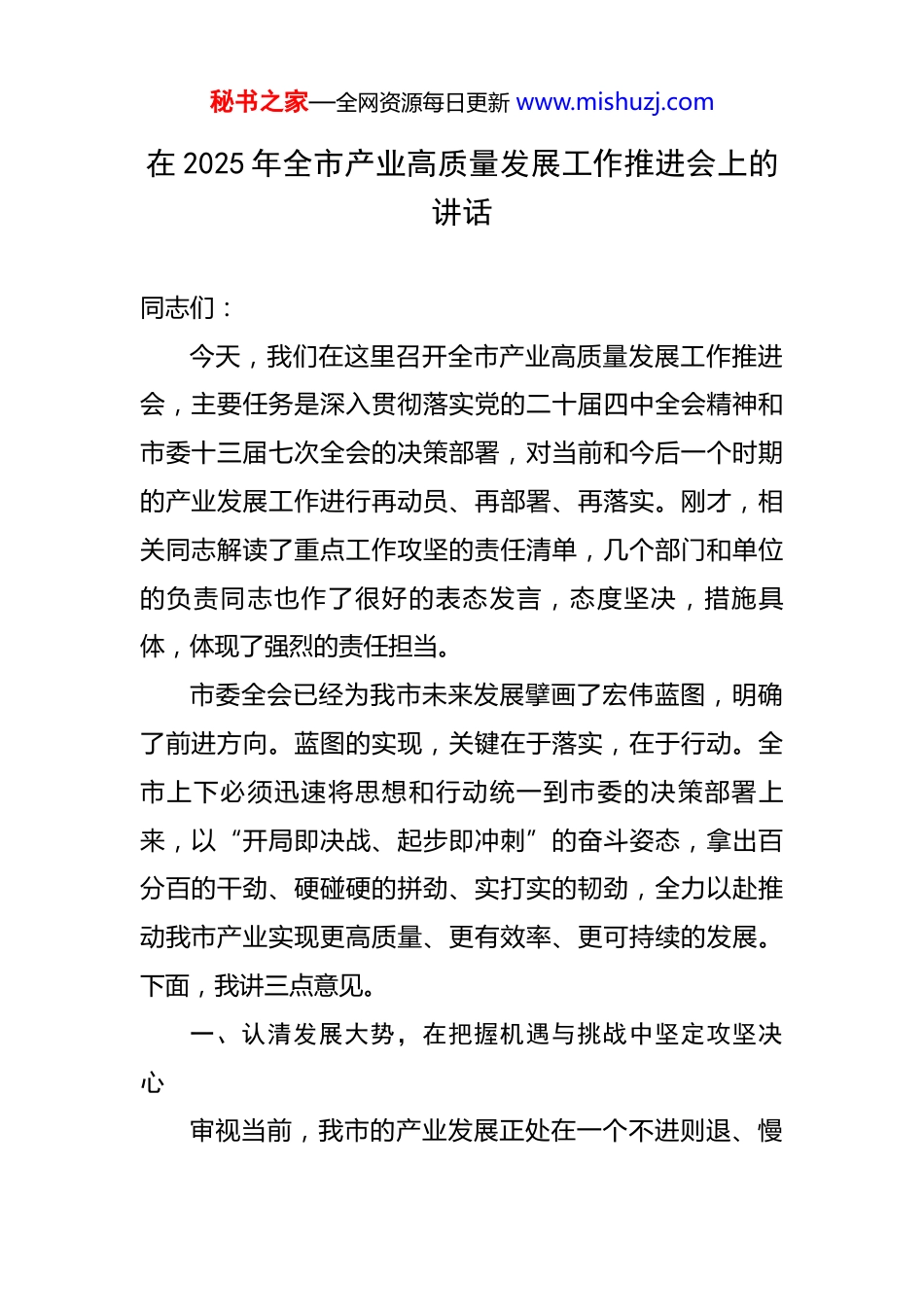 秘书之家—全网资源每日更新 www.mishuzj.com在 2025 年全市产业高质量发展工作推进会上的讲话 同志们:今天,我们在这里召开全市产业高质量发展工作推进会,主要任务是深入贯彻落实党的二十届四中全会精神和市委十三届七次全会的决策部署,对当前和今后一个时期的产业发展工作进行再动员、再部署、再落实。刚才,相关同志解读了重点工作攻坚的责任清单,几个部门和单位的负责同志也作了很好的表态发言,态度坚决,措施具体,体现了强烈的责任担当。市委全会已经为我市未来发展擘画了宏伟蓝图,明确了前进方向。蓝图的实现,关键在于落实,在于行动。全市上下必须迅速将思想和行动统一到市委的决策部署上来,以“开局即决战、起步即冲刺”的奋斗姿态,拿出百分百的干劲、硬碰硬的拼劲、实打实的韧劲,全力以赴推动我市产业实现更高质量、更有效率、更可持续的发展。下面,我讲三点意见。一、认清发展大势,在把握机遇与挑战中坚定攻坚决心审视当前,我市的产业发展正处在一个不进则退、慢秘书之家—全网资源每日更新 www.mishuzj.com进也是退的关键节点。我们既要看到成绩和机遇,增强发展的信心与底气;也要正视差距和挑战,保持清醒的头脑和奋起直追的紧迫感。从宏观态势看,机遇与挑战并存。一方面,新一轮科技革命和产业变革深入发展,国家大力推进新型工业化,特别是将生物制造等作为战略性新兴产业加以重点布局,为我们发挥比较优势、抢占未来产业新赛道提供了历史性机遇。今年以来,中央和省级层面出台了一系列稳定经济增长、优化营商环境、支持实体经济发展的政策措施,政策的叠加效应正在持续释放。另一方面,全球经济复苏乏力,产业链、供应链区域化、本土化趋势加剧,外部环境的复杂性、严峻性、不确定性上升。区域竞争日趋白热化,周边兄弟城市你追我赶、争先进位,发展态势咄咄逼人。如果我们稍有松懈,就可能在新一轮的区域竞争格局中被边缘化。从我市自身看,优势与短板共生。过去一段时间,在全市上下的共同努力下,我市经济运行保持了稳中有进的良好态势。根据最新统计,2025 年上半年,全市实现地区生产总值 5800 亿元,同比增长 5.5%,三次产业结构优化为 4.5:37.5:58.0,第三产业增加值占比首次突破 58%。这表明我市的经济结构正在发生积极变化,发展质量稳步提升。特别是我们前瞻性布局的生物制造产业,已经初具规模,为我们打造“全秘书之家—全网资源每日更新 www.mishuzj.com国生物制造产业先导区”奠定了坚实基础。然而,我们必须清醒地认识到存在的突出问题。一是产业结构“大而不强”的问题依然存在,传统产业占比仍然偏高,战略性新兴产业虽有亮点,但体量偏小,未能形成强大的带动效应。二是创新能力“多而不优”,全社会研发投入强度有待提高,企业作为创新主体的地位还不够突出,高水平的创新平台和领军人才相对匮乏。三是要素制约“紧而趋紧”,土地、能耗、环境容量等硬约束日益趋紧,企业融资难、融资贵的问题尚未得到根本解决。这些问题,都是我们推进高质量发展必须啃下的“硬骨头”。因此,全市各级党员干部必须牢固树立三种意识。第一,是“不进则退、慢进也是退”的危机意识。要深刻认识到,躺在过去的功劳簿上沾沾自喜,或者满足于一般的增长速度,无异于逆水行舟,终将被时代和竞争对手所淘汰。第二,是“人无我有、人有我优”的创新意识。要把创新作为引领发展的第一动力,敢于走别人没有走过的路,敢于做别人不敢做的事,在关键核心技术、新兴产业赛道上实现非对称赶超。第三,是“争先创优、走在前列”的竞争意识。要打破思维定式和路径依赖,敢于同最优者“对标”、与最强者“赛跑”,在各项工作中树立最高标准,追求最好结果,确保我市在区域发展格局中占据秘书之家—全网资源每日更新 www.mishuzj.com有利位置。二、聚焦关键环节,以超常举措坚决打赢“五大攻坚战”目标已经明确,关键在于落实。市委全会提出的“五大攻坚”,是当前和今后一个时期推动我市产业高质量发展的总抓手,是破解发展难题、厚植发展优势的“牛鼻子”。各级各部门必须将全部精力聚焦于此,逐项分解任务,逐条压实责任,确保各项攻坚任务落地生...