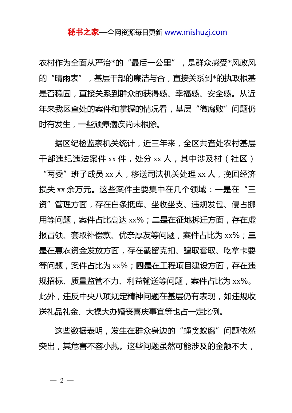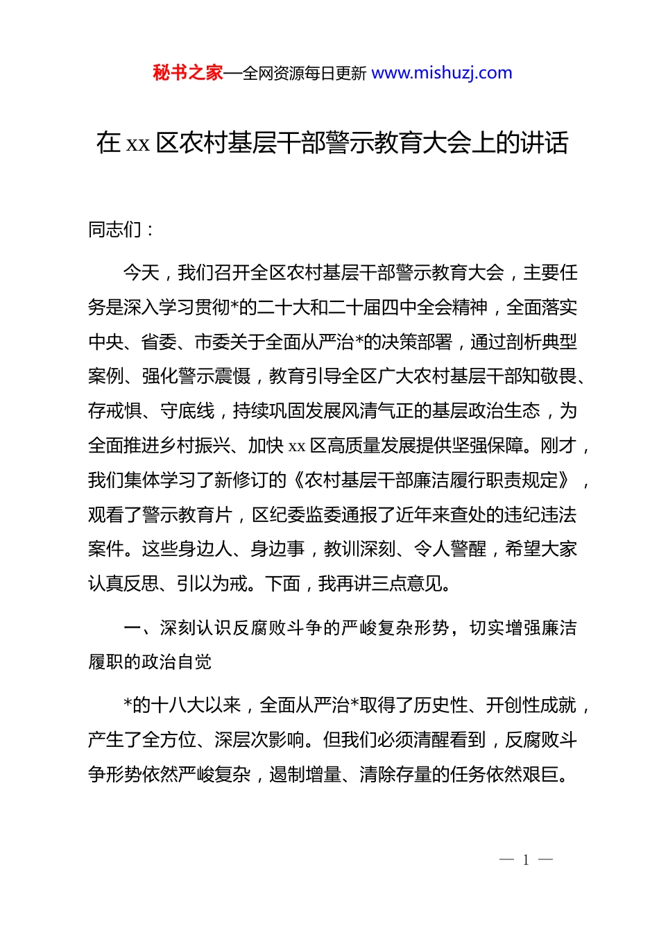 秘书之家—全网资源每日更新 www.mishuzj.com在 xx 区农村基层干部警示教育大会上的讲话同志们:今天,我们召开全区农村基层干部警示教育大会,主要任务是深入学习贯彻*的二十大和二十届四中全会精神,全面落实中央、省委、市委关于全面从严治*的决策部署,通过剖析典型案例、强化警示震慑,教育引导全区广大农村基层干部知敬畏、存戒惧、守底线,持续巩固发展风清气正的基层政治生态,为全面推进乡村振兴、加快 xx 区高质量发展提供坚强保障。刚才,我们集体学习了新修订的《农村基层干部廉洁履行职责规定》,观看了警示教育片,区纪委监委通报了近年来查处的违纪违法案件。这些身边人、身边事,教训深刻、令人警醒,希望大家认真反思、引以为戒。下面,我再讲三点意见。一、深刻认识反腐败斗争的严峻复杂形势,切实增强廉洁履职的政治自觉*的十八大以来,全面从严治*取得了历史性、开创性成就,产生了全方位、深层次影响。但我们必须清醒看到,反腐败斗争形势依然严峻复杂,遏制增量、清除存量的任务依然艰巨。— 1 —秘书之家—全网资源每日更新 www.mishuzj.com农村作为全面从严治*的“最后一公里”,是群众感受*风政风的“晴雨表”,基层干部的廉洁与否,直接关系到*的执政根基是否稳固,直接关系到群众的获得感、幸福感、安全感。从近年来我区查处的案件和掌握的情况看,基层“微腐败”问题仍时有发生,一些顽瘴痼疾尚未根除。据区纪检监察机关统计,近三年来,全区共查处农村基层干部违纪违法案件 xx 件,处分 xx 人,其中涉及村(社区)“两委”班子成员 xx 人,移送司法机关处理 xx 人,挽回经济损失 xx 余万元。这些案件主要集中在几个领域:一是在“三资”管理方面,存在白条抵库、坐收坐支、违规发包、侵占挪用等问题,案件占比高达 xx%;二是在征地拆迁方面,存在虚报冒领、套取补偿款、优亲厚友等问题,案件占比为 xx%;三是在惠农资金发放方面,存在截留克扣、骗取套取、吃拿卡要等问题,案件占比为 xx%;四是在工程项目建设方面,存在违规招标、质量监管不力、利益输送等问题,案件占比为 xx%。此外,违反中央八项规定精神问题在基层仍有表现,如违规收送礼品礼金、大操大办婚丧喜庆事宜等也占一定比例。这些数据表明,发生在群众身边的“蝇贪蚁腐”问题依然突出,其危害不容小觑。这些问题虽然可能涉及的金额不大,— 2 —秘书之家—全网资源每日更新 www.mishuzj.com但对群众的伤害最直接,对*的形象损害最严重。如果任其蔓延,就会像温水煮青蛙一样,逐渐侵蚀*的执政根基,动摇我们的事业之本。全区广大农村基层干部必须从政治高度深刻认识廉洁履职的极端重要性,深刻理解*中央推进全面从严治*向基层延伸的坚定决心,时刻保持清醒头脑,始终把纪律和规矩挺在前面,做到政治上讲忠诚、组织上讲服从、行动上讲纪律,以实际行动践行“两个维护”。二、深入剖析违纪违法案件的思想根源,切实筑牢拒腐防变的思想堤坝剖析违纪违法案例,我们不能仅仅停留在对事实的震惊和对当事人的惋惜上,更要深挖其背后的思想根源和制度漏洞,真正做到以案为鉴、以案促改。这些落马的干部,并非一开始就腐化堕落,他们中的许多人也曾是带领群众致富的能人、兢兢业业的好干部。但最终走上不归路,究其根本,是思想上的“总开关”出了问题。一是理想信念动摇,精神“缺钙”。一些干部长期放松政治理论学习,对**************思想学之不深、悟之不透,世界观、人生观、价值观发生扭曲。面对市场经济浪潮和各种诱惑,逐渐忘记了入*为什么、当官干什么、身后留什么,把*和— 3 —秘书之家—全网资源每日更新 www.mishuzj.com人民赋予的权力视为谋取私利的工具,最终在权力、金钱、美色的考验面前败下阵来。二是纪法意识淡薄,心存侥幸。部分基层干部法纪观念极其淡薄,对 dj 国法缺乏应有的敬畏之心。他们或者认为自己“官小位卑”,纪检监察机关管不到、顾不上;或者认为“天高皇帝远”,自己的小动作神不知鬼不觉;或者错误地认为“法不责众”,看到别人这么做自己也就跟着做。正是这种“小节无害”的错误思想和“碰运气”的侥幸心理,让他们在违纪违法...