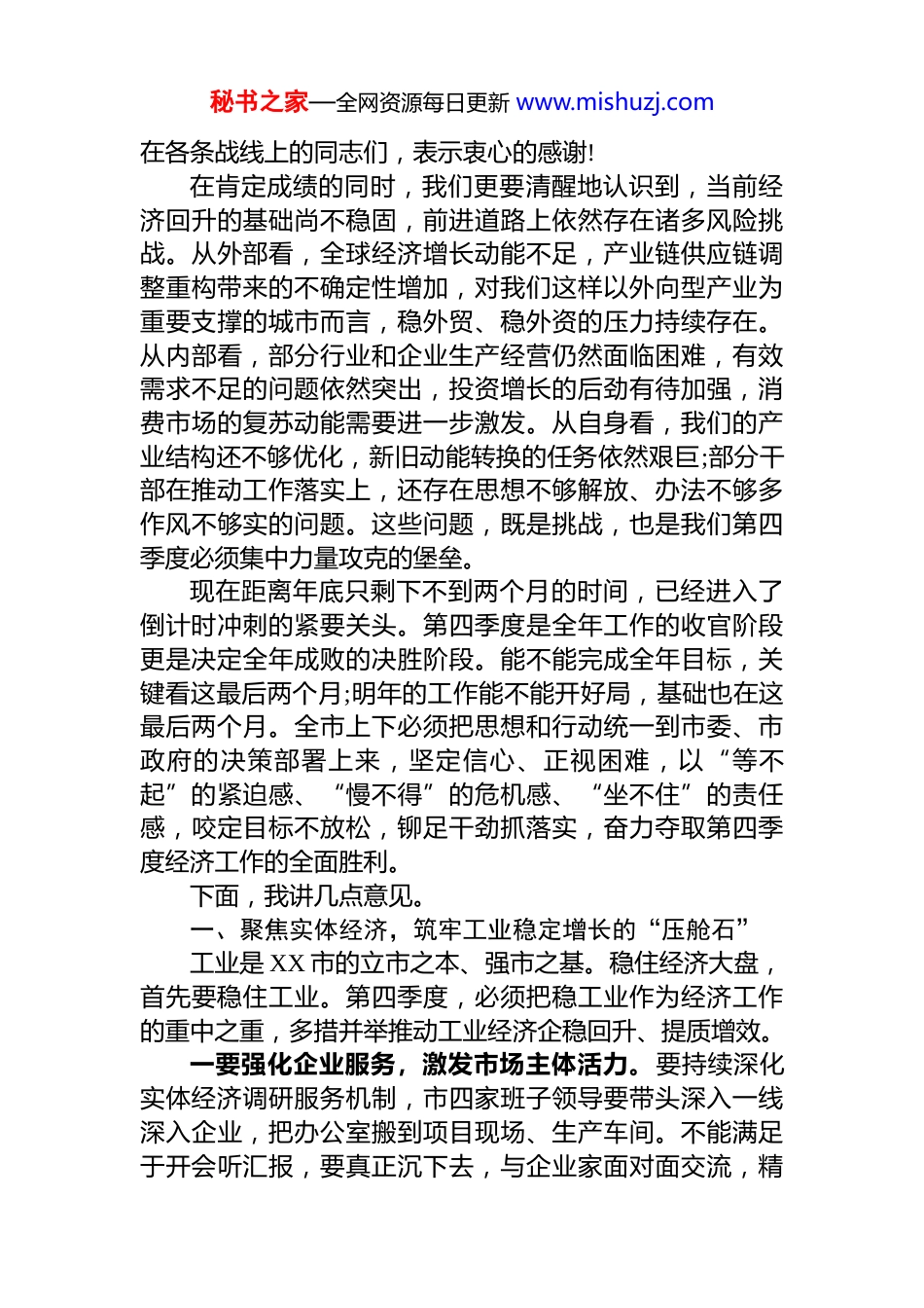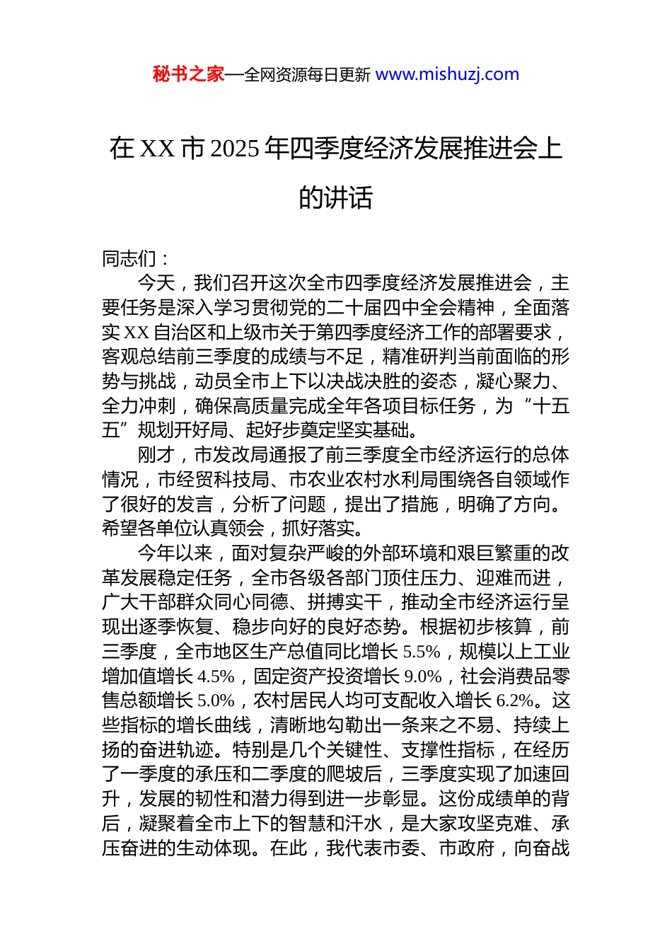 秘书之家—全网资源每日更新 www.mishuzj.com在 XX 市 2025 年四季度经济发展推进会上的讲话同志们:今天,我们召开这次全市四季度经济发展推进会,主要任务是深入学习贯彻党的二十届四中全会精神,全面落实 XX 自治区和上级市关于第四季度经济工作的部署要求,客观总结前三季度的成绩与不足,精准研判当前面临的形势与挑战,动员全市上下以决战决胜的姿态,凝心聚力、全力冲刺,确保高质量完成全年各项目标任务,为“十五五”规划开好局、起好步奠定坚实基础。刚才,市发改局通报了前三季度全市经济运行的总体情况,市经贸科技局、市农业农村水利局围绕各自领域作了很好的发言,分析了问题,提出了措施,明确了方向。希望各单位认真领会,抓好落实。今年以来,面对复杂严峻的外部环境和艰巨繁重的改革发展稳定任务,全市各级各部门顶住压力、迎难而进,广大干部群众同心同德、拼搏实干,推动全市经济运行呈现出逐季恢复、稳步向好的良好态势。根据初步核算,前三季度,全市地区生产总值同比增长 5.5%,规模以上工业增加值增长 4.5%,固定资产投资增长 9.0%,社会消费品零售总额增长 5.0%,农村居民人均可支配收入增长 6.2%。这些指标的增长曲线,清晰地勾勒出一条来之不易、持续上扬的奋进轨迹。特别是几个关键性、支撑性指标,在经历了一季度的承压和二季度的爬坡后,三季度实现了加速回升,发展的韧性和潜力得到进一步彰显。这份成绩单的背后,凝聚着全市上下的智慧和汗水,是大家攻坚克难、承压奋进的生动体现。在此,我代表市委、市政府,向奋战秘书之家—全网资源每日更新 www.mishuzj.com在各条战线上的同志们,表示衷心的感谢!在肯定成绩的同时,我们更要清醒地认识到,当前经济回升的基础尚不稳固,前进道路上依然存在诸多风险挑战。从外部看,全球经济增长动能不足,产业链供应链调整重构带来的不确定性增加,对我们这样以外向型产业为重要支撑的城市而言,稳外贸、稳外资的压力持续存在。从内部看,部分行业和企业生产经营仍然面临困难,有效需求不足的问题依然突出,投资增长的后劲有待加强,消费市场的复苏动能需要进一步激发。从自身看,我们的产业结构还不够优化,新旧动能转换的任务依然艰巨;部分干部在推动工作落实上,还存在思想不够解放、办法不够多作风不够实的问题。这些问题,既是挑战,也是我们第四季度必须集中力量攻克的堡垒。现在距离年底只剩下不到两个月的时间,已经进入了倒计时冲刺的紧要关头。第四季度是全年工作的收官阶段更是决定全年成败的决胜阶段。能不能完成全年目标,关键看这最后两个月;明年的工作能不能开好局,基础也在这最后两个月。全市上下必须把思想和行动统一到市委、市政府的决策部署上来,坚定信心、正视困难,以“等不起”的紧迫感、“慢不得”的危机感、“坐不住”的责任感,咬定目标不放松,铆足干劲抓落实,奋力夺取第四季度经济工作的全面胜利。下面,我讲几点意见。一、聚焦实体经济,筑牢工业稳定增长的“压舱石”工业是 XX 市的立市之本、强市之基。稳住经济大盘,首先要稳住工业。第四季度,必须把稳工业作为经济工作的重中之重,多措并举推动工业经济企稳回升、提质增效。一要强化企业服务,激发市场主体活力。要持续深化实体经济调研服务机制,市四家班子领导要带头深入一线深入企业,把办公室搬到项目现场、生产车间。不能满足于开会听汇报,要真正沉下去,与企业家面对面交流,精秘书之家—全网资源每日更新 www.mishuzj.com准掌握企业在生产、融资、用工、物流等方面的“急难愁盼”问题。要建立问题清单、责任清单、销号清单,实行“一企一策”精准帮扶,切实把减税降费、融资支持、要素保障等各项惠企政策,不折不扣地送到企业手中,让企业感受到实实在在的温暖,增强发展的信心。二要强化增产扩能,深挖重点产业潜力。要紧盯全市产值贡献大、带动能力强的龙头骨干企业,加强生产要素调度保障,鼓励企业开足马力、释放产能。特别是对于 XX装备制造、XX 化工、XX 农产品深加工等主导产业,要引导企业积极抢抓市场机遇,巩固拓展销售渠道,争取更多订单,努力实现满产超产。同时,要加强“规下转...