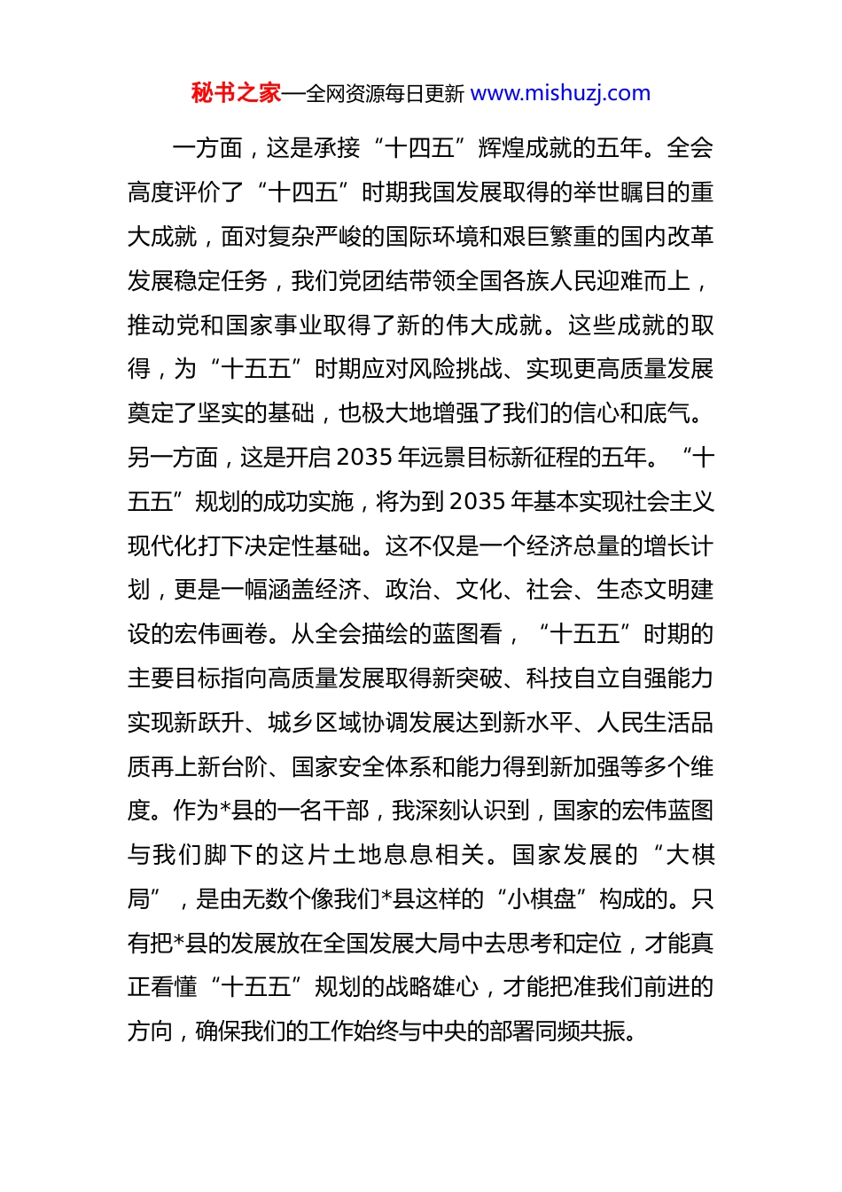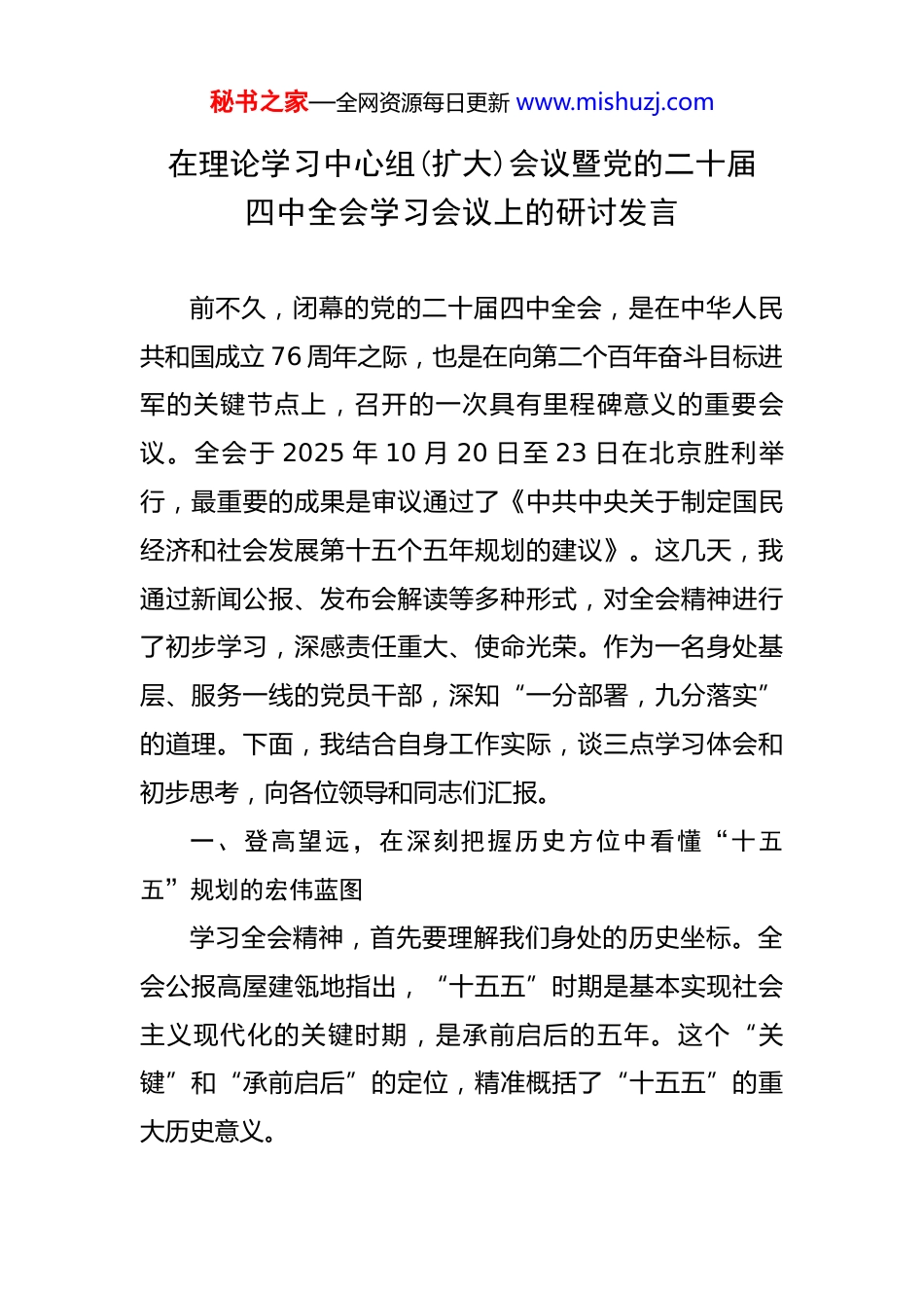 秘书之家—全网资源每日更新 www.mishuzj.com在理论学习中心组(扩大)会议暨党的二十届四中全会学习会议上的研讨发言 前不久,闭幕的党的二十届四中全会,是在中华人民共和国成立 76 周年之际,也是在向第二个百年奋斗目标进军的关键节点上,召开的一次具有里程碑意义的重要会议。全会于 2025 年 10 月 20 日至 23 日在北京胜利举行,最重要的成果是审议通过了《中共中央关于制定国民经济和社会发展第十五个五年规划的建议》。这几天,我通过新闻公报、发布会解读等多种形式,对全会精神进行了初步学习,深感责任重大、使命光荣。作为一名身处基层、服务一线的党员干部,深知“一分部署,九分落实”的道理。下面,我结合自身工作实际,谈三点学习体会和初步思考,向各位领导和同志们汇报。一、登高望远,在深刻把握历史方位中看懂“十五五”规划的宏伟蓝图学习全会精神,首先要理解我们身处的历史坐标。全会公报高屋建瓴地指出,“十五五”时期是基本实现社会主义现代化的关键时期,是承前启后的五年。这个“关键”和“承前启后”的定位,精准概括了“十五五”的重大历史意义。秘书之家—全网资源每日更新 www.mishuzj.com一方面,这是承接“十四五”辉煌成就的五年。全会高度评价了“十四五”时期我国发展取得的举世瞩目的重大成就,面对复杂严峻的国际环境和艰巨繁重的国内改革发展稳定任务,我们党团结带领全国各族人民迎难而上,推动党和国家事业取得了新的伟大成就。这些成就的取得,为“十五五”时期应对风险挑战、实现更高质量发展奠定了坚实的基础,也极大地增强了我们的信心和底气。另一方面,这是开启 2035 年远景目标新征程的五年。“十五五”规划的成功实施,将为到 2035 年基本实现社会主义现代化打下决定性基础。这不仅是一个经济总量的增长计划,更是一幅涵盖经济、政治、文化、社会、生态文明建设的宏伟画卷。从全会描绘的蓝图看,“十五五”时期的主要目标指向高质量发展取得新突破、科技自立自强能力实现新跃升、城乡区域协调发展达到新水平、人民生活品质再上新台阶、国家安全体系和能力得到新加强等多个维度。作为*县的一名干部,我深刻认识到,国家的宏伟蓝图与我们脚下的这片土地息息相关。国家发展的“大棋局”,是由无数个像我们*县这样的“小棋盘”构成的。只有把*县的发展放在全国发展大局中去思考和定位,才能真正看懂“十五五”规划的战略雄心,才能把准我们前进的方向,确保我们的工作始终与中央的部署同频共振。秘书之家—全网资源每日更新 www.mishuzj.com二、对标对表,在精准理解战略意图中校准个人奋斗前行的思想航向全会《建议》和公报内容博大精深,蕴含着一系列新的战略部署和重要论断。作为基层干部,学习领会不能停留在表面,必须做到对标对表,用中央的战略意图校准自己的思想和行动。首先,要牢牢把握“高质量发展”这一首要任务。全会公报再次强调,高质量发展是全面建设社会主义现代化国家的首要任务。中共中央在 10 月 24 日举行的新闻发布会上也明确指出,“十五五”时期的发展必须是高质量的发展。这意味着过去那种粗放式、高耗能的增长模式已经彻底成为历史。结合我们*县的实际,这就要求我们在招商引资、项目建设中,不能再“捡到篮子里都是菜”,而是要更加注重项目的科技含量、环境效益和产业链带动能力。特别是全会提出的“发展新质生产力”和“前瞻布局未来产业”为我们指明了产业转型升级的根本路径。我们必须思考,*县的传统产业如何通过技术改造焕发新生?我们又该如何培育和引进能够形成新兴支柱产业的“种子”企业?这是摆在我们面前的时代课题。其次,要深刻理解“统筹发展和安全”这一重要方法论。全会强调,要更好地统筹发展和安全,以新安全格局秘书之家—全网资源每日更新 www.mishuzj.com保障新发展格局。这里的“安全”是广义的、全方位的,不仅包括传统的国防安全、社会稳定,更包括粮食安全、能源资源安全、产业链供应链安全和生态安全。对于我们县域而言,这意味着在谋划发展项目时,必须同步进行风险评估;在推动经济增长时,必须守住耕地和生态保护红线;在改善民生时,必须筑牢安全...