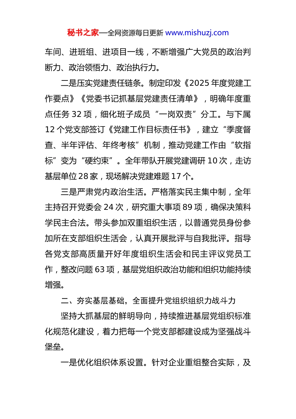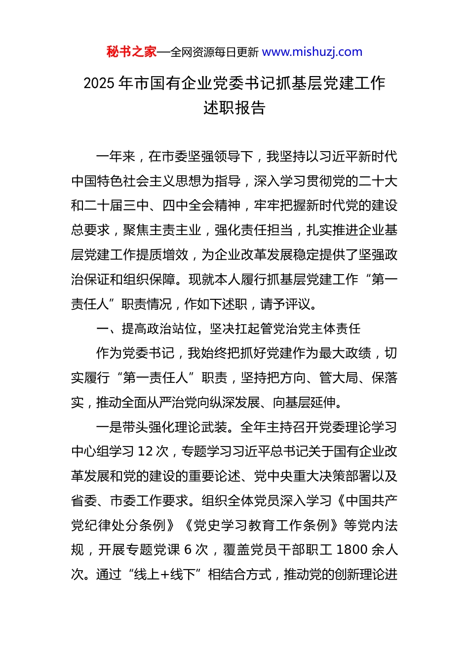 秘书之家—全网资源每日更新 www.mishuzj.com2025 年市国有企业党委书记抓基层党建工作述职报告 一年来,在市委坚强领导下,我坚持以习近平新时代中国特色社会主义思想为指导,深入学习贯彻党的二十大和二十届三中、四中全会精神,牢牢把握新时代党的建设总要求,聚焦主责主业,强化责任担当,扎实推进企业基层党建工作提质增效,为企业改革发展稳定提供了坚强政治保证和组织保障。现就本人履行抓基层党建工作“第一责任人”职责情况,作如下述职,请予评议。一、提高政治站位,坚决扛起管党治党主体责任作为党委书记,我始终把抓好党建作为最大政绩,切实履行“第一责任人”职责,坚持把方向、管大局、保落实,推动全面从严治党向纵深发展、向基层延伸。一是带头强化理论武装。全年主持召开党委理论学习中心组学习 12 次,专题学习习近平总书记关于国有企业改革发展和党的建设的重要论述、党中央重大决策部署以及省委、市委工作要求。组织全体党员深入学习《中国共产党纪律处分条例》《党史学习教育工作条例》等党内法规,开展专题党课 6 次,覆盖党员干部职工 1800 余人次。通过“线上+线下”相结合方式,推动党的创新理论进秘书之家—全网资源每日更新 www.mishuzj.com车间、进班组、进项目一线,不断增强广大党员的政治判断力、政治领悟力、政治执行力。二是压实党建责任链条。制定印发《2025 年度党建工作要点》《党委书记抓基层党建责任清单》,明确年度重点任务 32 项,细化班子成员“一岗双责”分工。与下属12 个党支部签订《党建工作目标责任书》,建立“季度督查、半年评估、年终考核”机制,推动党建工作由“软指标”变为“硬约束”。全年带队开展党建调研 10 次,走访基层单位 28 家,现场解决党建难题 17 个。三是严肃党内政治生活。严格落实民主集中制,全年主持召开党委会 24 次,研究重大事项 89 项,确保决策科学民主合法。带头参加双重组织生活,以普通党员身份参加所在支部组织生活会,认真开展批评与自我批评。指导各党支部高质量开好年度组织生活会和民主评议党员工作,整改问题 63 项,基层党组织政治功能和组织功能持续增强。二、夯实基层基础,全面提升党组织组织力战斗力坚持大抓基层的鲜明导向,持续推进基层党组织标准化规范化建设,着力把每一个党支部都建设成为坚强战斗堡垒。一是优化组织体系设置。针对企业重组整合实际,及秘书之家—全网资源每日更新 www.mishuzj.com时调整优化基层党组织架构,新设立党支部 3 个,撤销合并空壳支部 2 个,实现党组织在重点项目、外派团队、混合所有制企业中的全覆盖。选优配强党支部书记队伍,推行“双向进入、交叉任职”,12 名党支部书记全部由中层正职以上干部担任,其中具有高级职称或硕士以上学历占比达 75%。二是深化党建品牌创建。持续推进“一支部一品牌”建设,打造“红色引擎·匠心筑梦”“先锋工地·党旗飘扬”等特色党建品牌 6 个。深入开展“党员示范岗”“党员责任区”“党员突击队”创建活动,全年组建党员攻关小组45 个,完成技术革新项目 28 项,节约成本超 1200 万元。在重点工程建设一线设立临时党支部 5 个,实现“项目建到哪里,党组织就覆盖到哪里,作用就发挥到哪里”。三是加强党员教育管理。严把发展党员政治关,全年新发展党员 36 名,其中一线职工占比 83%,高知群体和青年骨干占比显著提升。依托“学习强国”“国资云课堂”等平台,组织党员轮训 3 轮,培训时长人均达 60 学时。健全党员积分管理制度,将参与组织生活、志愿服务、岗位贡献等情况量化评分,作为评优评先重要依据。稳妥处置不合格党员 2 名,保持队伍纯洁性。秘书之家—全网资源每日更新 www.mishuzj.com三、坚持党建引领,推动党建工作与生产经营深度融合始终坚持“围绕发展抓党建、抓好党建促发展”的工作思路,充分发挥党组织把关定向、凝心聚力作用,推动党建工作深度融入企业治理各环节。一是服务改革发展大局。积极参与公司重大战略决策,围绕国企改革深化提升行动,牵头制定《集团党建赋能改革三年行动计划》,推动党的领导融入公司治理制度化、程序化、...