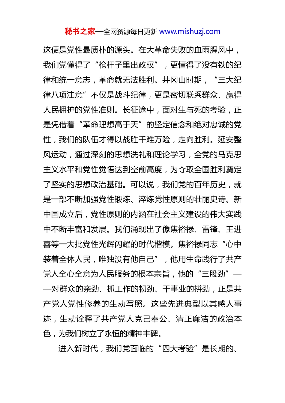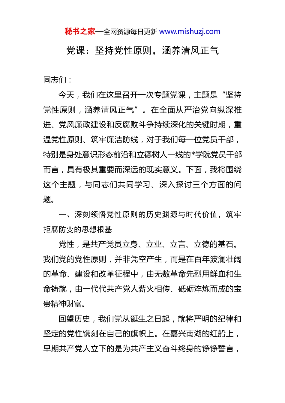 秘书之家—全网资源每日更新 www.mishuzj.com党课:坚持党性原则,涵养清风正气 同志们:今天,我们在这里召开一次专题党课,主题是“坚持党性原则,涵养清风正气”。在全面从严治党向纵深推进、党风廉政建设和反腐败斗争持续深化的关键时期,重温党性原则、筑牢廉洁防线,对于我们每一位党员干部,特别是身处意识形态前沿和立德树人一线的*学院党员干部而言,具有极其重要而深远的现实意义。下面,我将围绕这个主题,与同志们共同学习、深入探讨三个方面的问题。一、深刻领悟党性原则的历史渊源与时代价值,筑牢拒腐防变的思想根基党性,是共产党员立身、立业、立言、立德的基石。我们党的党性原则,并非凭空产生,而是在百年波澜壮阔的革命、建设和改革征程中,由无数革命先烈用鲜血和生命铸就,由一代代共产党人薪火相传、砥砺淬炼而成的宝贵精神财富。回望历史,我们党从诞生之日起,就将严明的纪律和坚定的党性镌刻在自己的旗帜上。在嘉兴南湖的红船上,早期共产党人立下的是为共产主义奋斗终身的铮铮誓言,秘书之家—全网资源每日更新 www.mishuzj.com这便是党性最质朴的源头。在大革命失败的血雨腥风中,我们党懂得了“枪杆子里出政权”,更懂得了没有铁的纪律和统一意志,革命就无法胜利。井冈山时期,“三大纪律八项注意”不仅是战斗纪律,更是密切联系群众、赢得人民拥护的党性准则。长征途中,面对生与死的考验,正是凭借着“革命理想高于天”的坚定信念和绝对忠诚的党性,我们的队伍才得以战胜千难万险,走向胜利。延安整风运动,通过深刻的思想洗礼和理论学习,全党的马克思主义水平和党性觉悟达到空前高度,为夺取全国胜利奠定了坚实的思想政治基础。可以说,我们党的百年历史,就是一部不断加强党性锻炼、淬炼党性原则的壮丽史诗。新中国成立后,党性原则的内涵在社会主义建设的伟大实践中不断丰富和发展。我们涌现出了像焦裕禄、雷锋、王进喜等一大批党性光辉闪耀的时代楷模。焦裕禄同志“心中装着全体人民,唯独没有他自己”,他用生命践行了共产党人全心全意为人民服务的根本宗旨,他的“三股劲”——对群众的亲劲、抓工作的韧劲、干事业的拼劲,正是共产党人党性修养的生动写照。这些先进典型以其感人事迹,生动诠释了共产党人克己奉公、清正廉洁的政治本色,为我们树立了永恒的精神丰碑。进入新时代,我们党面临的“四大考验”是长期的、秘书之家—全网资源每日更新 www.mishuzj.com复杂的,“四种危险”是尖锐的、严峻的。习近平总书记反复强调,“党性是党员干部立身、立业、立言、立德的基石”。在新的历史条件下,党性原则被赋予了新的时代内涵。它要求我们在风云变幻的国际格局中保持政治定力,在深化改革的攻坚期敢于担当,在各种错误思潮的冲击下明辨是非,在形形色色的诱惑面前守住底线。我们所处的*学院,作为学习、研究、宣传马克思主义的主阵地,我们每一位党员教师的党性强不强、作风正不正,不仅关系到个人前途,更直接关系到党的教育事业,关系到培养什么人、怎样培养人、为谁培养人这个根本问题。因此,深刻理解党性原则的历史脉络,准确把握其时代价值,是我们永葆共产党人政治本色、有效抵御各种风险挑战的根本前提。二、准确把握党性原则的基本内涵与实践要求,永葆共产党人的政治本色党性原则内涵丰富,博大精深,但其核心要义在实践中具体体现为几个紧密联系的方面。作为新时代的党员干部,我们必须准确把握并自觉践行。(一)对党忠诚是党性原则的政治灵魂天下至德,莫大于忠。对党忠诚,是共产党人首要的政治品质。这种忠诚,不是空洞的口号,而是具体的、实践的。首先,它体秘书之家—全网资源每日更新 www.mishuzj.com现在思想上的绝对忠诚。就是要坚定对马克思主义的信仰,对中国特色社会主义的信念,对实现中华民族伟大复兴的信心。要深入学习贯彻习近平新时代中国特色社会主义思想,真正做到学思用贯通、知信行统一,不断增强“四个意识”、坚定“四个自信”、做到“两个维护”。作为*学院的教师,我们不仅要自己真学、真懂、真信,更要理直气壮地讲授好党的创新理论,引导青年学生树立正确的历史观、民族观、国家观、文化观...