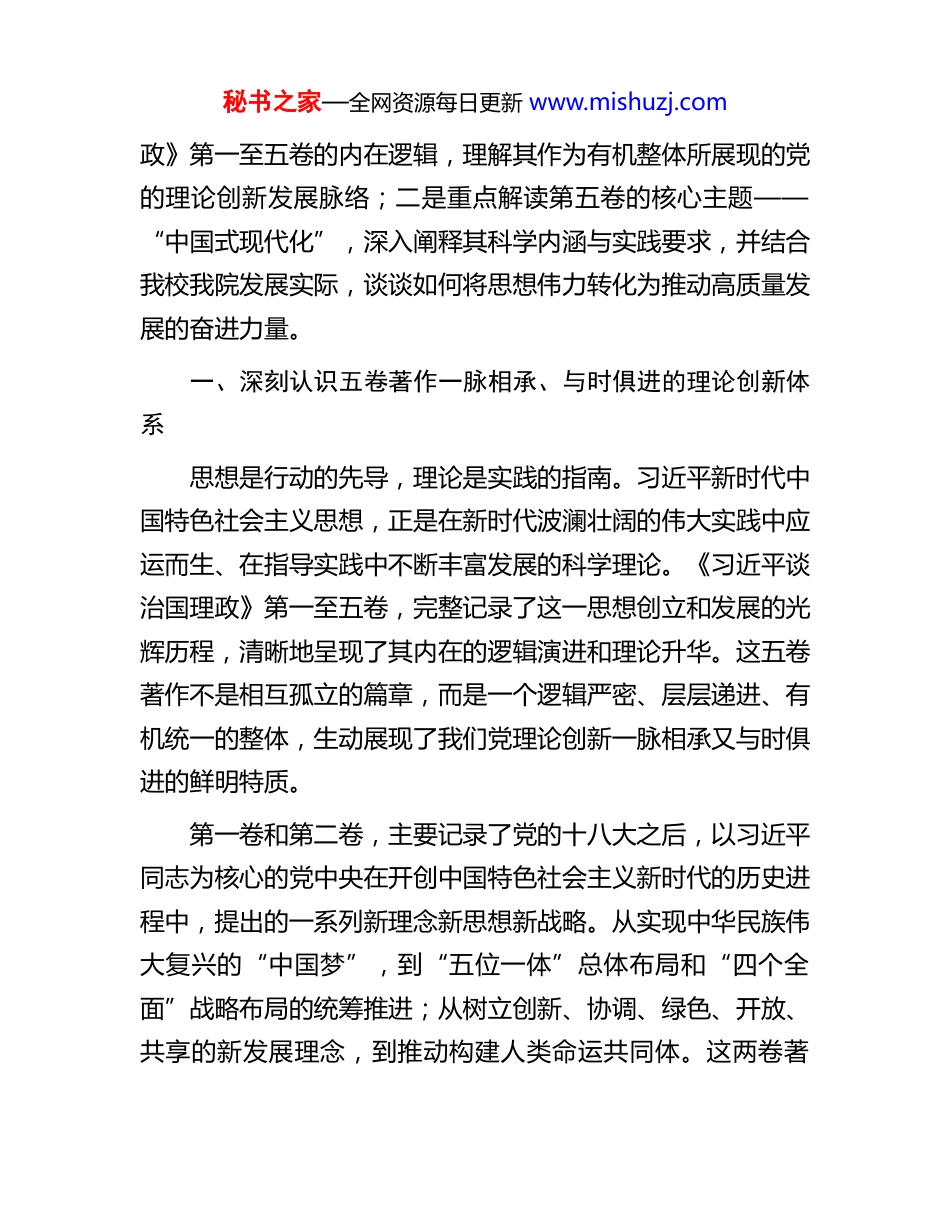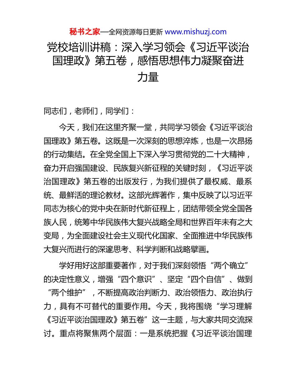 秘书之家—全网资源每日更新 www.mishuzj.com党校培训讲稿:深入学习领会《习近平谈治国理政》第五卷,感悟思想伟力凝聚奋进力量同志们,老师们,同学们:今天,我们在这里齐聚一堂,共同学习领会《习近平谈治国理政》第五卷。这既是一次深刻的思想淬炼,也是一次昂扬的行动集结。在全党全国上下深入学习贯彻党的二十大精神,奋力开启强国建设、民族复兴新征程的关键时刻,《习近平谈治国理政》第五卷的出版发行,为我们提供了最权威、最系统、最鲜活的理论教材。这部光辉著作,集中反映了以习近平同志为核心的党中央在新时代新征程上,团结带领全党全国各族人民,统筹中华民族伟大复兴战略全局和世界百年未有之大变局,为全面建设社会主义现代化国家、全面推进中华民族伟大复兴而进行的深邃思考、科学判断和战略擘画。学好用好这部重要著作,对于我们深刻领悟“两个确立”的决定性意义,增强“四个意识”、坚定“四个自信”、做到“两个维护”,不断提高政治判断力、政治领悟力、政治执行力,具有不可替代的重要作用。今天,我将围绕“学习理解《习近平谈治国理政》第五卷”这一主题,与大家共同交流探讨。重点将聚焦两个层面:一是系统把握《习近平谈治国理秘书之家—全网资源每日更新 www.mishuzj.com政》第一至五卷的内在逻辑,理解其作为有机整体所展现的党的理论创新发展脉络;二是重点解读第五卷的核心主题——“中国式现代化”,深入阐释其科学内涵与实践要求,并结合我校我院发展实际,谈谈如何将思想伟力转化为推动高质量发展的奋进力量。一、深刻认识五卷著作一脉相承、与时俱进的理论创新体系思想是行动的先导,理论是实践的指南。习近平新时代中国特色社会主义思想,正是在新时代波澜壮阔的伟大实践中应运而生、在指导实践中不断丰富发展的科学理论。《习近平谈治国理政》第一至五卷,完整记录了这一思想创立和发展的光辉历程,清晰地呈现了其内在的逻辑演进和理论升华。这五卷著作不是相互孤立的篇章,而是一个逻辑严密、层层递进、有机统一的整体,生动展现了我们党理论创新一脉相承又与时俱进的鲜明特质。第一卷和第二卷,主要记录了党的十八大之后,以习近平同志为核心的党中央在开创中国特色社会主义新时代的历史进程中,提出的一系列新理念新思想新战略。从实现中华民族伟大复兴的“中国梦”,到“五位一体”总体布局和“四个全面”战略布局的统筹推进;从树立创新、协调、绿色、开放、共享的新发展理念,到推动构建人类命运共同体。这两卷著秘书之家—全网资源每日更新 www.mishuzj.com作,为习近平新时代中国特色社会主义思想的创立,提供了坚实的实践基础和理论准备,完成了宏大叙事的开篇布局。第三卷,则聚焦党的十九大到十九届五中全会这一关键时期。面对国内外风险挑战明显上升的复杂局面,我们党团结带领人民,决胜全面建成小康社会取得决定性成就,开启全面建设社会主义现代化国家新征程。这一卷深刻回答了新时代坚持和发展什么样的中国特色社会主义、怎样坚持和发展中国特色社会主义的重大时代课题,标志着习近平新时代中国特色社会主义思想的系统形成和主要内容的确立。第四卷,时间节点是 2020 年 2 月至 2022 年 4 月。面对世界百年未有之大变局和世纪疫情交织叠加的严峻考验,党中央审时度势,明确提出进入新发展阶段、贯彻新发展理念、构建新发展格局的战略抉择。这一卷集中展现了我们党有效统筹疫情防控和经济社会发展,引领中国号巨轮在惊涛骇浪中行稳致远的非凡智慧和卓越领导力,进一步丰富和发展了党的创新理论。而我们今天学习的第五卷,收录的是习近平总书记在党的二十大前后,即 2022 年 10 月至 2024 年 4 月期间的重要著作。这一时期,我们胜利召开了党的二十大,擘画了全面建设社会主义现代化国家、以中国式现代化全面推进中华民族伟大复兴的宏伟蓝图。因此,第五卷最鲜明的主题,就是“中国式秘书之家—全网资源每日更新 www.mishuzj.com现代化”。它不仅是对前四卷思想理论的延续和深化,更是站在新的历史起点上,对“强国建设、民族复兴”这一中心任务的全面部署和系统阐发,是习近平新时代中国特色社会主义...