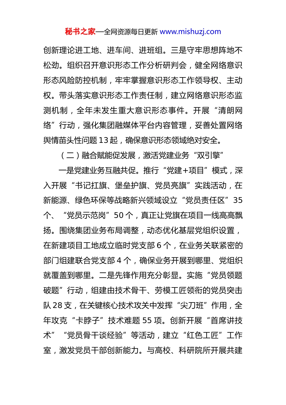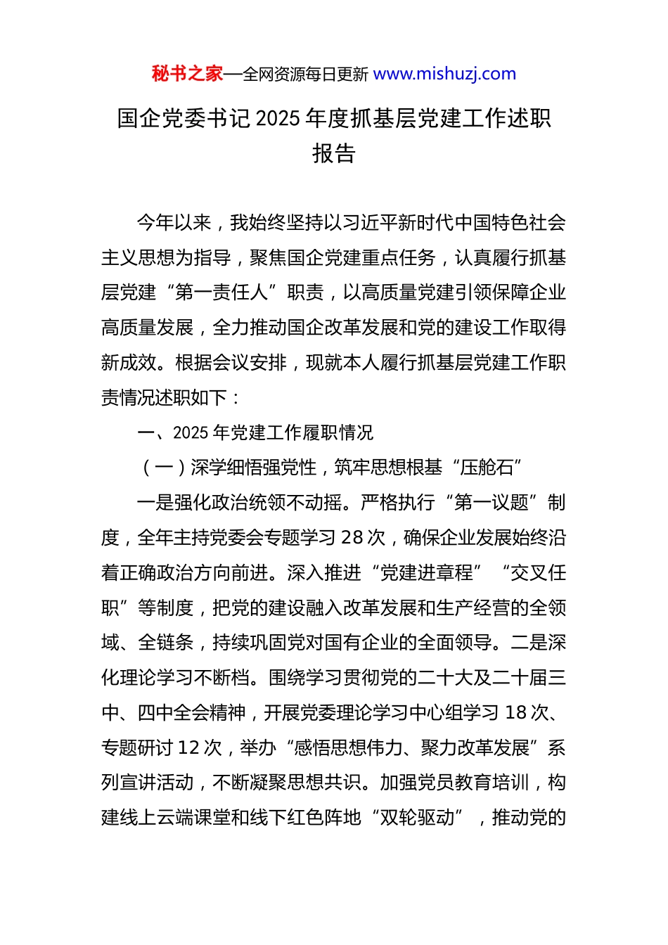 秘书之家—全网资源每日更新 www.mishuzj.com国企党委书记 2025 年度抓基层党建工作述职报告 今年以来,我始终坚持以习近平新时代中国特色社会主义思想为指导,聚焦国企党建重点任务,认真履行抓基层党建“第一责任人”职责,以高质量党建引领保障企业高质量发展,全力推动国企改革发展和党的建设工作取得新成效。根据会议安排,现就本人履行抓基层党建工作职责情况述职如下:一、2025 年党建工作履职情况(一)深学细悟强党性,筑牢思想根基“压舱石”一是强化政治统领不动摇。严格执行“第一议题”制度,全年主持党委会专题学习 28 次,确保企业发展始终沿着正确政治方向前进。深入推进“党建进章程”“交叉任职”等制度,把党的建设融入改革发展和生产经营的全领域、全链条,持续巩固党对国有企业的全面领导。二是深化理论学习不断档。围绕学习贯彻党的二十大及二十届三中、四中全会精神,开展党委理论学习中心组学习 18 次、专题研讨 12 次,举办“感悟思想伟力、聚力改革发展”系列宣讲活动,不断凝聚思想共识。加强党员教育培训,构建线上云端课堂和线下红色阵地“双轮驱动”,推动党的秘书之家—全网资源每日更新 www.mishuzj.com创新理论进工地、进车间、进班组。三是守牢思想阵地不松劲。组织召开意识形态工作分析研判会,健全网络意识形态风险防控机制,牢牢掌握意识形态工作领导权、主动权。带头落实意识形态工作责任制,建立网络意识形态监测机制,全年未发生重大意识形态事件。开展“清朗网络”行动,强化集团融媒体平台内容管理,妥善处置网络舆情苗头性问题 13 起,确保意识形态领域绝对安全。(二)融合赋能促发展,激活党建业务“双引擎”一是党建业务互融共促。推行“党建+项目”模式,深入开展“书记扛旗、堡垒护旗、党员亮旗”实践活动,在新能源、绿色环保等战略新兴领域设立“党员责任区”35个、“党员示范岗”50 个,真正让党旗在项目一线高高飘扬。围绕集团业务布局调整,动态优化基层党组织设置,在新建项目工地成立临时党支部 6 个,在业务关联紧密的部门组建联合党支部 4 个,确保业务开展到哪里、党组织就覆盖到哪里。二是先锋作用充分彰显。实施“党员领题破题”行动,组建由技术骨干、劳模工匠领衔的党员突击队 28 支,在关键核心技术攻关中发挥“尖刀班”作用,全年攻克“卡脖子”技术难题 55 项。创新开展“首席讲技术”“党员骨干谈经验”等活动,建立“红色工匠”工作室,激发党员干部创新能力。与高校、科研院所开展共建秘书之家—全网资源每日更新 www.mishuzj.com活动,合作开展技术攻关项目 12 项,党员牵头申报专利126 项。三是人才效能持续释放。深化“三项制度”改革,实施“育鹰计划”,加大年轻干部选拔力度,新提拔35 岁以下管理人员占比达 40%。招录本科及以上学历毕业生 226 名,柔性引进院士 1 名,高层次人才 23 名。完善党建与业务融合评价体系,将党建考核结果与领导班子和领导干部年度考核、经营业绩考核挂钩,权重提升至30%。开展“党员创新创效”金点子活动,收集合理化建议 358 条,采纳实施 125 条,创造经济效益约 2000 万元。(三)强基固本夯基础,建强战斗堡垒“主阵地”一是聚焦强基固本。积极开展党支部标准化规范化建设“全面达标”行动,实施“清单化管理—项目化推进—常态化督导—标准化考核”的责任落实机制,推动 31 项党建责任清单落实到位。制定《混合所有制企业党的建设工作指导意见》,明确混改企业党组织设置标准、权责边界和运行流程,推动混改企业党组织应建尽建。建立党组织按期换届提醒督促机制,年内完成 8 个任期届满党组织换届选举。二是突出品牌引路。深入开展“一企业一特色、一支部一品牌”创建活动,构建 1 个“红链赋能”主品牌和 15 个子品牌的“1+15”党建品牌矩阵,1 个案例获评全秘书之家—全网资源每日更新 www.mishuzj.com国国企党建创新案例。开展“三最一优”评选,评选出优秀党建品牌 28 个,形成了一批叫得响、立得住的特色党建品牌。三是强化分类指导。实施党务干部“能力提升计划”,开展党务干部综合素质提升培训 6 期...