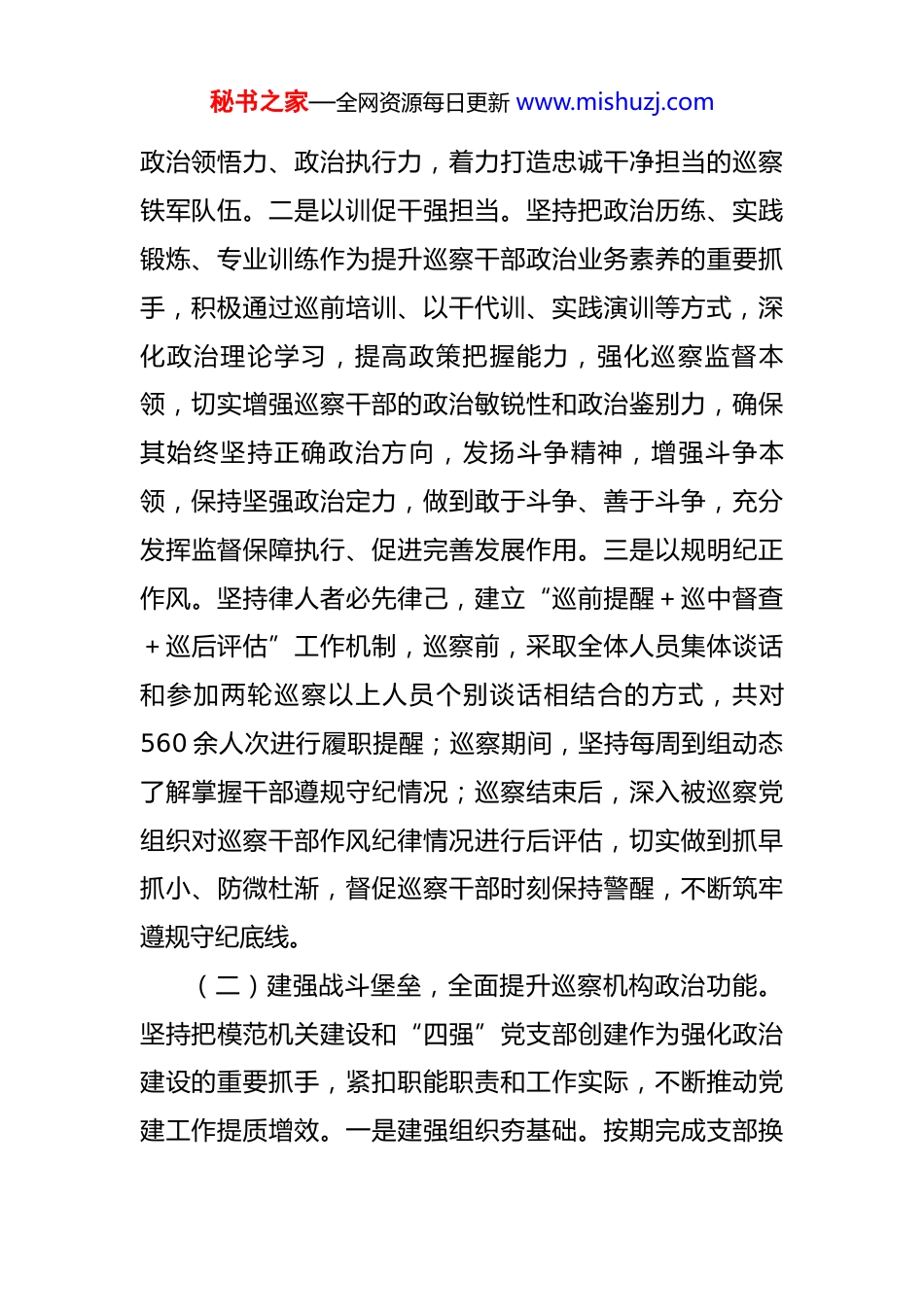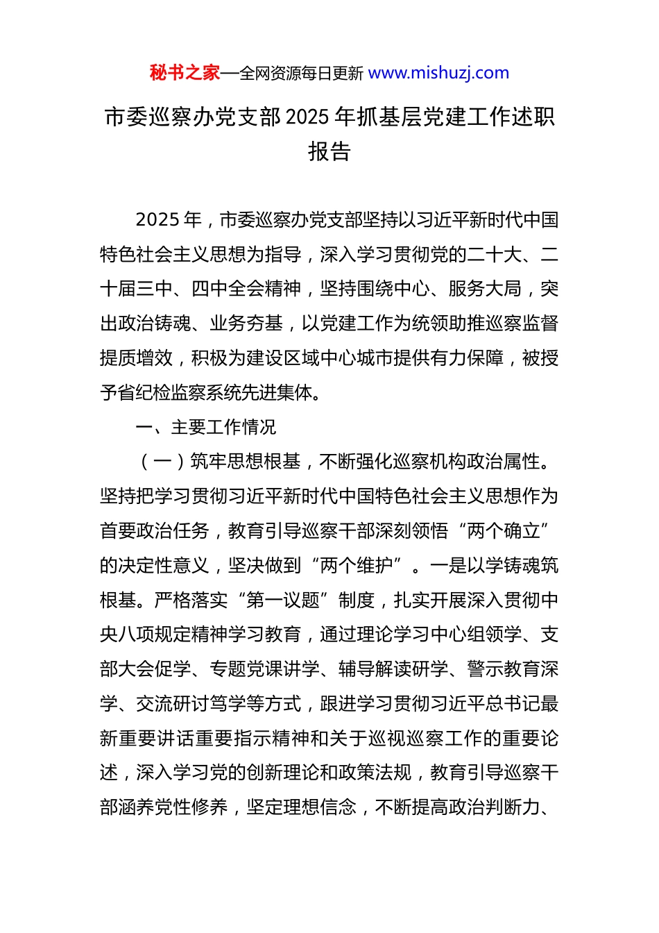 秘书之家—全网资源每日更新 www.mishuzj.com市委巡察办党支部 2025 年抓基层党建工作述职报告 2025 年,市委巡察办党支部坚持以习近平新时代中国特色社会主义思想为指导,深入学习贯彻党的二十大、二十届三中、四中全会精神,坚持围绕中心、服务大局,突出政治铸魂、业务夯基,以党建工作为统领助推巡察监督提质增效,积极为建设区域中心城市提供有力保障,被授予省纪检监察系统先进集体。一、主要工作情况(一)筑牢思想根基,不断强化巡察机构政治属性。坚持把学习贯彻习近平新时代中国特色社会主义思想作为首要政治任务,教育引导巡察干部深刻领悟“两个确立”的决定性意义,坚决做到“两个维护”。一是以学铸魂筑根基。严格落实“第一议题”制度,扎实开展深入贯彻中央八项规定精神学习教育,通过理论学习中心组领学、支部大会促学、专题党课讲学、辅导解读研学、警示教育深学、交流研讨笃学等方式,跟进学习贯彻习近平总书记最新重要讲话重要指示精神和关于巡视巡察工作的重要论述,深入学习党的创新理论和政策法规,教育引导巡察干部涵养党性修养,坚定理想信念,不断提高政治判断力、秘书之家—全网资源每日更新 www.mishuzj.com政治领悟力、政治执行力,着力打造忠诚干净担当的巡察铁军队伍。二是以训促干强担当。坚持把政治历练、实践锻炼、专业训练作为提升巡察干部政治业务素养的重要抓手,积极通过巡前培训、以干代训、实践演训等方式,深化政治理论学习,提高政策把握能力,强化巡察监督本领,切实增强巡察干部的政治敏锐性和政治鉴别力,确保其始终坚持正确政治方向,发扬斗争精神,增强斗争本领,保持坚强政治定力,做到敢于斗争、善于斗争,充分发挥监督保障执行、促进完善发展作用。三是以规明纪正作风。坚持律人者必先律己,建立“巡前提醒+巡中督查+巡后评估”工作机制,巡察前,采取全体人员集体谈话和参加两轮巡察以上人员个别谈话相结合的方式,共对560 余人次进行履职提醒;巡察期间,坚持每周到组动态了解掌握干部遵规守纪情况;巡察结束后,深入被巡察党组织对巡察干部作风纪律情况进行后评估,切实做到抓早抓小、防微杜渐,督促巡察干部时刻保持警醒,不断筑牢遵规守纪底线。(二)建强战斗堡垒,全面提升巡察机构政治功能。坚持把模范机关建设和“四强”党支部创建作为强化政治建设的重要抓手,紧扣职能职责和工作实际,不断推动党建工作提质增效。一是建强组织夯基础。按期完成支部换秘书之家—全网资源每日更新 www.mishuzj.com届工作,选优配强支部班子,强化支委会职能作用发挥;坚持把支部建在组上,统筹巡察办党支部、巡察组临时党支部全体党员干部,同步开展理论学习、加强实践锻炼,持续擦亮“锻造巡察利剑、服务保障发展”品牌;制定《关于丰富党员过“政治生日”活动的工作举措》,通过赠送政治生日贺卡、回忆入党初心等形式,增强党员干部归属感。二是健全制度促规范。把依规依纪依法落实到巡察工作全流程、各环节,严格按照党章党规党纪、巡视工作条例以及各项党内法规开展工作,先后制定修订《关于加强市县巡察上下联动推动巡察工作高质量发展的意见》《巡察报告问题底稿管理办法》《市委巡察信访受理工作暂行办法》《巡察反馈意见整改落实程序规定》等 50 余项制度,基本做到了重要工作有章可循、重点环节有据可依,为推动巡察工作高质量发展提供了有力保障。三是配强队伍增活力。注重发挥巡察岗位“熔炉”作用,出台《关于抽调优秀年轻干部到巡察岗位锻炼的工作办法(试行)》,按照“专兼结合、精干高效”原则,组织市直各单位共推荐县处级干部 24 名、优秀年轻干部 216 名纳入巡察人才库,实行抽调干部年度考核单列政策,市委巡察办连续两年对抽调参加巡察两轮以上的干部进行年度考核,9 名干部被确定为“优秀”等次,进一步激发抽调干部秘书之家—全网资源每日更新 www.mishuzj.com参与巡察工作的热情。(三)深化结合融合,充分彰显巡察政治保障作用。始终将党建工作和巡察工作同谋划、同部署、同推进,坚持围绕中心、服务大局,紧盯权力和责任,紧盯一把手和“关键少数”,紧盯群众反映强烈的突出问题,深化政...