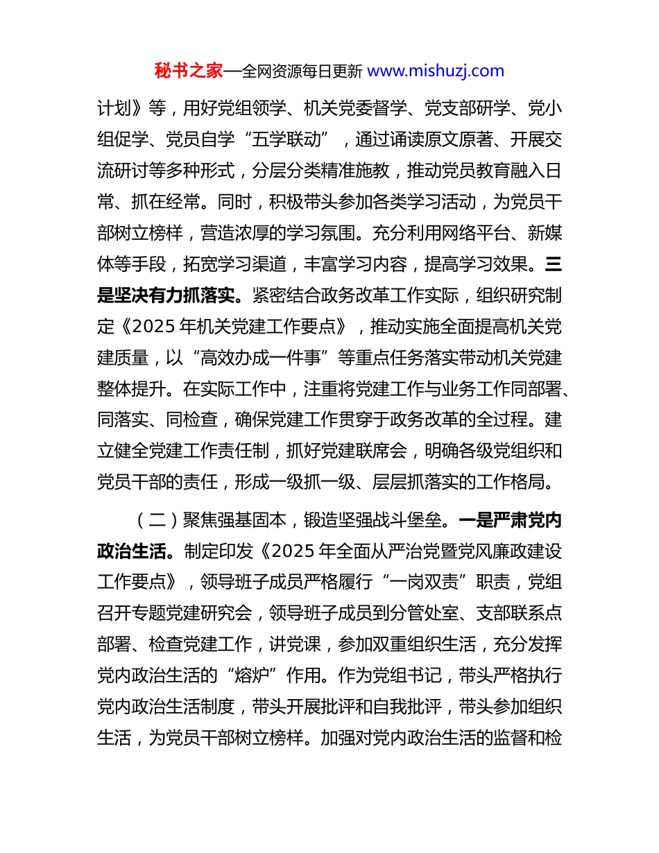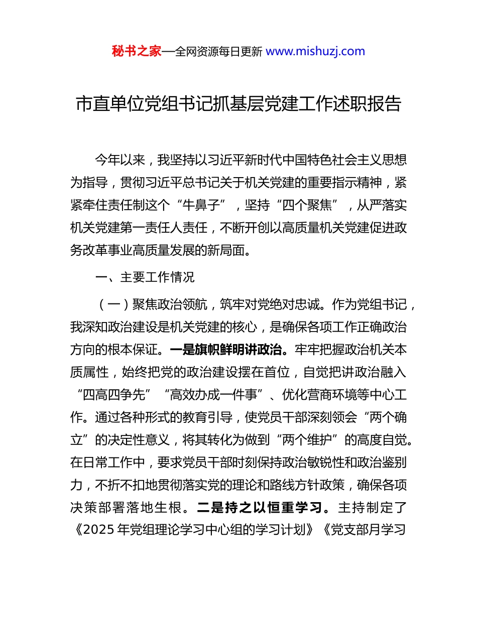秘书之家—全网资源每日更新 www.mishuzj.com市直单位党组书记抓基层党建工作述职报告今年以来,我坚持以习近平新时代中国特色社会主义思想为指导,贯彻习近平总书记关于机关党建的重要指示精神,紧紧牵住责任制这个“牛鼻子”,坚持“四个聚焦”,从严落实机关党建第一责任人责任,不断开创以高质量机关党建促进政务改革事业高质量发展的新局面。一、主要工作情况(一)聚焦政治领航,筑牢对党绝对忠诚。作为党组书记,我深知政治建设是机关党建的核心,是确保各项工作正确政治方向的根本保证。一是旗帜鲜明讲政治。牢牢把握政治机关本质属性,始终把党的政治建设摆在首位,自觉把讲政治融入“四高四争先”“高效办成一件事”、优化营商环境等中心工作。通过各种形式的教育引导,使党员干部深刻领会“两个确立”的决定性意义,将其转化为做到“两个维护”的高度自觉。在日常工作中,要求党员干部时刻保持政治敏锐性和政治鉴别力,不折不扣地贯彻落实党的理论和路线方针政策,确保各项决策部署落地生根。 二是持之以恒重学习。 主持制定了《2025 年党组理论学习中心组的学习计划》《党支部月学习秘书之家—全网资源每日更新 www.mishuzj.com计划》等,用好党组领学、机关党委督学、党支部研学、党小组促学、党员自学“五学联动”,通过诵读原文原著、开展交流研讨等多种形式,分层分类精准施教,推动党员教育融入日常、抓在经常。同时,积极带头参加各类学习活动,为党员干部树立榜样,营造浓厚的学习氛围。充分利用网络平台、新媒体等手段,拓宽学习渠道,丰富学习内容,提高学习效果。三是坚决有力抓落实。紧密结合政务改革工作实际,组织研究制定《2025 年机关党建工作要点》,推动实施全面提高机关党建质量,以“高效办成一件事”等重点任务落实带动机关党建整体提升。在实际工作中,注重将党建工作与业务工作同部署、同落实、同检查,确保党建工作贯穿于政务改革的全过程。建立健全党建工作责任制,抓好党建联席会,明确各级党组织和党员干部的责任,形成一级抓一级、层层抓落实的工作格局。(二)聚焦强基固本,锻造坚强战斗堡垒。一是严肃党内政治生活。制定印发《2025 年全面从严治党暨党风廉政建设工作要点》,领导班子成员严格履行“一岗双责”职责,党组召开专题党建研究会,领导班子成员到分管处室、支部联系点部署、检查党建工作,讲党课,参加双重组织生活,充分发挥党内政治生活的“熔炉”作用。作为党组书记,带头严格执行党内政治生活制度,带头开展批评和自我批评,带头参加组织生活,为党员干部树立榜样。加强对党内政治生活的监督和检秘书之家—全网资源每日更新 www.mishuzj.com查,确保各项制度落到实处。二是全面推进“四强”党支部建设。严格落实党支部标准化规范化建设要求,夯实月考核、季星级评定工作机制,严格落实“三会一课”等组织生活制度。常态化组织开展 32 家政务服务窗口单位练兵比武、“我陪群众走流程”、政务服务礼仪标准培训等活动,深化“最多跑一次”改革,切实放大机关党建对外展示“窗口”效应,不断激发党建工作活力。政务大厅先后获得“青年文明号”“文明窗口单位”“方志文化教育基地”、政务服务“先进单位”等荣誉。推进“四强”党支部建设过程中,注重加强党支部书记的培训和指导,提高综合素质和工作能力,充分发挥党支部的战斗堡垒作用。三是加强党员干部教育管理监督。发挥“支部管到人头”的作用,把管行为和管思想、管住“八小时内”和管好“八小时外”贯通起来,加强常态化思想教育和针对性谈心谈话,引导党员干部从政治上想问题、作判断。定期与党员干部开展谈心谈话,了解思想动态和工作生活情况,及时发现问题并加以解决。建立健全党员干部教育管理监督制度,加强对党员干部的日常管理和监督,确保始终沿着正确的方向前进。(三)聚焦中心大局,推动党建业务深度融合。一是扎实开展“书记项目”。作为局党组书记,深入调研“人工智能+政务服务”场景应用工作,破解政务服务“流程繁、跑腿多、效率低”难题,亲自参与“书记项目”选题立项、实施,创新秘书之家—全网资源每日更新 www.mishuzj.com引入 xx...