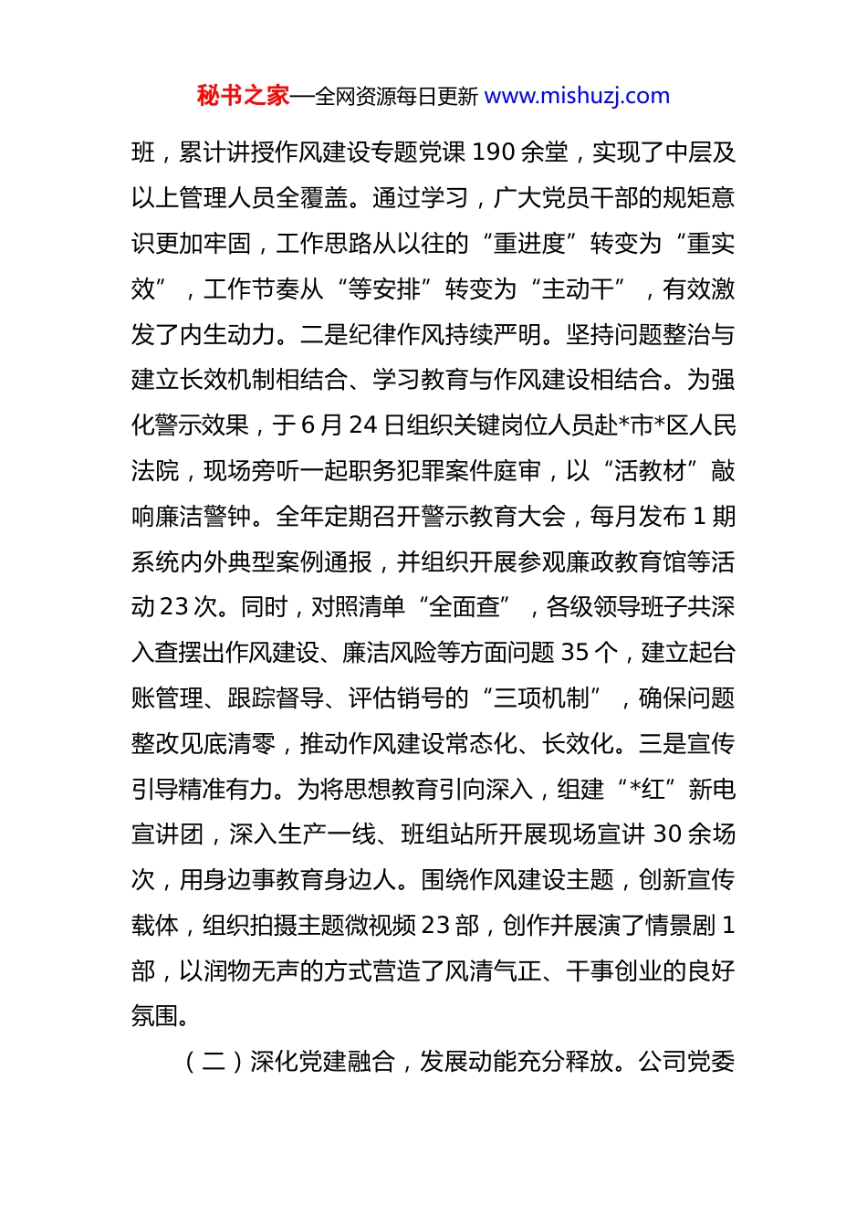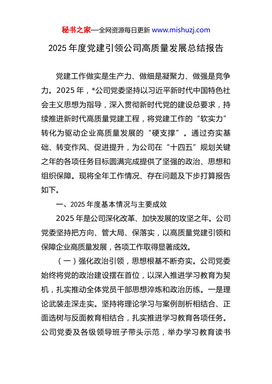 秘书之家—全网资源每日更新 www.mishuzj.com2025 年度党建引领公司高质量发展总结报告 党建工作做实是生产力、做细是凝聚力、做强是竞争力。2025 年,*公司党委坚持以习近平新时代中国特色社会主义思想为指导,深入贯彻新时代党的建设总要求,持续推进新时代高质量党建工程,将党建工作的“软实力”转化为驱动企业高质量发展的“硬支撑”。通过夯实基础、转变作风、促进提升,为公司在“十四五”规划关键之年的各项任务目标圆满完成提供了坚强的政治、思想和组织保障。现将全年工作情况、存在问题及下步打算报告如下。一、2025 年度基本情况与主要成效2025 年是公司深化改革、加快发展的攻坚之年。公司党委坚持把方向、管大局、保落实,以高质量党建引领和保障企业高质量发展,各项工作取得显著成效。(一)强化政治引领,思想根基不断夯实。公司党委始终将党的政治建设摆在首位,以深入推进学习教育为契机,扎实推动全体党员干部思想淬炼和政治历练。一是理论武装走深走实。坚持将理论学习与案例剖析相结合、正面选树与反面教育相结合,扎实推进学习教育各项任务。公司党委及各级领导班子带头示范,举办学习教育读书秘书之家—全网资源每日更新 www.mishuzj.com班,累计讲授作风建设专题党课 190 余堂,实现了中层及以上管理人员全覆盖。通过学习,广大党员干部的规矩意识更加牢固,工作思路从以往的“重进度”转变为“重实效”,工作节奏从“等安排”转变为“主动干”,有效激发了内生动力。二是纪律作风持续严明。坚持问题整治与建立长效机制相结合、学习教育与作风建设相结合。为强化警示效果,于 6 月 24 日组织关键岗位人员赴*市*区人民法院,现场旁听一起职务犯罪案件庭审,以“活教材”敲响廉洁警钟。全年定期召开警示教育大会,每月发布 1 期系统内外典型案例通报,并组织开展参观廉政教育馆等活动 23 次。同时,对照清单“全面查”,各级领导班子共深入查摆出作风建设、廉洁风险等方面问题 35 个,建立起台账管理、跟踪督导、评估销号的“三项机制”,确保问题整改见底清零,推动作风建设常态化、长效化。三是宣传引导精准有力。为将思想教育引向深入,组建“*红”新电宣讲团,深入生产一线、班组站所开展现场宣讲 30 余场次,用身边事教育身边人。围绕作风建设主题,创新宣传载体,组织拍摄主题微视频 23 部,创作并展演了情景剧 1部,以润物无声的方式营造了风清气正、干事创业的良好氛围。(二)深化党建融合,发展动能充分释放。公司党委秘书之家—全网资源每日更新 www.mishuzj.com坚持党建工作与中心工作同谋划、同部署、同考核,以“党建+”工程为抓手,将党组织的政治优势、组织优势转化为攻坚克难、推动发展的强大动能,取得了丰硕成果。一是在保障电网安全运行上取得新突破。牢牢守住“五杜绝、五不发生”的安全生产底线,深化无违章党支部、党员安全示范岗创建活动。通过设立党员责任区、党员突击队,在迎峰度夏、防汛抗台等关键时期发挥了中坚力量。截至 2025 年 10 月,公司 220 千伏输电线路实现了连续34 个月“零跳闸”的优异成绩,创造了公司电网安全运行的历史新纪录。二是在服务地方经济发展上展现新作为。聚焦全市 646 个“三个一批”和“省市重点”项目,建立了由党员骨干牵头的全流程跟踪服务体系,提供“主动对接、主动走访、主动保障”的“三主动”服务,确保重点项目早用电、快用电。相关典型经验获得*省发展和改革委员会官网刊发推介,赢得了社会各界的广泛赞誉。在服务乡村振兴战略中,高质量开展“*农谷”电网专题规划,组织共产党员服务队深入田间地头,打通电力服务“最后一公里”,全力保障了全市 2.1 万个农灌机井台区“电通压稳”,有力地支持了*省农业强省建设,特色做法被*省委《工作交流》刊发推广。三是在推动科技创新攻关上实现新跨越。坚持党建引领科技创新,将党支部建在项目上,秘书之家—全网资源每日更新 www.mishuzj.com把党员先锋岗设在研发最前沿。由公司牵头承担的国家重点研发计划项目“高比例可再生能源配用电系统电能质量智能感知与协同控制技术”,于 9 月 6 日以优秀成绩...