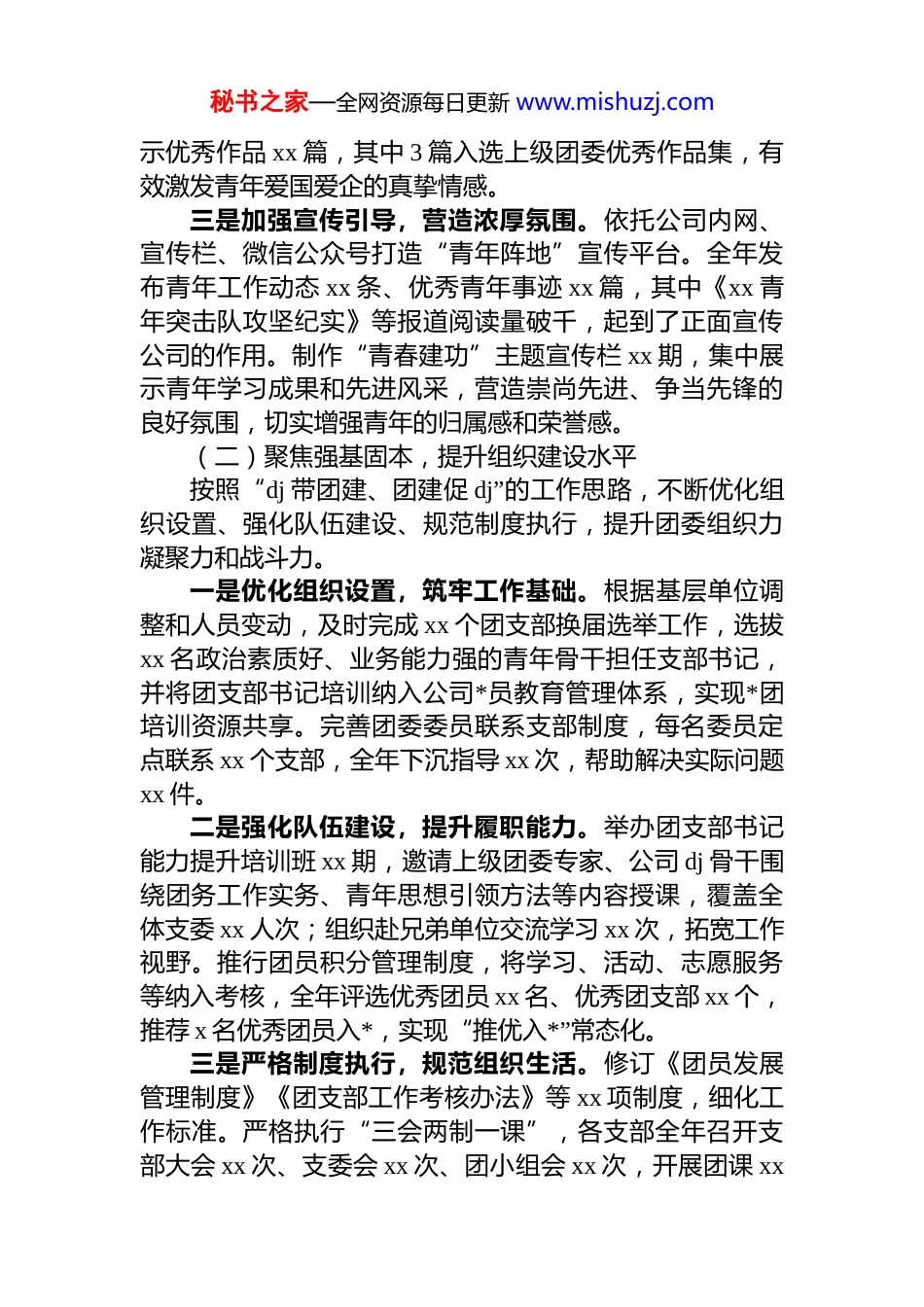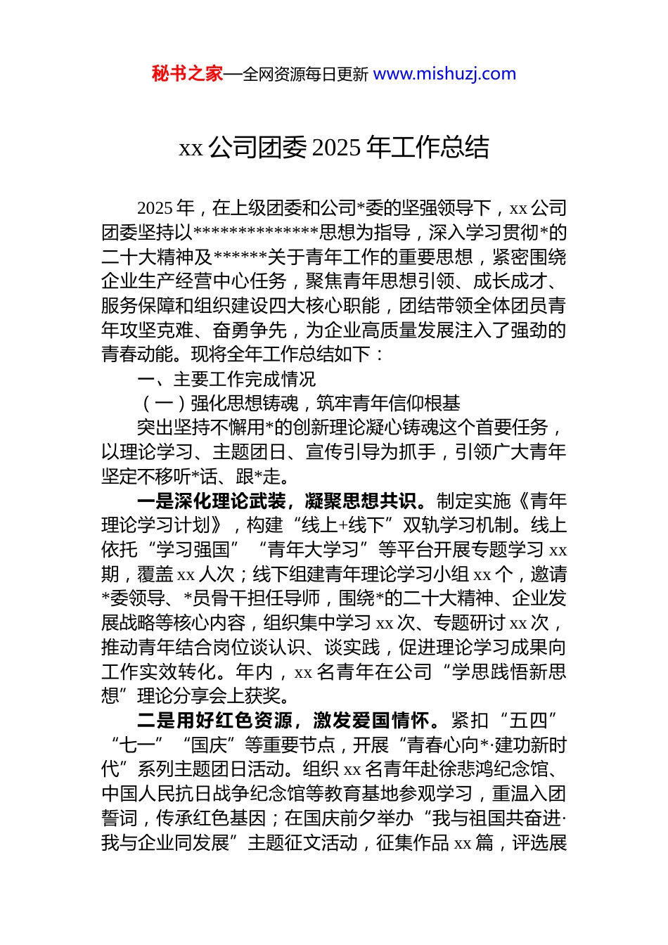秘书之家—全网资源每日更新 www.mishuzj.comxx 公司团委 2025 年工作总结2025 年,在上级团委和公司*委的坚强领导下,xx 公司团委坚持以**************思想为指导,深入学习贯彻*的二十大精神及******关于青年工作的重要思想,紧密围绕企业生产经营中心任务,聚焦青年思想引领、成长成才、服务保障和组织建设四大核心职能,团结带领全体团员青年攻坚克难、奋勇争先,为企业高质量发展注入了强劲的青春动能。现将全年工作总结如下:一、主要工作完成情况(一)强化思想铸魂,筑牢青年信仰根基突出坚持不懈用*的创新理论凝心铸魂这个首要任务,以理论学习、主题团日、宣传引导为抓手,引领广大青年坚定不移听*话、跟*走。一是深化理论武装,凝聚思想共识。制定实施《青年理论学习计划》,构建“线上+线下”双轨学习机制。线上依托“学习强国”“青年大学习”等平台开展专题学习 xx期,覆盖 xx 人次;线下组建青年理论学习小组 xx 个,邀请*委领导、*员骨干担任导师,围绕*的二十大精神、企业发展战略等核心内容,组织集中学习 xx 次、专题研讨 xx 次,推动青年结合岗位谈认识、谈实践,促进理论学习成果向工作实效转化。年内,xx 名青年在公司“学思践悟新思想”理论分享会上获奖。二是用好红色资源,激发爱国情怀。紧扣“五四”“七一”“国庆”等重要节点,开展“青春心向*·建功新时代”系列主题团日活动。组织 xx 名青年赴徐悲鸿纪念馆、中国人民抗日战争纪念馆等教育基地参观学习,重温入团誓词,传承红色基因;在国庆前夕举办“我与祖国共奋进·我与企业同发展”主题征文活动,征集作品 xx 篇,评选展秘书之家—全网资源每日更新 www.mishuzj.com示优秀作品 xx 篇,其中 3 篇入选上级团委优秀作品集,有效激发青年爱国爱企的真挚情感。三是加强宣传引导,营造浓厚氛围。依托公司内网、宣传栏、微信公众号打造“青年阵地”宣传平台。全年发布青年工作动态 xx 条、优秀青年事迹 xx 篇,其中《xx 青年突击队攻坚纪实》等报道阅读量破千,起到了正面宣传公司的作用。制作“青春建功”主题宣传栏 xx 期,集中展示青年学习成果和先进风采,营造崇尚先进、争当先锋的良好氛围,切实增强青年的归属感和荣誉感。(二)聚焦强基固本,提升组织建设水平按照“dj 带团建、团建促 dj”的工作思路,不断优化组织设置、强化队伍建设、规范制度执行,提升团委组织力凝聚力和战斗力。一是优化组织设置,筑牢工作基础。根据基层单位调整和人员变动,及时完成 xx 个团支部换届选举工作,选拔xx 名政治素质好、业务能力强的青年骨干担任支部书记,并将团支部书记培训纳入公司*员教育管理体系,实现*团培训资源共享。完善团委委员联系支部制度,每名委员定点联系 xx 个支部,全年下沉指导 xx 次,帮助解决实际问题xx 件。二是强化队伍建设,提升履职能力。举办团支部书记能力提升培训班 xx 期,邀请上级团委专家、公司 dj 骨干围绕团务工作实务、青年思想引领方法等内容授课,覆盖全体支委 xx 人次;组织赴兄弟单位交流学习 xx 次,拓宽工作视野。推行团员积分管理制度,将学习、活动、志愿服务等纳入考核,全年评选优秀团员 xx 名、优秀团支部 xx 个,推荐 x 名优秀团员入*,实现“推优入*”常态化。三是严格制度执行,规范组织生活。修订《团员发展管理制度》《团支部工作考核办法》等 xx 项制度,细化工作标准。严格执行“三会两制一课”,各支部全年召开支部大会 xx 次、支委会 xx 次、团小组会 xx 次,开展团课 xx秘书之家—全网资源每日更新 www.mishuzj.com次、组织生活会 xx 次。规范团员日常管理,高效完成 xx 人次组织关系转接,更新完善团员信息库。严格执行团费收缴和预算上报制度,确保财务管理的规范性和透明度,为团支部的健康发展提供了可靠的财务保障。(三)服务中心大局,彰显青年担当作为围绕公司生产经营、改革发展重点任务,搭建青年建功立业平台,引导青年在关键岗位挑重担、在重点任务中显作为,以实际行动践行青春使命。一是开展岗位建功,助力提质增效。深入开展“青年岗位能手”“青年突击队”...