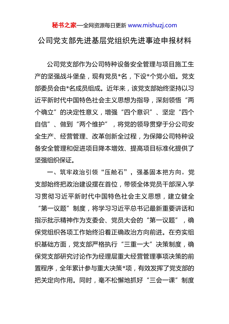 秘书之家—全网资源每日更新 www.mishuzj.com公司党支部先进基层党组织先进事迹申报材料 公司党支部作为公司特种设备安全管理与项目施工生产的坚强战斗堡垒,现有党员*名,下设*个党小组。党支部委员会由*名成员组成。近年来,该党支部始终坚持以习近平新时代中国特色社会主义思想为指导,深刻领悟“两个确立”的决定性意义,增强“四个意识”、坚定“四个自信”、做到“两个维护”,将党的领导贯穿于分公司安全生产、经营管理、改革创新全过程,为保障公司特种设备安全管理和促进项目降本增效、提高项目标准化提供了坚强组织保证。一、筑牢政治引领“压舱石”,强基固本把方向。党支部始终把政治建设摆在首位,带领全体党员干部深入学习贯彻习近平新时代中国特色社会主义思想,建立健全“第一议题”制度,将学习习近平总书记最新重要讲话和指示批示精神作为支委会、党员大会的“第一议题”,确保党组织各项工作始终沿着正确政治方向前进。在夯实组织基础方面,党支部严格执行“三重一大”决策制度,确保党支部研究讨论作为经理层重大经营管理事项决策的前置程序,全年累计参与重大决策*项,有效发挥了党支部的把关定向作用。同时,毫不松懈地抓好“三会一课”制度秘书之家—全网资源每日更新 www.mishuzj.com的落实,支部党员大会、支委会、党小组会按期召开率均达到*,党课教育注重质量,改变了“一人念、大家听”的传统模式,采取了研讨式、互动式、调研式等多种方法,增强了学习的吸引力和实效性。每月集中进行理论学习雷打不动,并围绕特定主题组织红色主题教育、党史故事分享会等主题党日活动,使党员教育管理更加从严从实,有效避免了政治学习“灯下黑”的问题。二、打造党建融合“助推器”,围绕中心促生产。党支部创新实践“党建+”模式,以“党建+基础提升”、“党建+安全质量”、“党建+施工生产”为具体抓手,深入实施基层“七抓七强七提升”工程,推动党建工作与分公司中心工作同频共振、深度融合。在“党建+安全质量”方面,党支部借鉴“党员责任区”和“党员示范岗”的有效做法,结合分公司特种设备管理风险高、项目施工标准严的特点,划分了党员安全责任区,组织党员带头排查安全隐患、攻克质量难关。例如,在*重点项目建设期间,由党员技术骨干组成的突击队,成功解决了*技术难题,为项目降本增效约*万元,有力提升了项目标准化水平。在促进生产经营方面,党支部将完成急难险重任务作为检验党组织战斗力的试金石。面对繁重的生产任务,党支部组织党员在施工一线亮身份、践承诺、当先锋,例如在*工程项目秘书之家—全网资源每日更新 www.mishuzj.com中,党员们带头加班加点,确保了工期如期完成,发挥了“一个党员就是一面旗帜”的先锋模范作用。通过党建引领,分公司在特种设备安全管理方面持续保持良好记录,项目成本得到有效控制,标准化建设水平显著提升。三、拧紧作风建设“安全阀”,激浊扬清树正气。党支部深刻认识到,作风建设永远在路上。为此,党支部始终坚持严的基调,常态化开展“会前一刻钟警示教育”活动,利用支部大会、支委会等会议开始前的短暂时间,组织学习违纪违法典型案例通报、观看警示教育片,教育引导党员干部加强党性锻炼、坚定理想信念,切实筑牢拒腐防变的思想防线。党支部认真落实党风廉政建设责任制,支部书记切实履行第一责任人职责,班子成员落实“一岗双责”。通过组织开展廉洁承诺、廉政谈话、参观廉政教育基地等活动,不断强化党员干部的纪律规矩意识。同时,注重营造风清气正的良好氛围,党支部关心关爱党员职工,积极为员工排忧解难,增强了队伍的凝聚力和向心力。这种严管与厚爱相结合的方式,使得分公司内部形成了干事创业、廉洁从业的良好政治生态。回顾过去的工作,机械设备分公司党支部在政治引领、党建融合、作风建设等方面取得了一定的成绩,但距离上级的要求和群众的期望还有提升空间。面向未来,党秘书之家—全网资源每日更新 www.mishuzj.com支部将继续高举习近平新时代中国特色社会主义思想伟大旗帜,持续巩固深化已有成果,补短板、强弱项,推动基层党组织建设全面进步、全面过硬。他们将以此次申报市级先进...