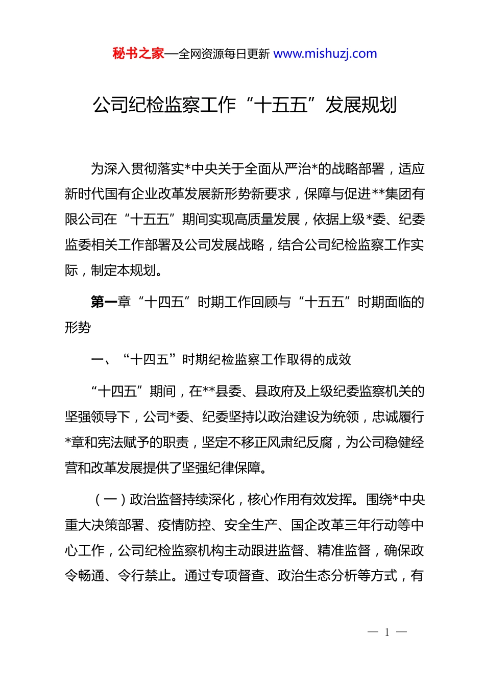 秘书之家—全网资源每日更新 www.mishuzj.com公司纪检监察工作“十五五”发展规划为深入贯彻落实*中央关于全面从严治*的战略部署,适应新时代国有企业改革发展新形势新要求,保障与促进**集团有限公司在“十五五”期间实现高质量发展,依据上级*委、纪委监委相关工作部署及公司发展战略,结合公司纪检监察工作实际,制定本规划。第一章“十四五”时期工作回顾与“十五五”时期面临的形势一、“十四五”时期纪检监察工作取得的成效“十四五”期间,在**县委、县政府及上级纪委监察机关的坚强领导下,公司*委、纪委坚持以政治建设为统领,忠诚履行*章和宪法赋予的职责,坚定不移正风肃纪反腐,为公司稳健经营和改革发展提供了坚强纪律保障。(一)政治监督持续深化,核心作用有效发挥。围绕*中央重大决策部署、疫情防控、安全生产、国企改革三年行动等中心工作,公司纪检监察机构主动跟进监督、精准监督,确保政令畅通、令行禁止。通过专项督查、政治生态分析等方式,有— 1 —秘书之家—全网资源每日更新 www.mishuzj.com力推动了公司*委主体责任和“一岗双责”的落实。(二)反腐败斗争成果巩固,高压态势始终保持。坚持无禁区、全覆盖、零容忍,聚焦工程建设、物资采购、投融资、资产处置等重点领域和关键环节,严肃查处了一批违纪违法案件,一体推进“不敢腐、不能腐、不想腐”体制机制建设。执纪审查调查的规范化、法治化水平得到提升,惩治腐败的震慑效应与标本兼治的综合效应日益显现。(三)作风建设纵深推进,发展环境不断优化。严格落实纪律规定及其要求,对“四风”问题露头就打、寸步不让。通过常态化监督检查、节假日廉洁提醒、通报曝光典型案例等方式,享乐主义、奢靡之风得到有效遏制,形式主义、官僚主义问题得到一定程度整治,风清气正的干事创业氛围更加浓厚。(四)监督体系逐步完善,监督合力初步形成。公司纪检监察机构积极探索构建系统集成、协同高效的“大监督”格局,推动纪检监察监督与监事会监督、审计监督、财务监督、群众监督等贯通协调。对下属子公司的监督指导力度有所加强,监督探头向基层延伸,初步实现了对权力运行的全过程、各环节监督。— 2 —秘书之家—全网资源每日更新 www.mishuzj.com(五)队伍建设得到加强,履职能力有所提升。按照“三转”要求,公司纪检监察机构的职责定位更加聚焦主责主业。通过选优配强干部、组织业务培训、参与上级纪委跟班学习等方式,纪检监察干部的政治素质和专业化能力得到提升,队伍的凝聚力和战斗力进一步增强。二、“十四五”时期存在的问题与不足对照新时代全面从严治*的新要求和公司高质量发展的现实需要,公司纪检监察工作仍存在一些短板和弱项,亟待在“十五五”期间加以解决。(一)监督的精准性和有效性仍需提升。对“一把手”和领导班子等“关键少数”的监督仍存在难点,日常监督、谈心谈话的“辣味”不足。对新型腐败、隐性腐败的发现和甄别能力有待加强,监督方式有时较为传统,对资本运作、混合所有制改革等新业务形态的廉洁风险预判和防控能力不足。(二)体制机制的系统性与协同性有待完善。纪检监察机构的独立性和权威性需进一步强化,在实际工作中,尤其是在查办案件时,仍可能受到来自同级领导或人情关系的干扰。各类监督力量的贯通协同机制尚不健全,信息共享、线索移交、— 3 —秘书之家—全网资源每日更新 www.mishuzj.com成果运用的壁垒依然存在,监督合力未能完全形成。(三)队伍的专业化水平与力量配备尚有差距。纪检监察人员数量不足、结构不尽合理的问题依然存在,部分子公司纪检力量薄弱,存在兼职现象,难以满足日益繁重的监督执纪问责任务需要。干部队伍的法律、金融、审计、信息化等专业知识储备与公司业务快速发展的匹配度不高。(四)“不想腐”的长效机制建设仍需深化。廉洁文化建设的系统性、渗透性不足,警示教育的针对性和感染力有待提高。思想道德和*性教育的成果,转化为*员干部廉洁从业的自觉行动尚有差距,重惩处、轻教育的现象在一定范围内存在。三、“十五五”时期面临的机遇与挑战“十五五”时期是公司加快转型升级、实现高质量发展的关键五年,也是公司...