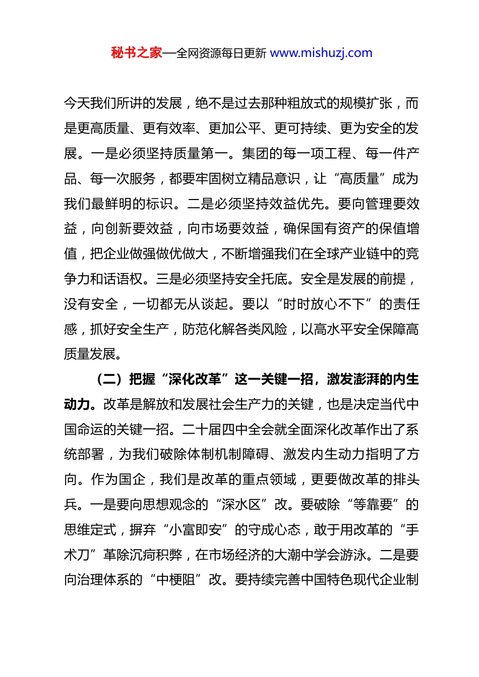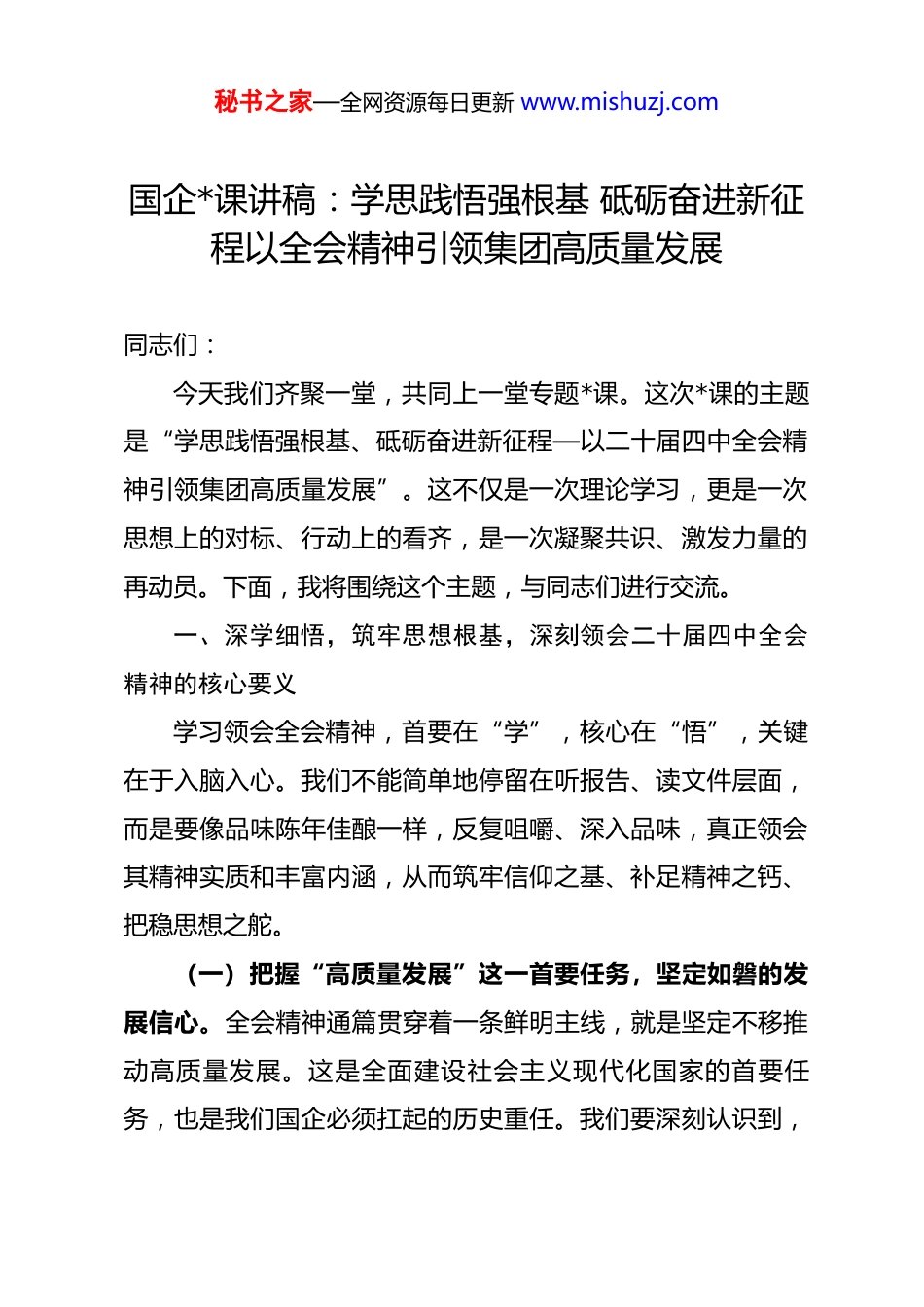 秘书之家—全网资源每日更新 www.mishuzj.com国企*课讲稿:学思践悟强根基 砥砺奋进新征程以全会精神引领集团高质量发展同志们:今天我们齐聚一堂,共同上一堂专题*课。这次*课的主题是“学思践悟强根基、砥砺奋进新征程—以二十届四中全会精神引领集团高质量发展”。这不仅是一次理论学习,更是一次思想上的对标、行动上的看齐,是一次凝聚共识、激发力量的再动员。下面,我将围绕这个主题,与同志们进行交流。一、深学细悟,筑牢思想根基,深刻领会二十届四中全会精神的核心要义学习领会全会精神,首要在“学”,核心在“悟”,关键在于入脑入心。我们不能简单地停留在听报告、读文件层面,而是要像品味陈年佳酿一样,反复咀嚼、深入品味,真正领会其精神实质和丰富内涵,从而筑牢信仰之基、补足精神之钙、把稳思想之舵。(一)把握“高质量发展”这一首要任务,坚定如磐的发展信心。全会精神通篇贯穿着一条鲜明主线,就是坚定不移推动高质量发展。这是全面建设社会主义现代化国家的首要任务,也是我们国企必须扛起的历史重任。我们要深刻认识到,秘书之家—全网资源每日更新 www.mishuzj.com今天我们所讲的发展,绝不是过去那种粗放式的规模扩张,而是更高质量、更有效率、更加公平、更可持续、更为安全的发展。一是必须坚持质量第一。集团的每一项工程、每一件产品、每一次服务,都要牢固树立精品意识,让“高质量”成为我们最鲜明的标识。二是必须坚持效益优先。要向管理要效益,向创新要效益,向市场要效益,确保国有资产的保值增值,把企业做强做优做大,不断增强我们在全球产业链中的竞争力和话语权。三是必须坚持安全托底。安全是发展的前提,没有安全,一切都无从谈起。要以“时时放心不下”的责任感,抓好安全生产,防范化解各类风险,以高水平安全保障高质量发展。(二)把握“深化改革”这一关键一招,激发澎湃的内生动力。改革是解放和发展社会生产力的关键,也是决定当代中国命运的关键一招。二十届四中全会就全面深化改革作出了系统部署,为我们破除体制机制障碍、激发内生动力指明了方向。作为国企,我们是改革的重点领域,更要做改革的排头兵。一是要向思想观念的“深水区”改。要破除“等靠要”的思维定式,摒弃“小富即安”的守成心态,敢于用改革的“手术刀”革除沉疴积弊,在市场经济的大潮中学会游泳。二是要向治理体系的“中梗阻”改。要持续完善中国特色现代企业制秘书之家—全网资源每日更新 www.mishuzj.com度,厘清各治理主体的权责边界,让董事会、经理层、*组织各司其职、各负其责、协调运转,形成科学高效的决策执行监督机制。三是要向激励机制的“活力源”改。要探索建立更加灵活、更具市场竞争力的薪酬分配和激励约束机制,真正让干事者有舞台、有干劲,让担当者有激励、无顾虑,让一大批想干事、能干事、干成事的人才脱颖而出。(三)把握“新质生产力”这一核心引擎,抢占制胜的未来赛道。全会强调,要以科技创新推动产业创新,特别是以颠覆性技术和前沿技术催生新产业、新模式、新动能,发展新质生产力。这为我们传统产业占比依然较大的国企,指明了转型升级的根本路径。我们不能再穿着“旧鞋”走新路。一是思想上要“换道超车”。要深刻理解新质生产力的核心在于创新驱动,必须摆脱对传统要素投入的路径依赖,将科技创新摆在集团发展的核心位置,舍得投入真金白银去搞研发、引人才。二是产业上要“腾笼换鸟”。要主动拥抱数字化、智能化、绿色化的时代浪潮,加快传统产业的改造升级,让老树发新芽;同时,要瞄准国家战略性新兴产业和未来产业,布局新赛道,培育新的增长极。三是人才上要“筑巢引凤”。人才是第一资源。发展新质生产力,归根结底要靠人才。我们要建立开放包容的人才政策,不拘一格用人才,既要培养好我们自己的“土秘书之家—全网资源每日更新 www.mishuzj.com专家”,也要引进来行业的“领军人才”,打造一支结构合理、素质优良的创新人才队伍。(四)把握“人民至上”这一根本立场,彰显温暖的国企担当。“江山就是人民,人民就是江山。”二十届四中全会再次彰显了我们*一以贯之的为民情怀。作为*领导下的国有企业,我...
