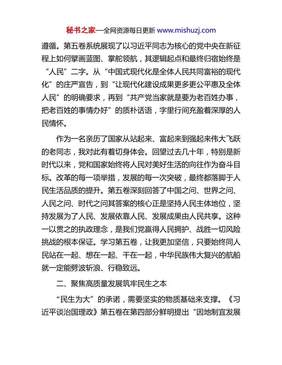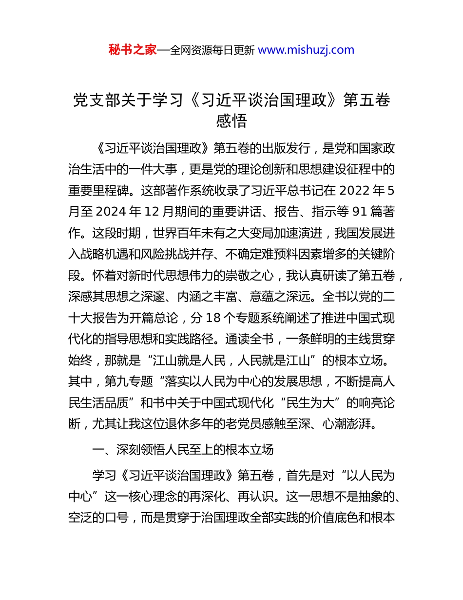秘书之家—全网资源每日更新 www.mishuzj.com党支部关于学习《习近平谈治国理政》第五卷感悟《习近平谈治国理政》第五卷的出版发行,是党和国家政治生活中的一件大事,更是党的理论创新和思想建设征程中的重要里程碑。这部著作系统收录了习近平总书记在 2022 年 5月至 2024 年 12 月期间的重要讲话、报告、指示等 91 篇著作。这段时期,世界百年未有之大变局加速演进,我国发展进入战略机遇和风险挑战并存、不确定难预料因素增多的关键阶段。怀着对新时代思想伟力的崇敬之心,我认真研读了第五卷,深感其思想之深邃、内涵之丰富、意蕴之深远。全书以党的二十大报告为开篇总论,分 18 个专题系统阐述了推进中国式现代化的指导思想和实践路径。通读全书,一条鲜明的主线贯穿始终,那就是“江山就是人民,人民就是江山”的根本立场。其中,第九专题“落实以人民为中心的发展思想,不断提高人民生活品质”和书中关于中国式现代化“民生为大”的响亮论断,尤其让我这位退休多年的老党员感触至深、心潮澎湃。一、深刻领悟人民至上的根本立场学习《习近平谈治国理政》第五卷,首先是对“以人民为中心”这一核心理念的再深化、再认识。这一思想不是抽象的、空泛的口号,而是贯穿于治国理政全部实践的价值底色和根本秘书之家—全网资源每日更新 www.mishuzj.com遵循。第五卷系统展现了以习近平同志为核心的党中央在新征程上如何擘画蓝图、掌舵领航,其逻辑起点和最终归宿始终是“人民”二字。从“中国式现代化是全体人民共同富裕的现代化”的庄严宣告,到“让现代化建设成果更多更公平惠及全体人民”的明确要求,再到“共产党当家就是要为老百姓办事,把老百姓的事情办好”的质朴话语,字里行间充盈着深厚的人民情怀。作为一名亲历了国家从站起来、富起来到强起来伟大飞跃的老同志,我对此有着切身体会。回望过去几十年,特别是新时代以来,党和国家始终将人民对美好生活的向往作为奋斗目标。改革的每一项举措,发展的每一次突破,最终都落脚于人民生活品质的提升。第五卷深刻回答了中国之问、世界之问、人民之问、时代之问其答案的核心正是坚持人民主体地位,坚持发展为了人民、发展依靠人民、发展成果由人民共享。这种一以贯之的执政理念,是我们党赢得人民拥护、战胜一切风险挑战的根本保证。学习第五卷,让我更加坚信,只要始终同人民站在一起、想在一起、干在一起,中华民族伟大复兴的航船就一定能劈波斩浪、行稳致远。二、聚焦高质量发展筑牢民生之本“民生为大”的承诺,需要坚实的物质基础来支撑。《习近平谈治国理政》第五卷在第四部分鲜明提出“因地制宜发展秘书之家—全网资源每日更新 www.mishuzj.com新质生产力,实现高质量发展”,这为在新发展阶段如何筑牢民生之本指明了方向。新质生产力,核心在于以科技创新为主导,实现发展动能的根本转换,其特征是高科技、高效能、高质量。它所追求的,不仅仅是经济总量的增长,更是发展质量和效益的提升,最终目的是为了更好地满足人民日益增长的美好生活需要。2025 年作为“十四五”规划的收官之年,新质生产力的发展浪潮正在神州大地蓬勃兴起。在学习过程中,我特别关注了相关的实践案例。例如,被列为“2025 企业新质生产力标杆案例”的﹡﹡省﹡﹡新材料科技股份有限公司,通过与﹡﹡大学共建实验室,成功研发出光控病虫害可降解农用薄膜。这项技术突破看似专业,但其背后却是一场深刻的“生产方式变革”。它不仅解决了传统地膜造成的“白色污染”问题,保护了绿水青山,更通过科技手段提升了农业生产效率,直接增加了农民收入。这正是新质生产力服务于民生改善的生动写照。从 5G、人工智能赋能智慧城市建设,到新能源技术推动绿色低碳生活,再到生物医药领域的创新突破守护人民健康,新质生产力正在从宏大的国家战略,转化为一个个触手可及的民生福祉。它所带来的,是更高质量的就业岗位、更环保宜居的生活环境、更先进便捷的公共服务。这让我深刻理解到,发展新质生产力与增进民生福祉是内在统一的,高质量发展本身就是最大、最根本的民生工程。秘书之家—全网资源每日更新 www.mishuzj.com三、感受民生温度共...